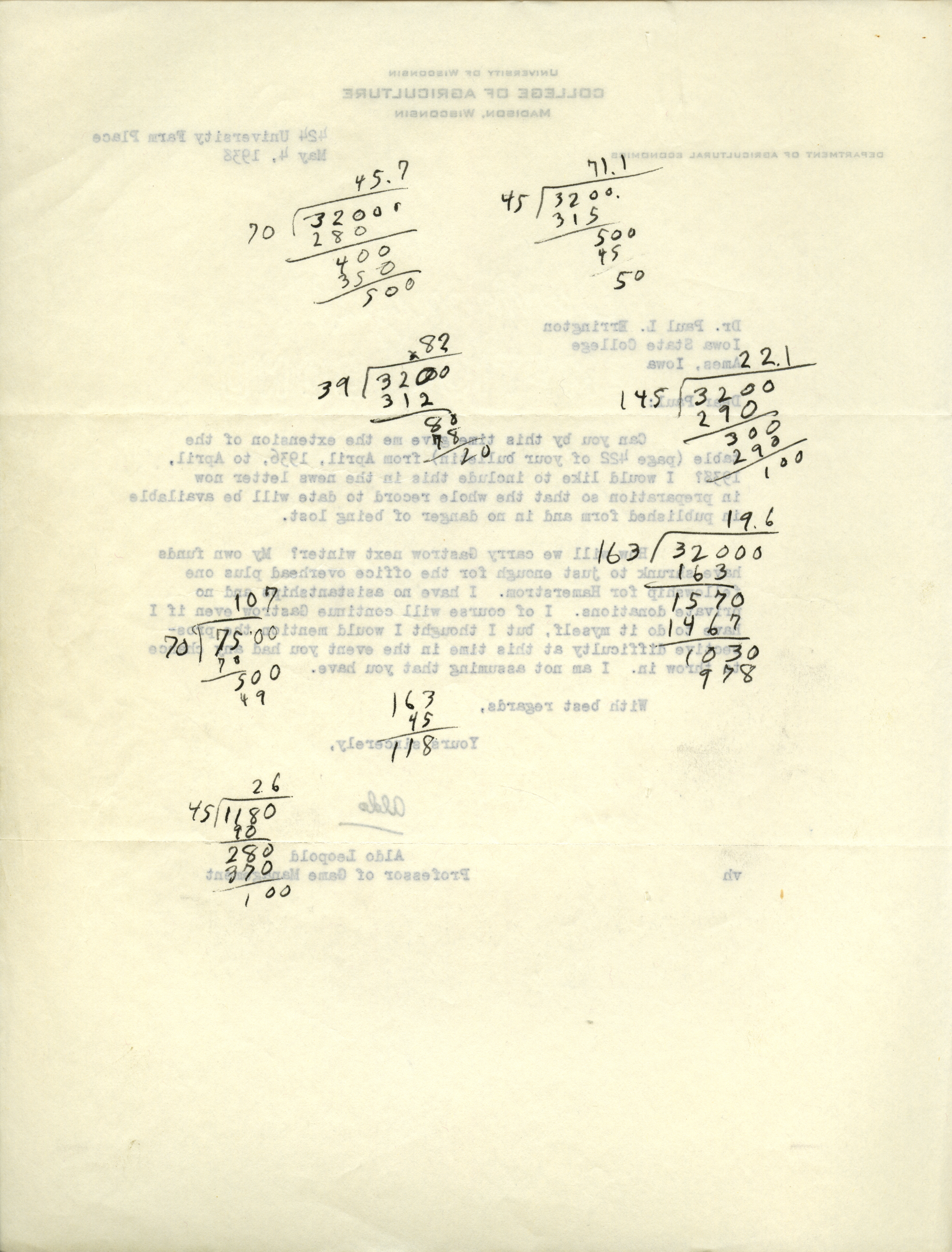 Aldo Leopold letter to Paul Errington, May 4, 1938 Item Info