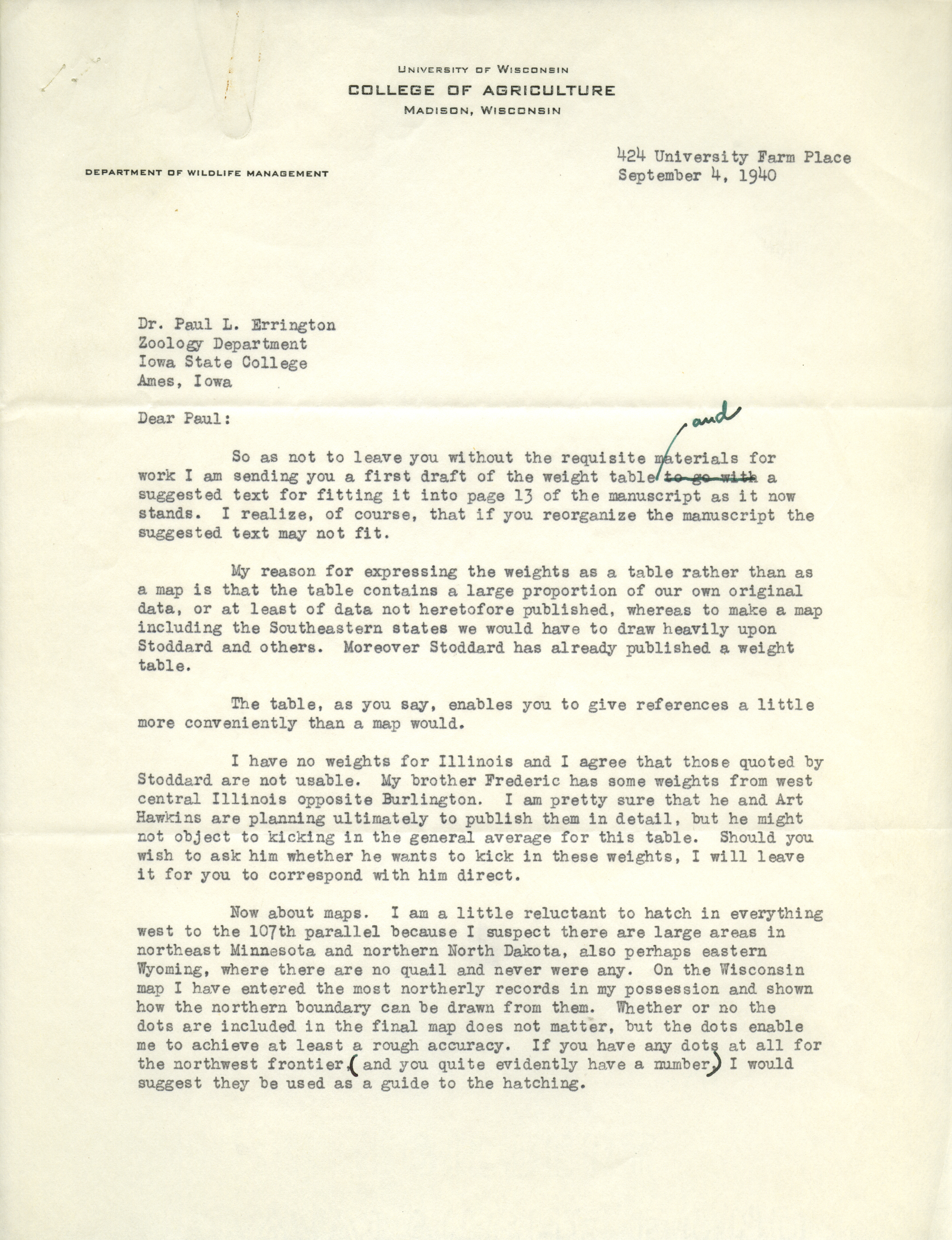 Aldo Leopold letter to Paul Errington, September 4, 1940 Item Info