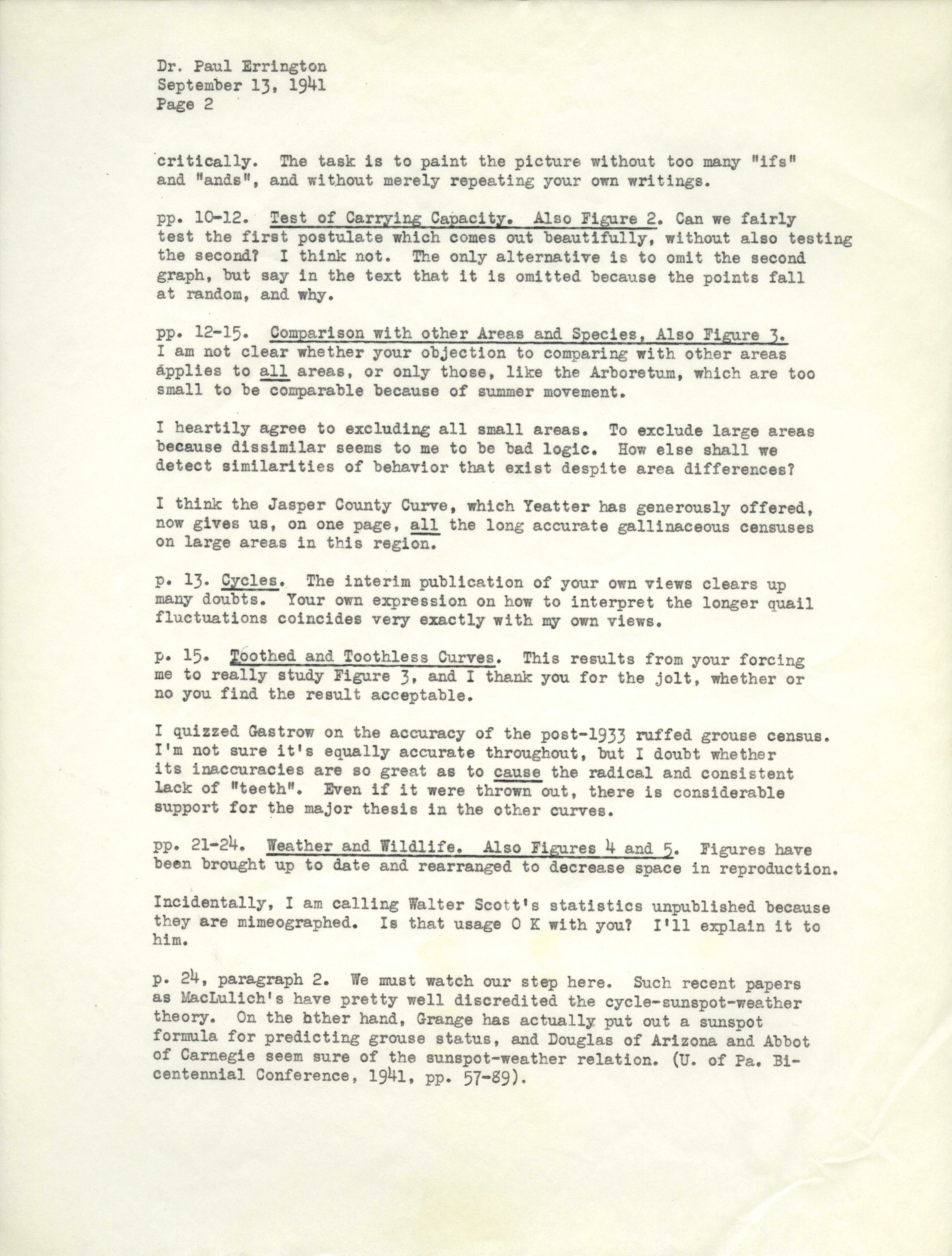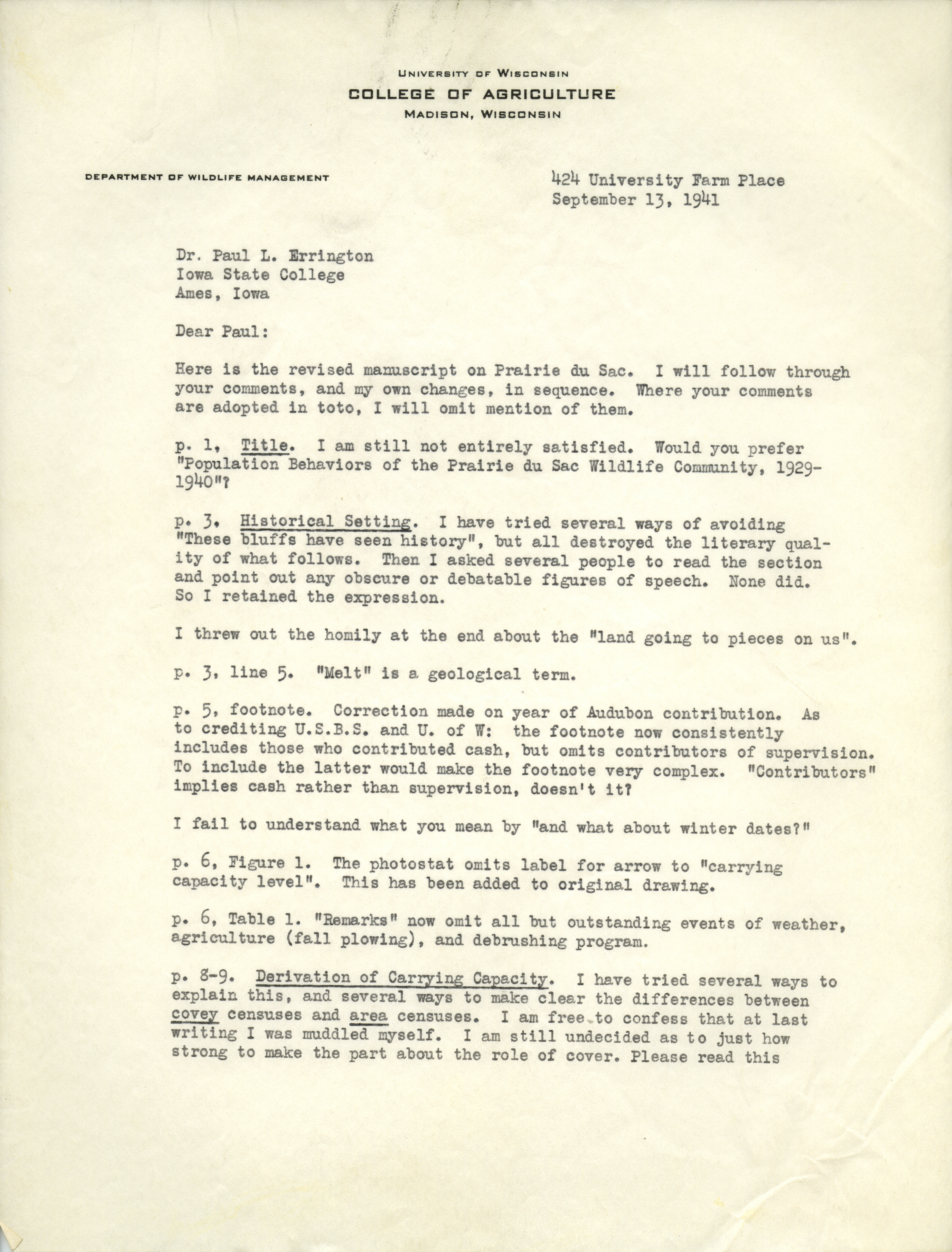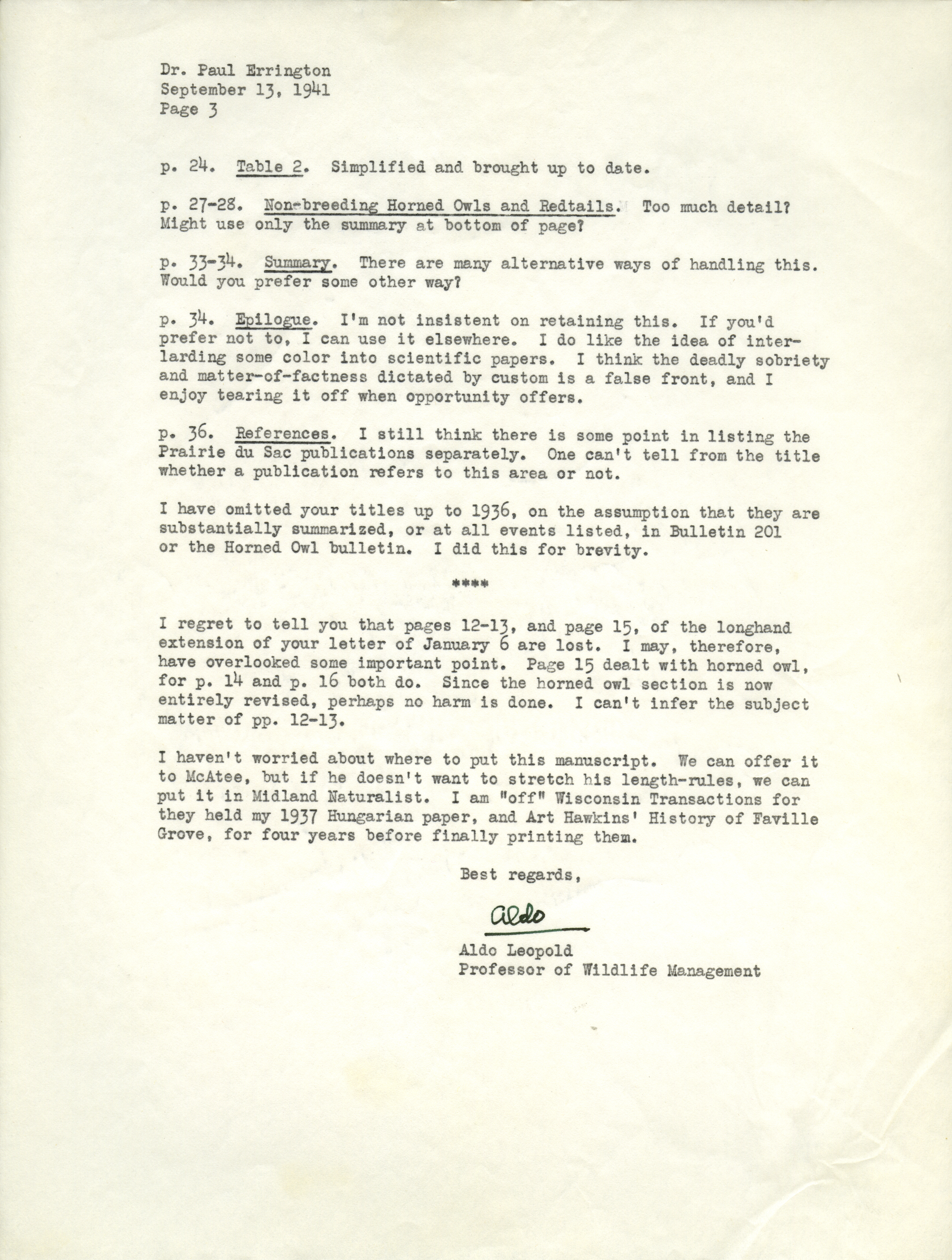 - Aldo Leopold letter to Paul Errington, September 13, 1941