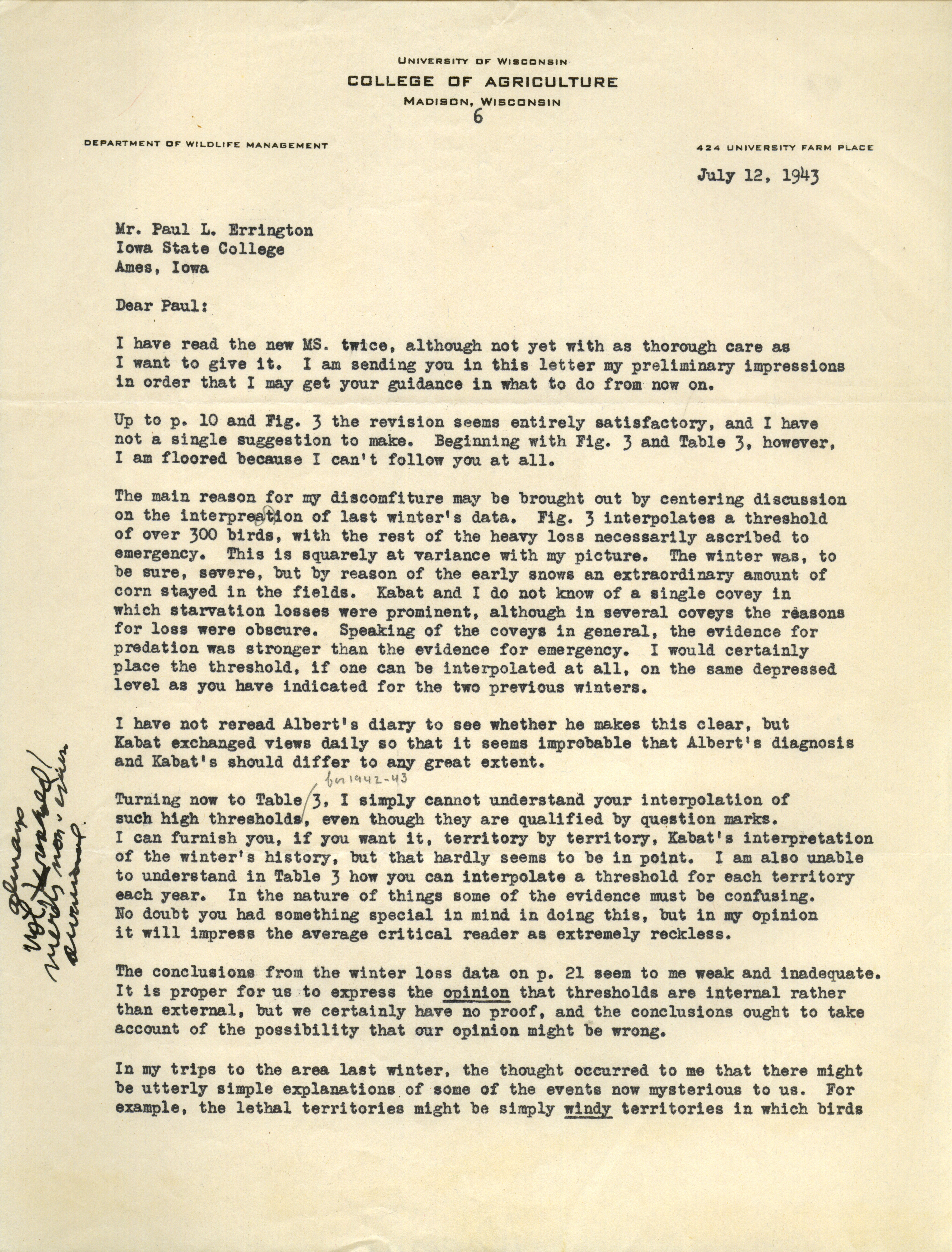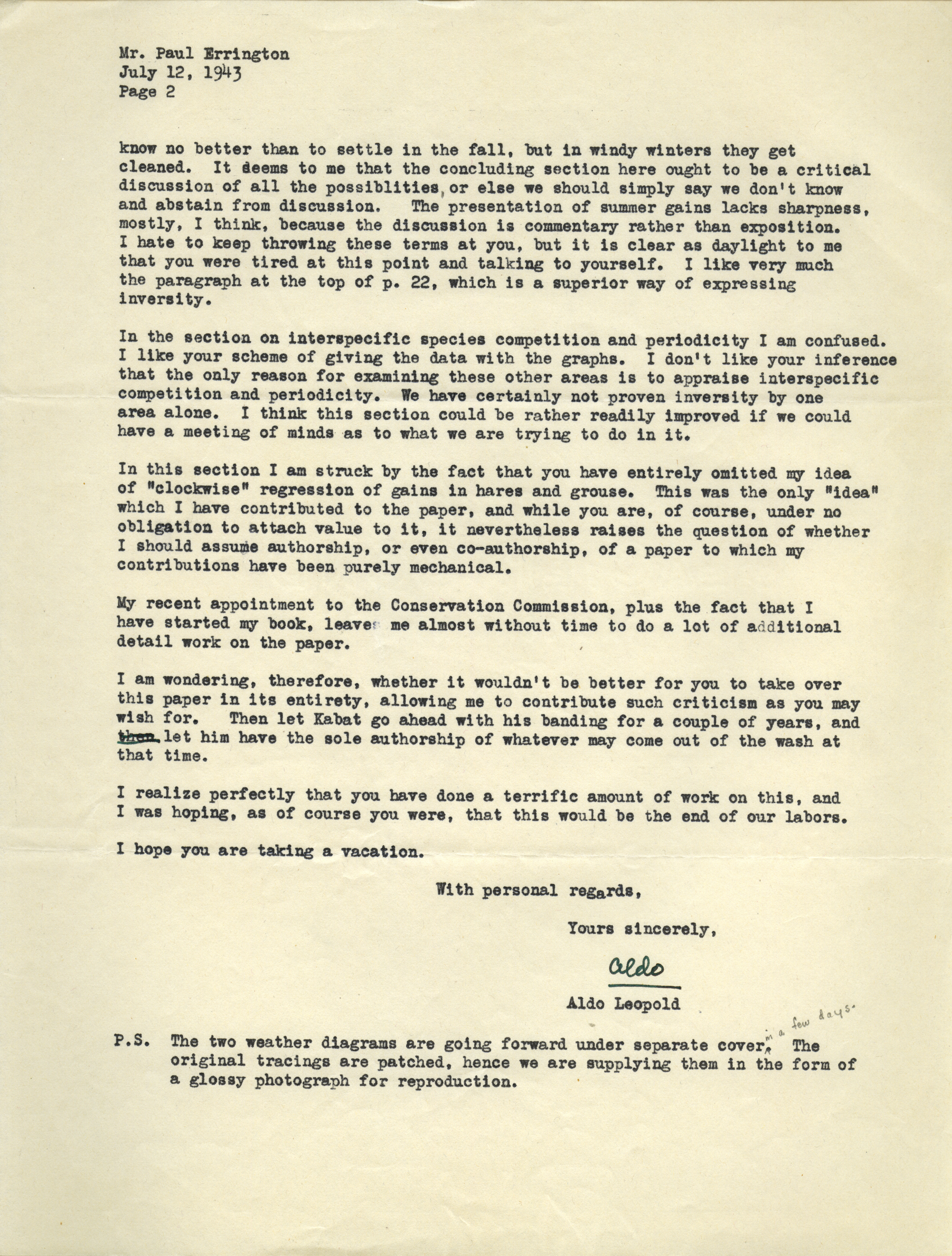 - Aldo Leopold letter to Paul Errington, July 12, 1943