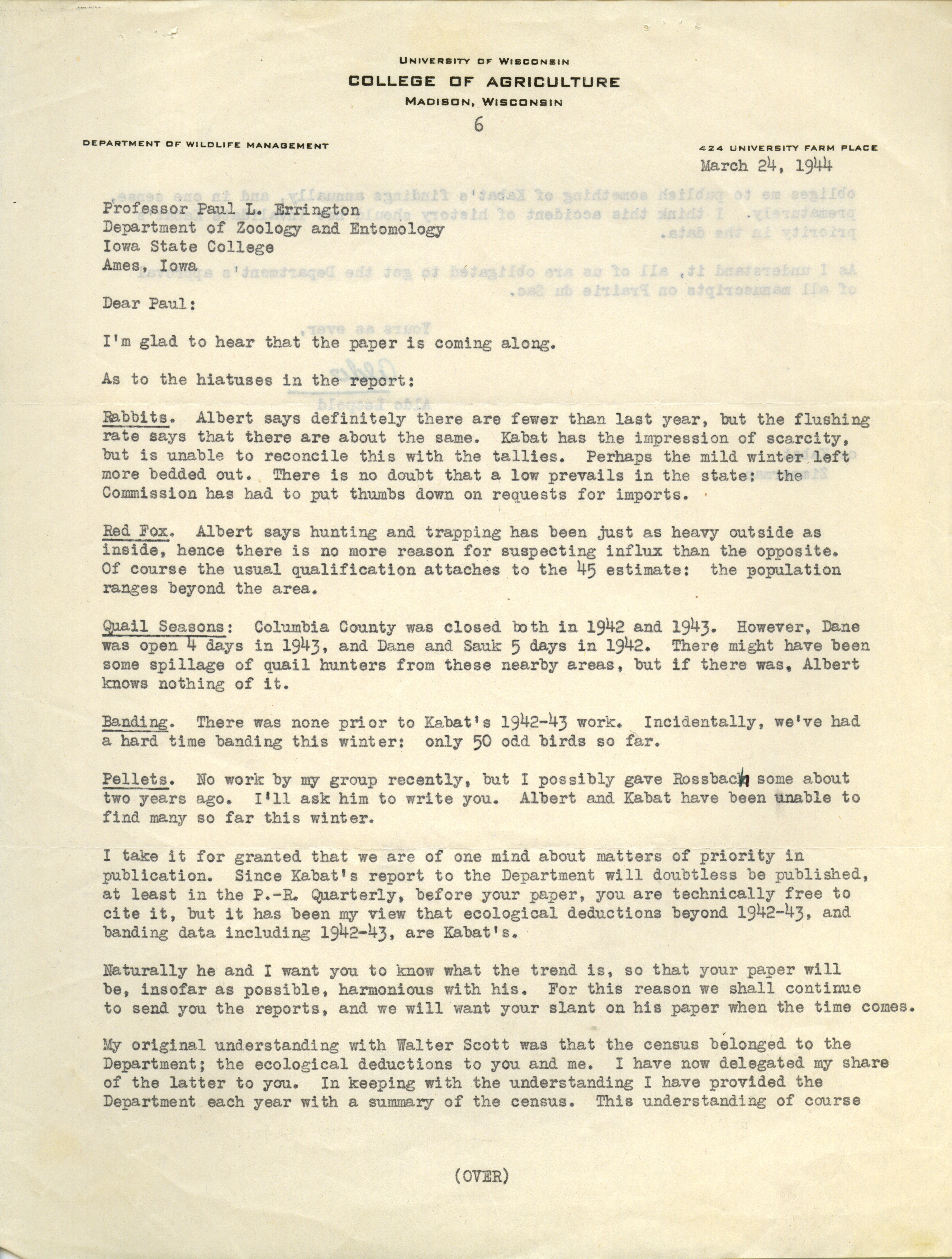 Aldo Leopold letter to Paul Errington, March 24, 1944 Item Info