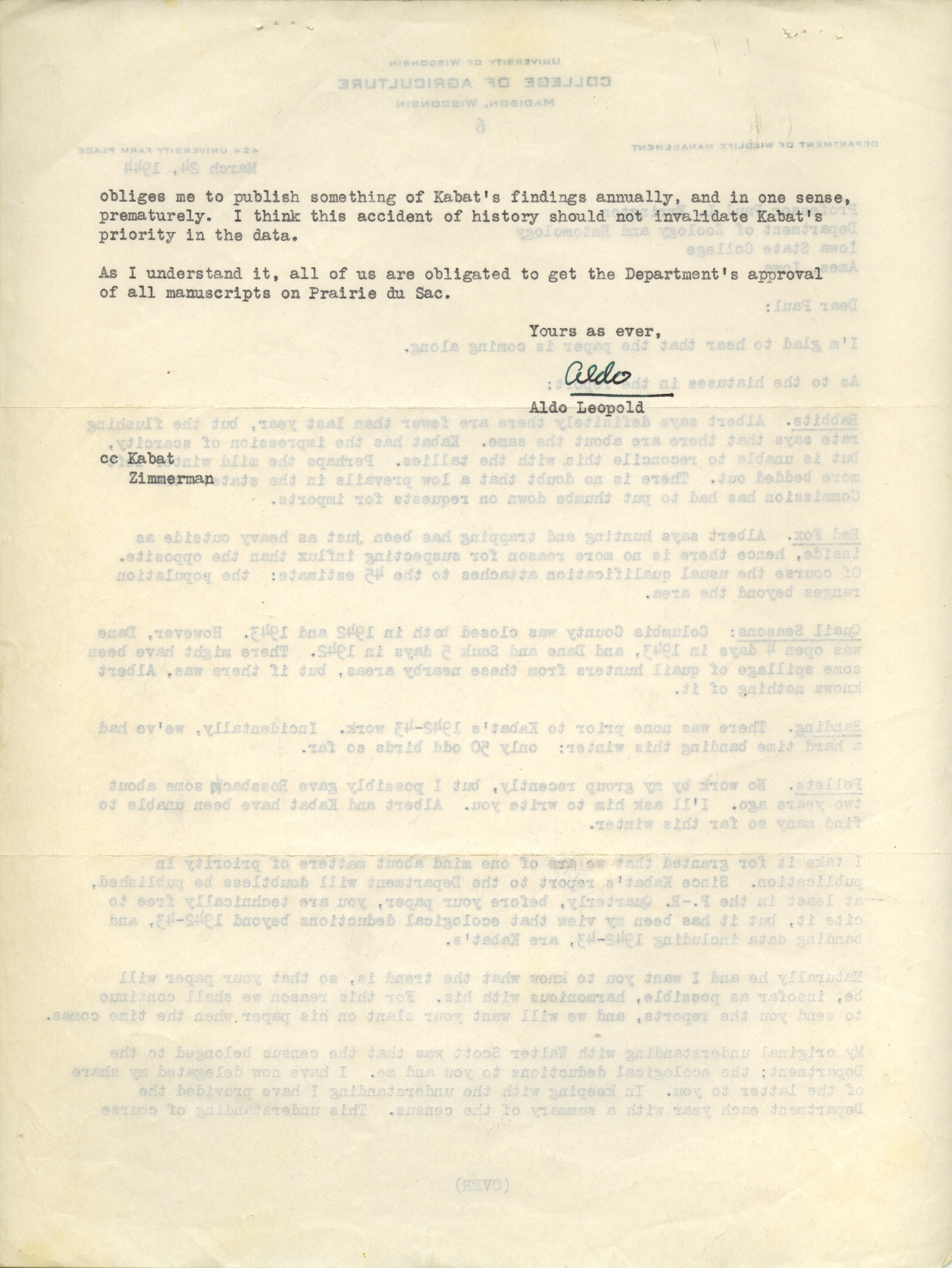 - Aldo Leopold letter to Paul Errington, March 24, 1944