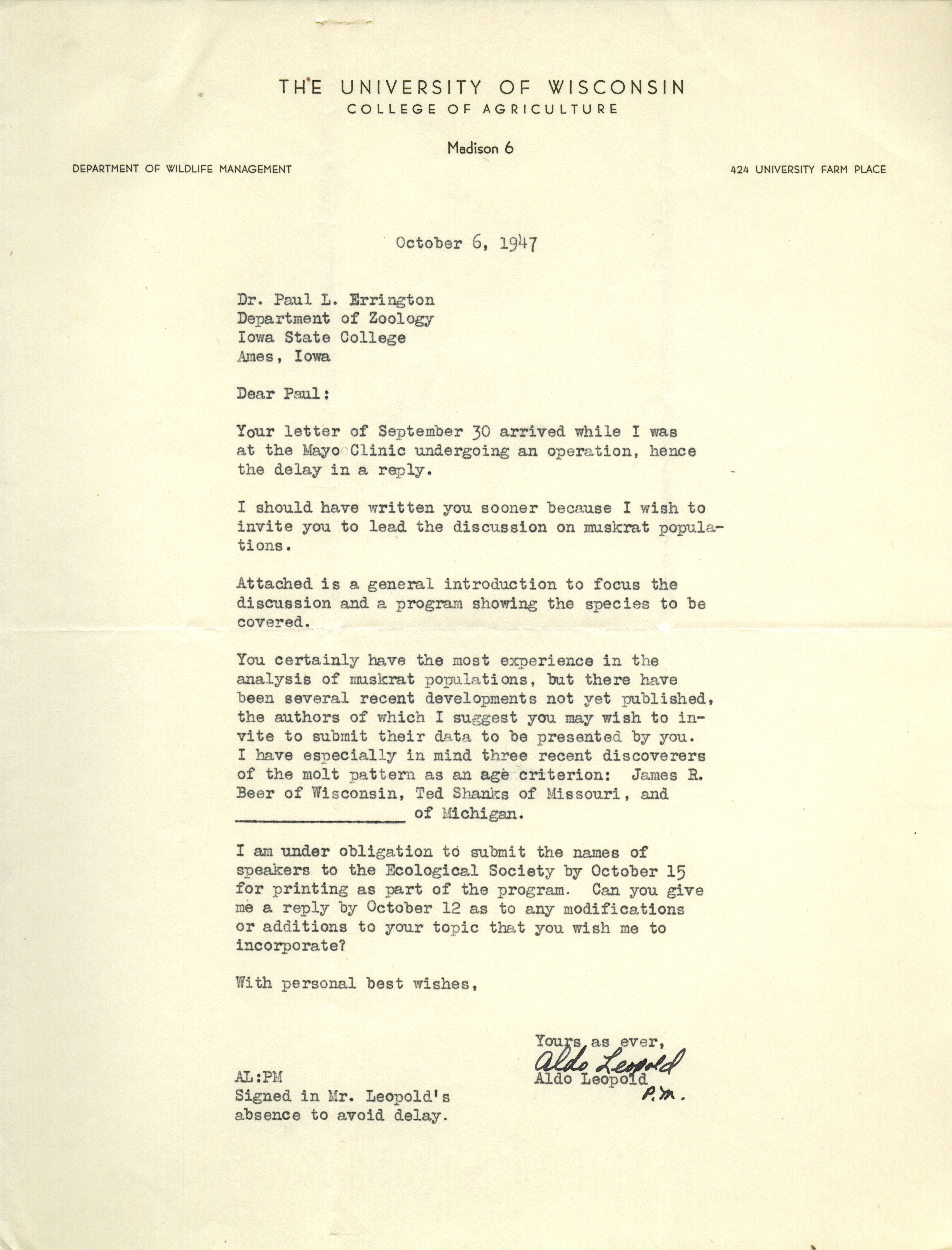Aldo Leopold letter to Paul Errington, October 6, 1947 Item Info
