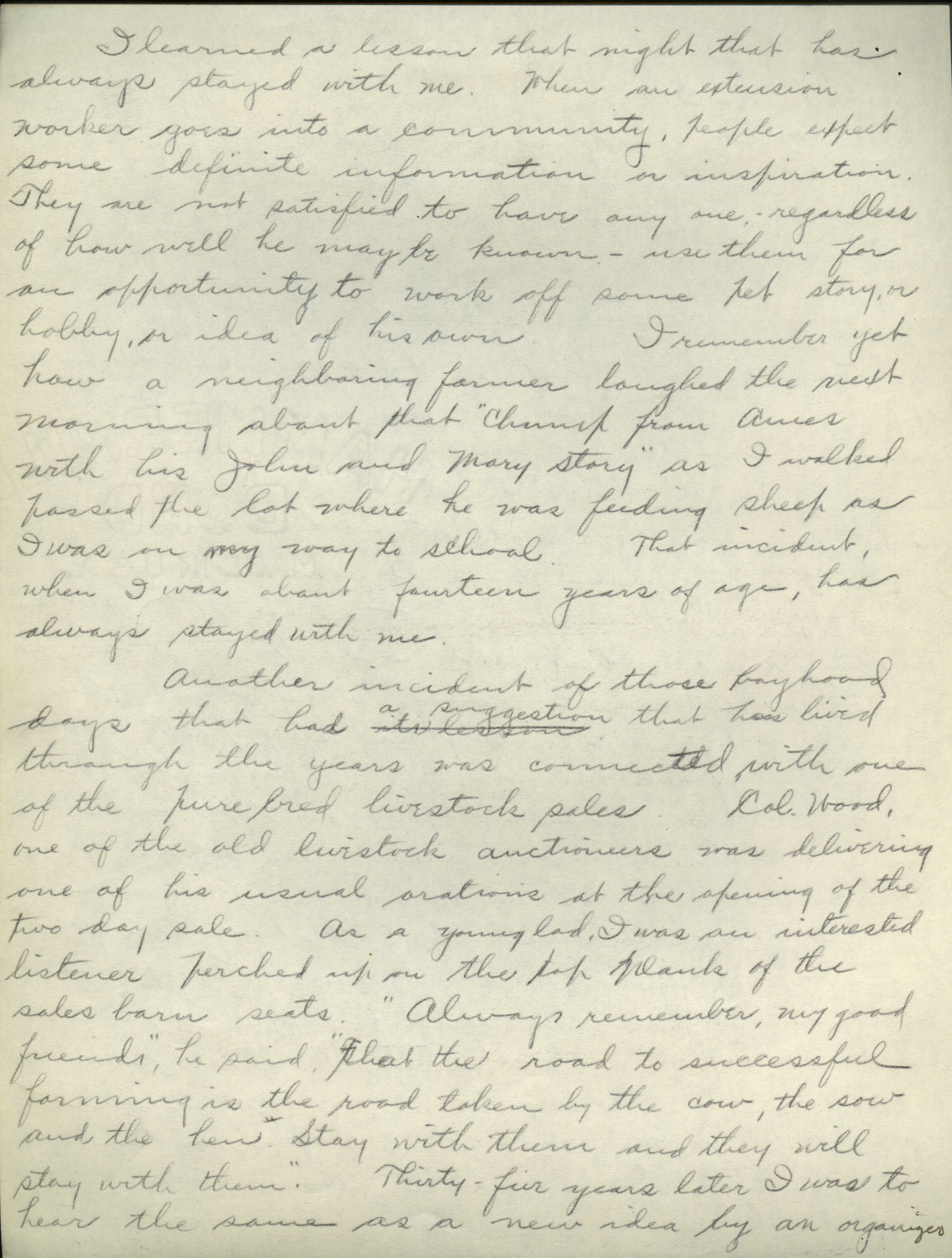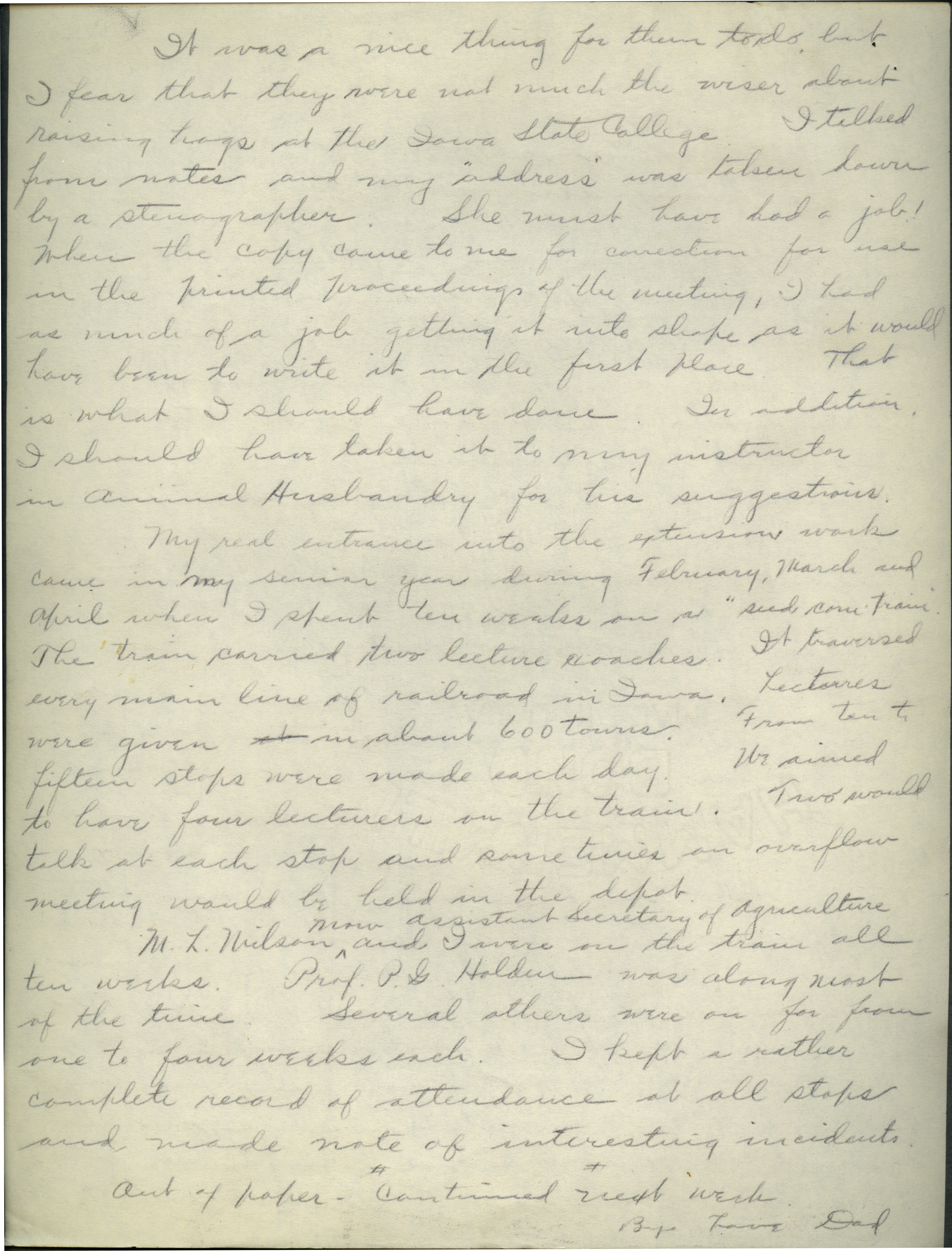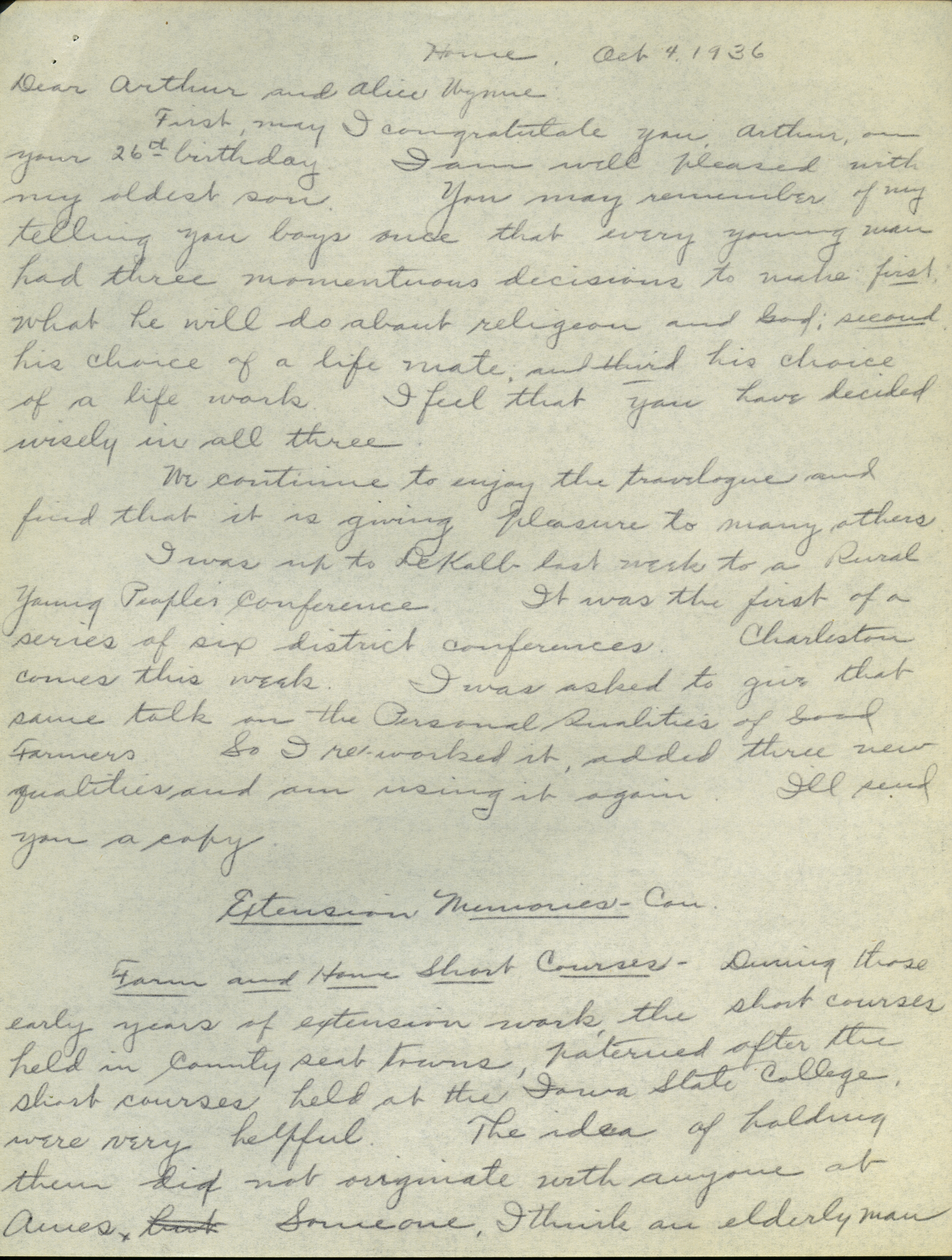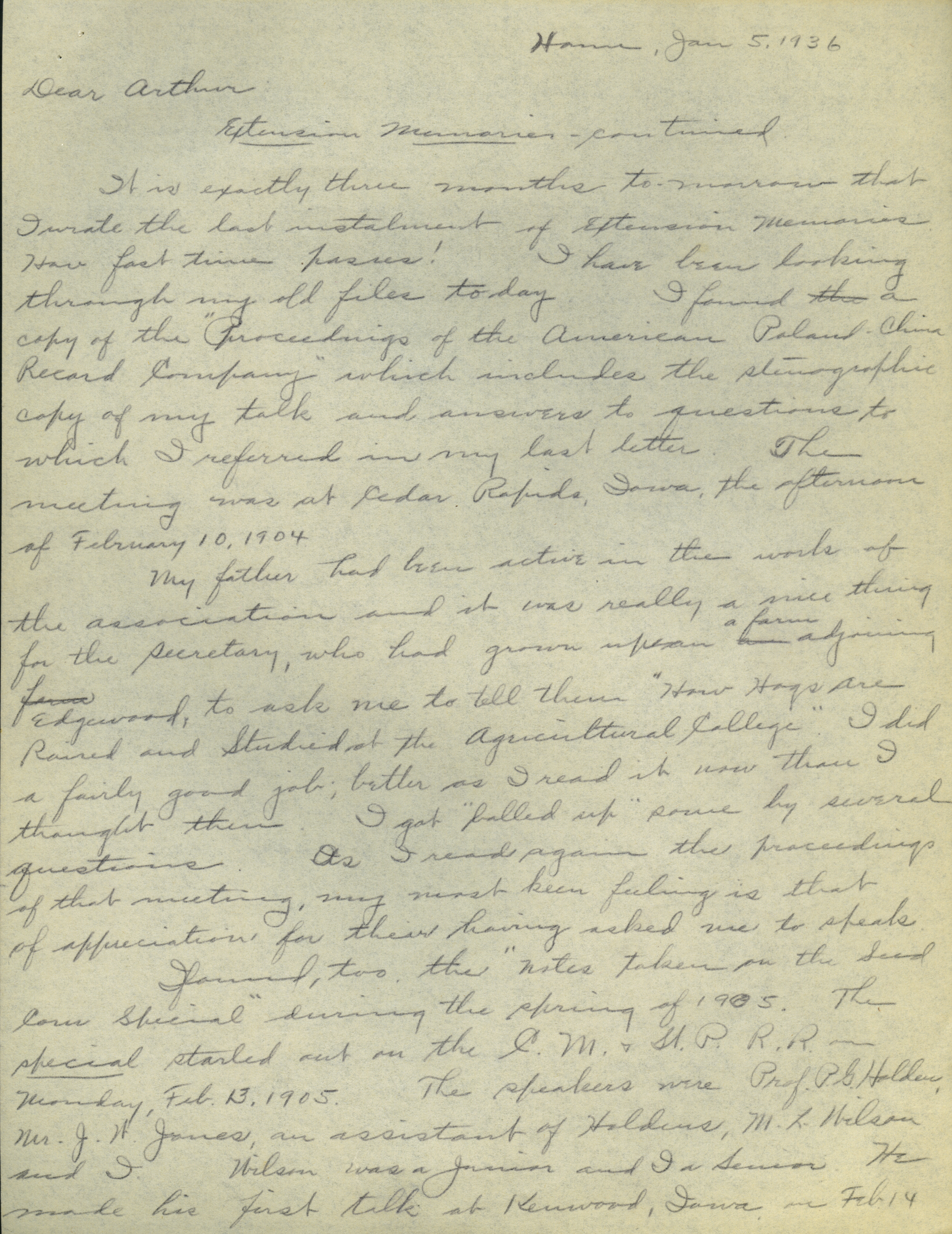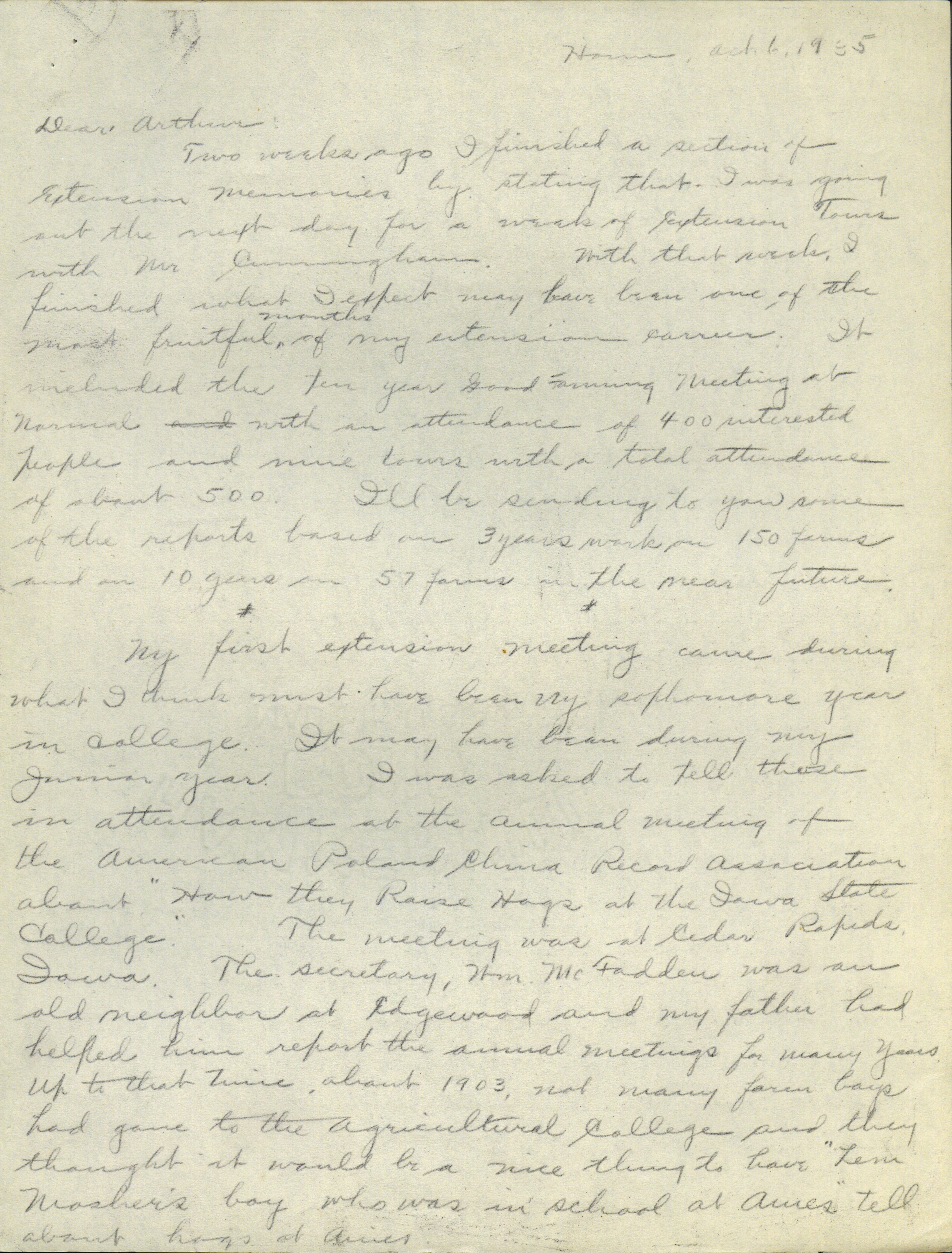 - Collection of six handwritten letters addressed to Arthur Mosher from his father, Martin L. Mosher. The topics of the letters include the five steps in agricultural development, early extension work, Mosher's general philosophy regarding extension work, and personal recollections.