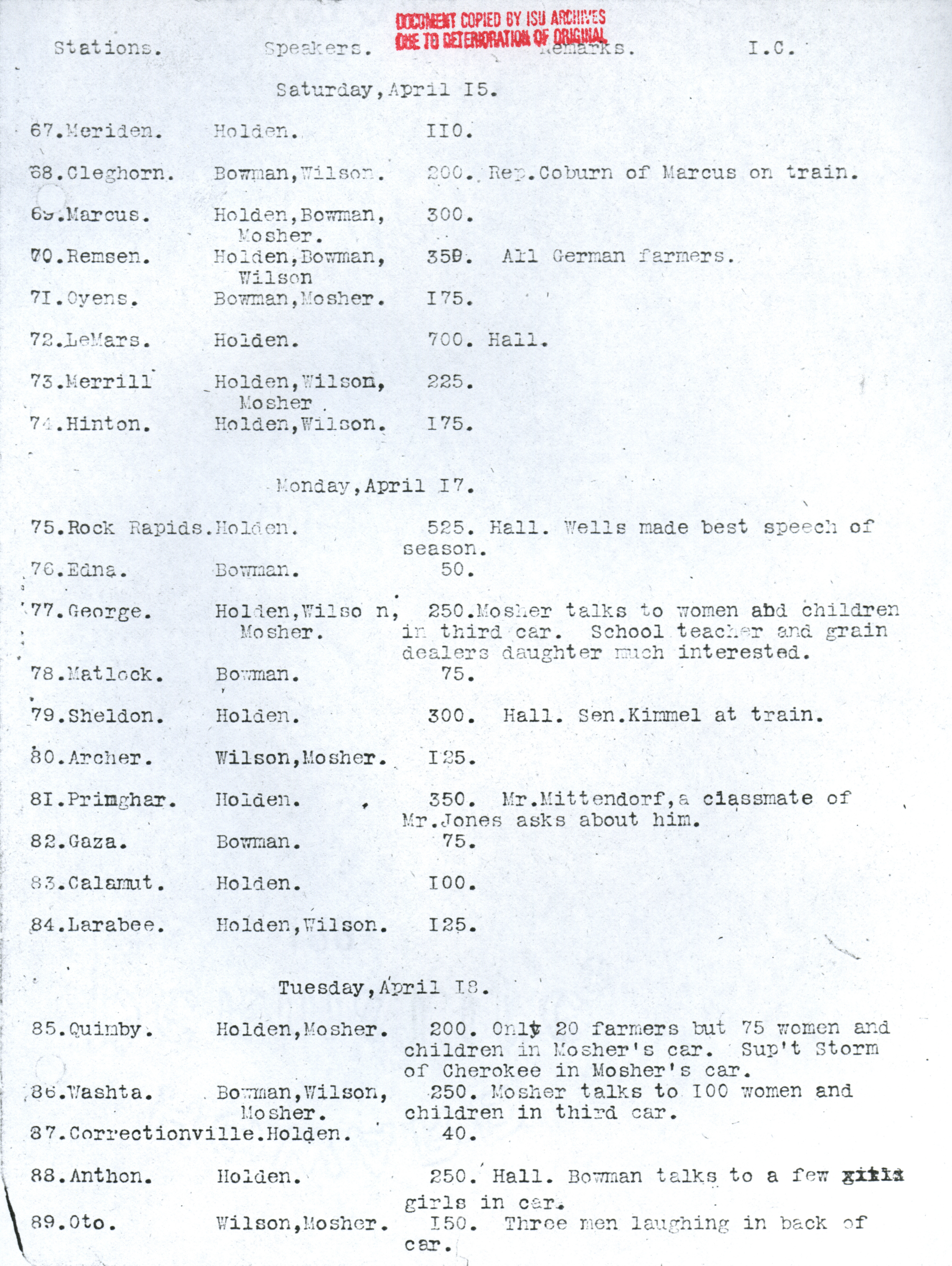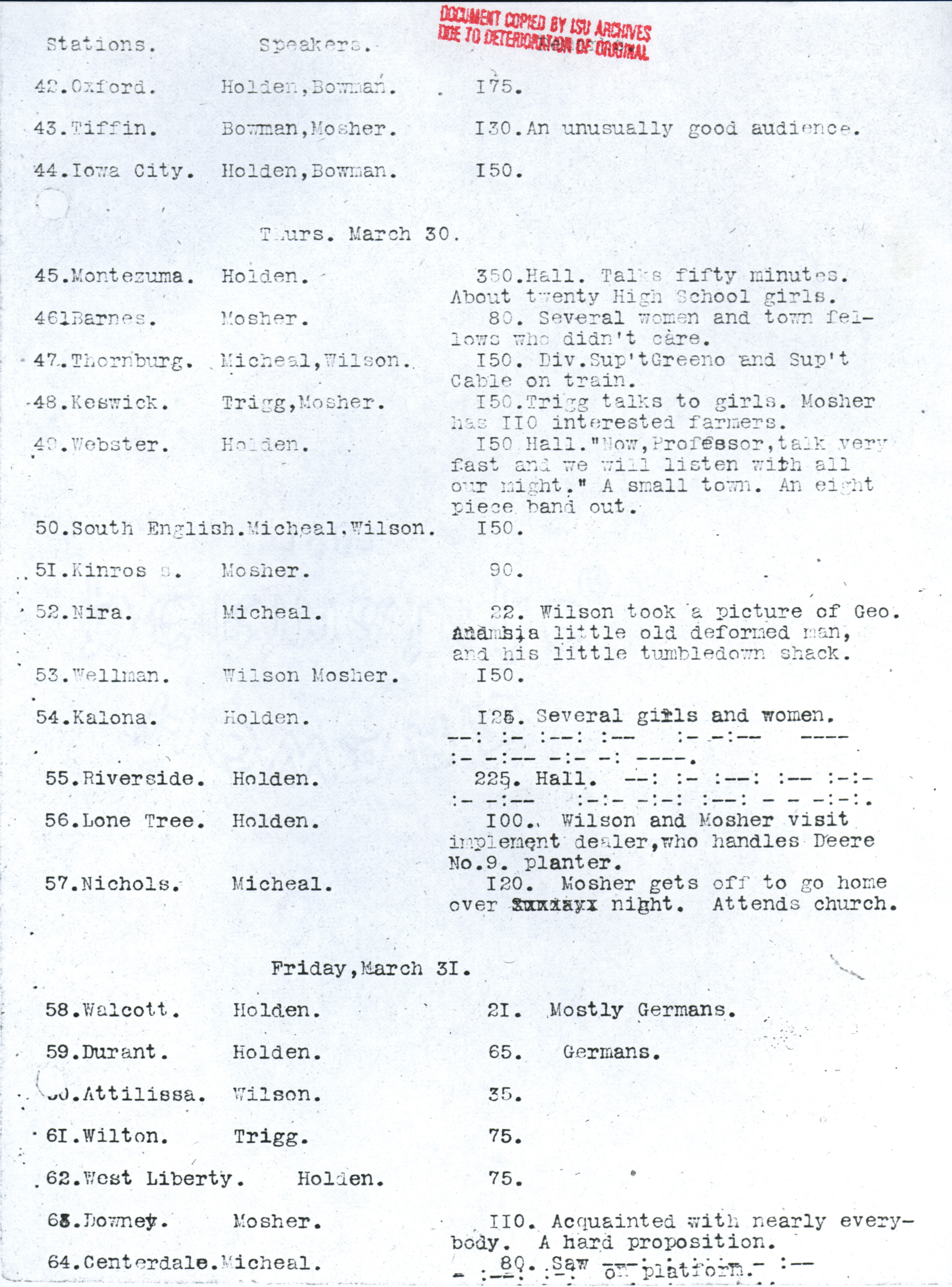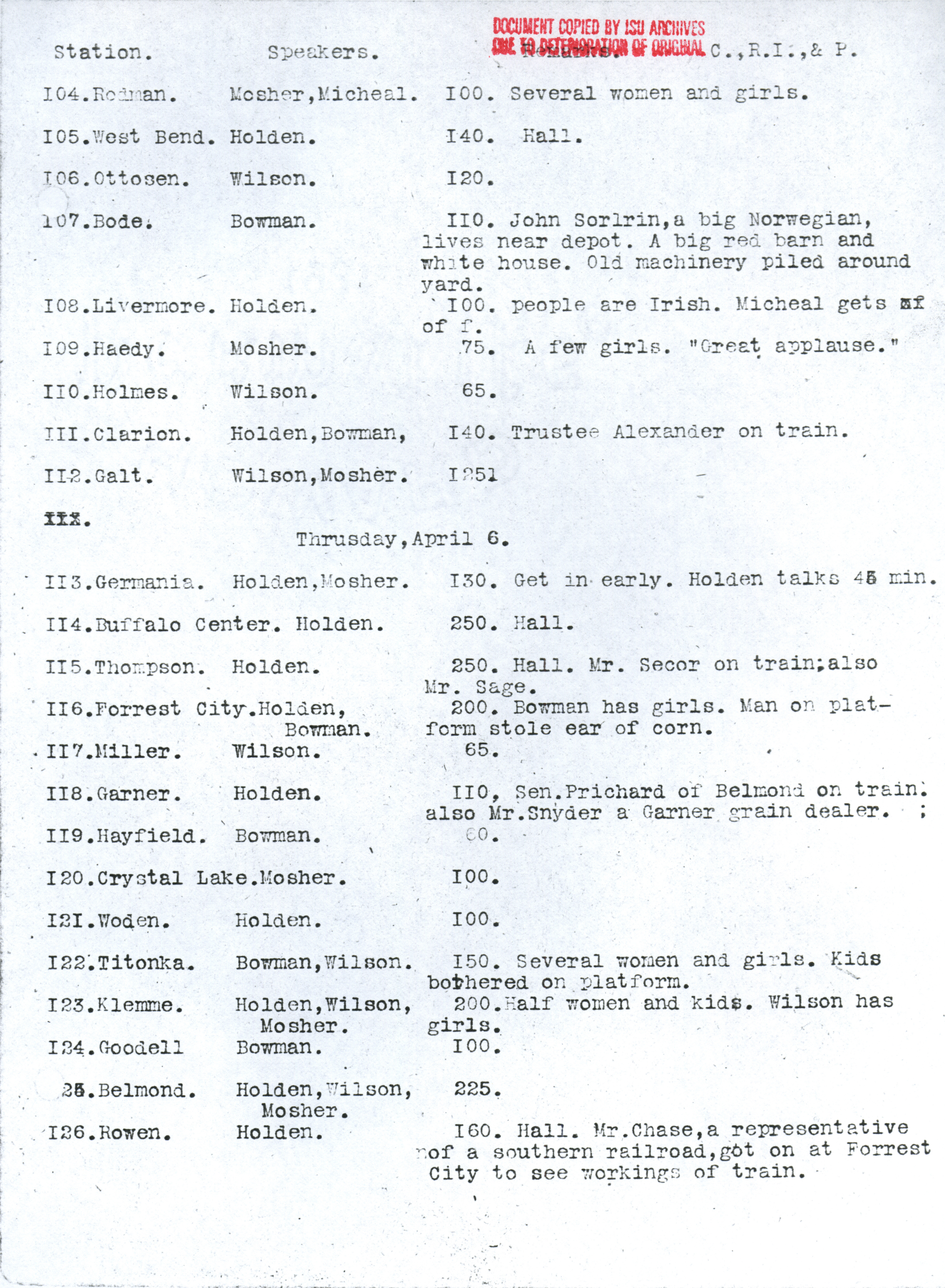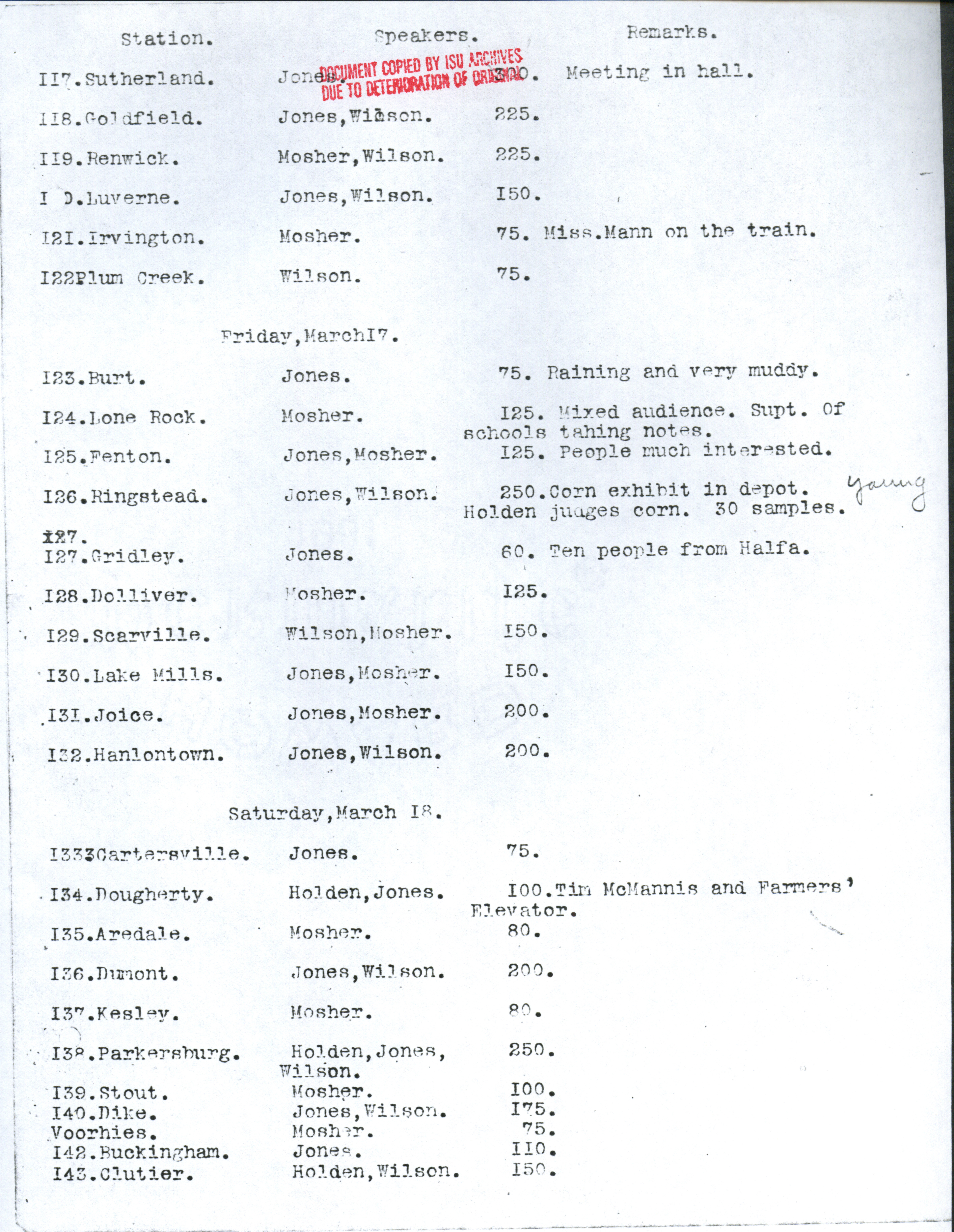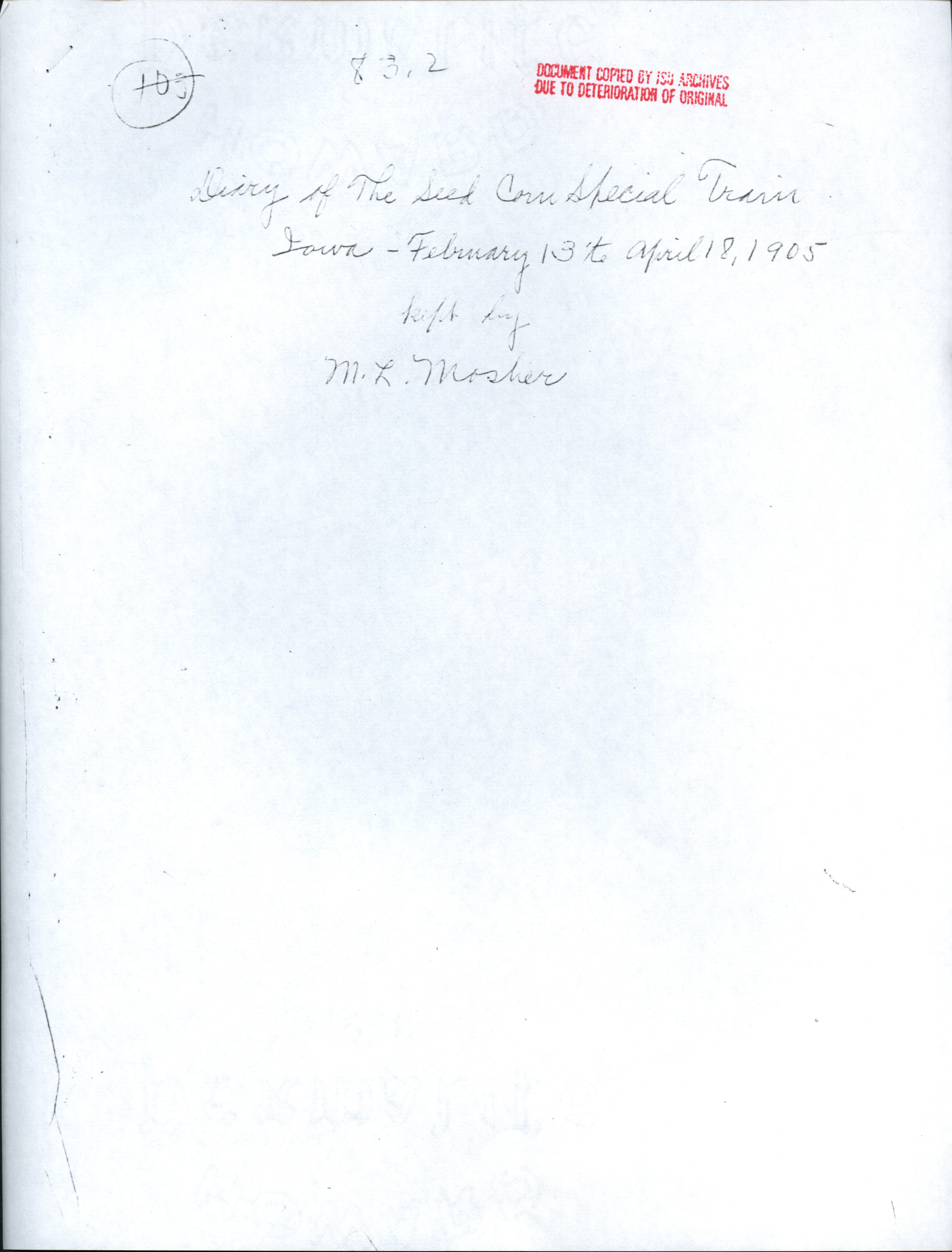 - Martin L. Mosher's diary, kept during the early corn train outings. Contains dates and locations of stops, as well as notes about participation and enthusiasm of participants. Item is a copy from the ISU Archives due to deterioration of the original.