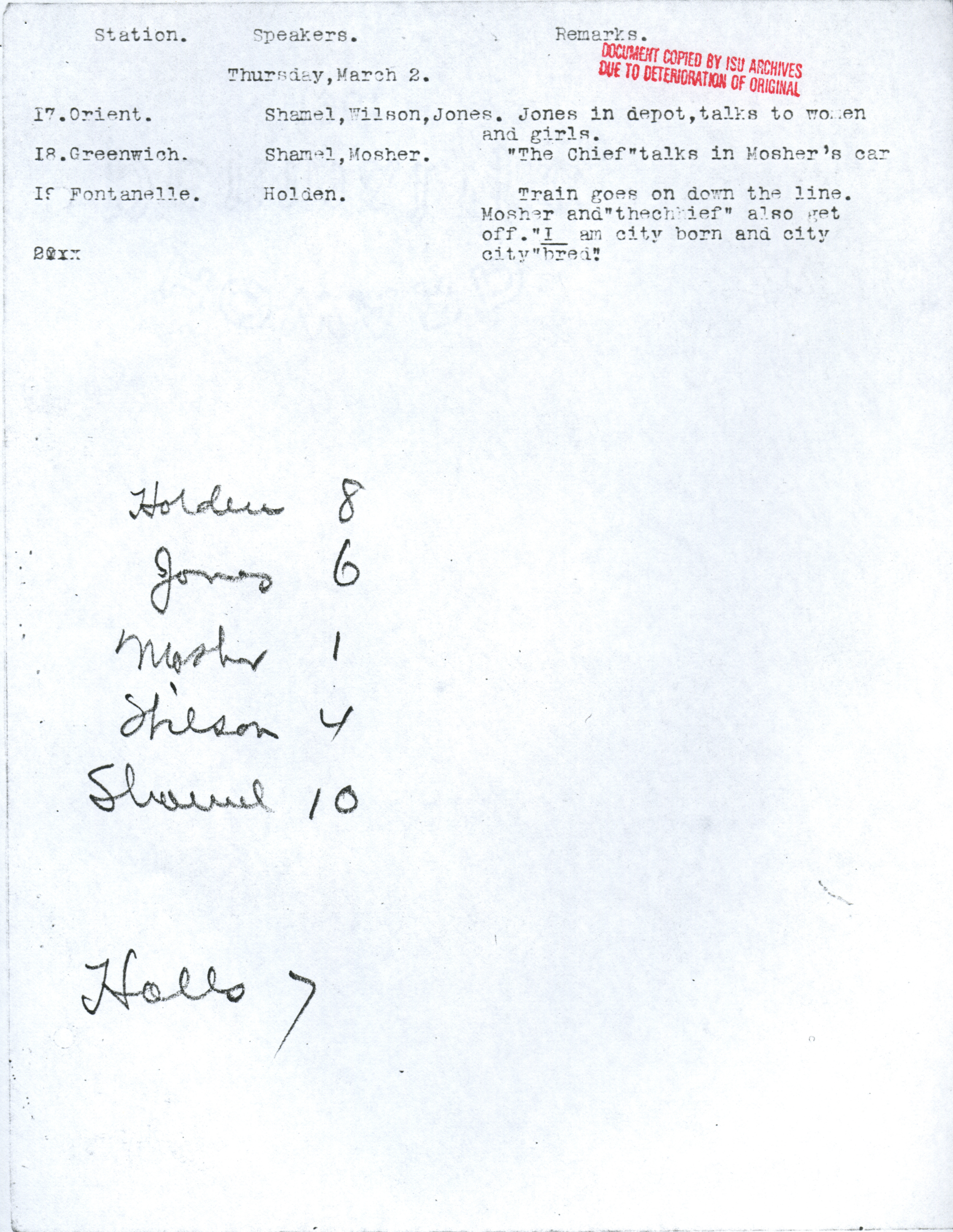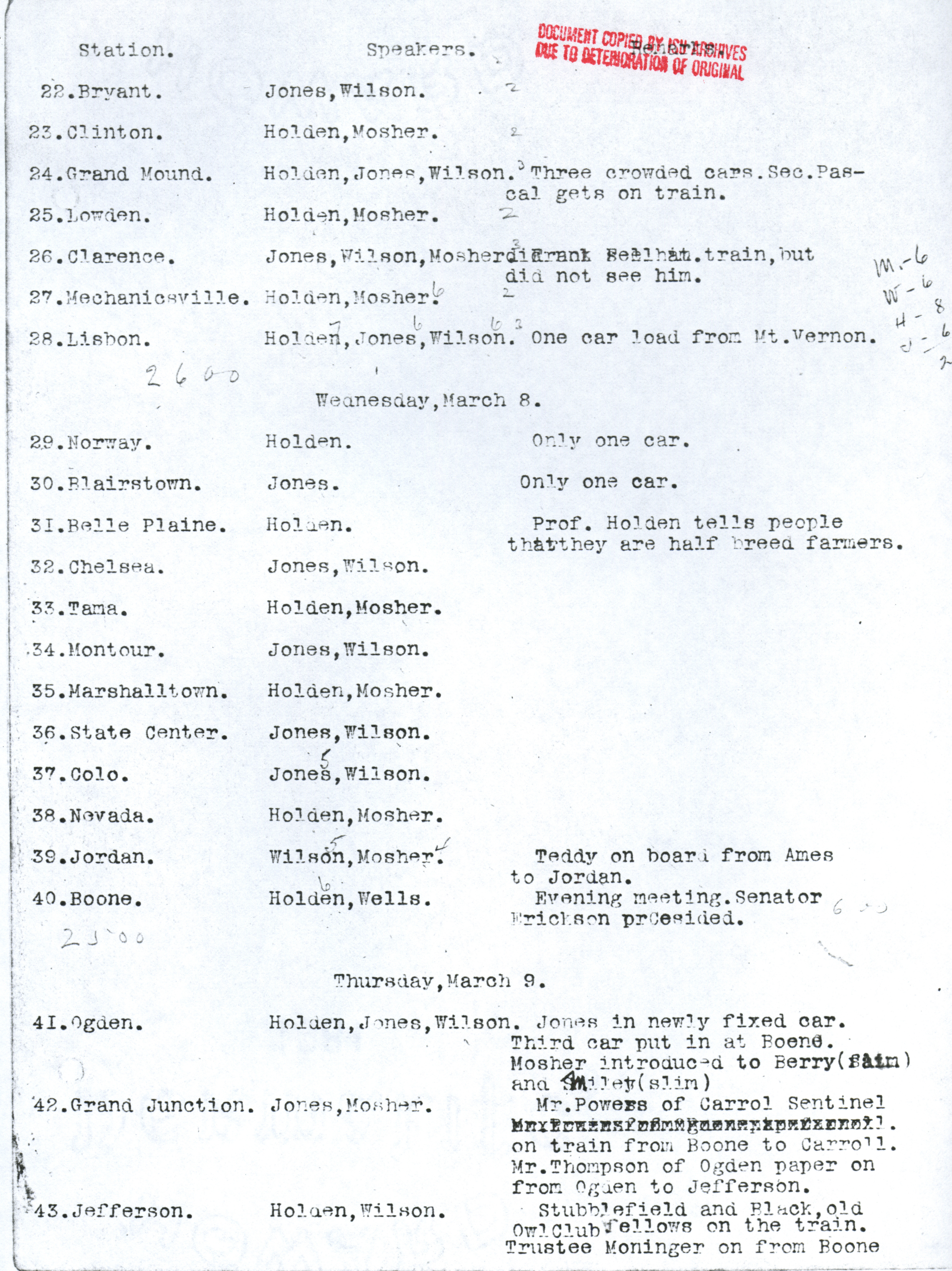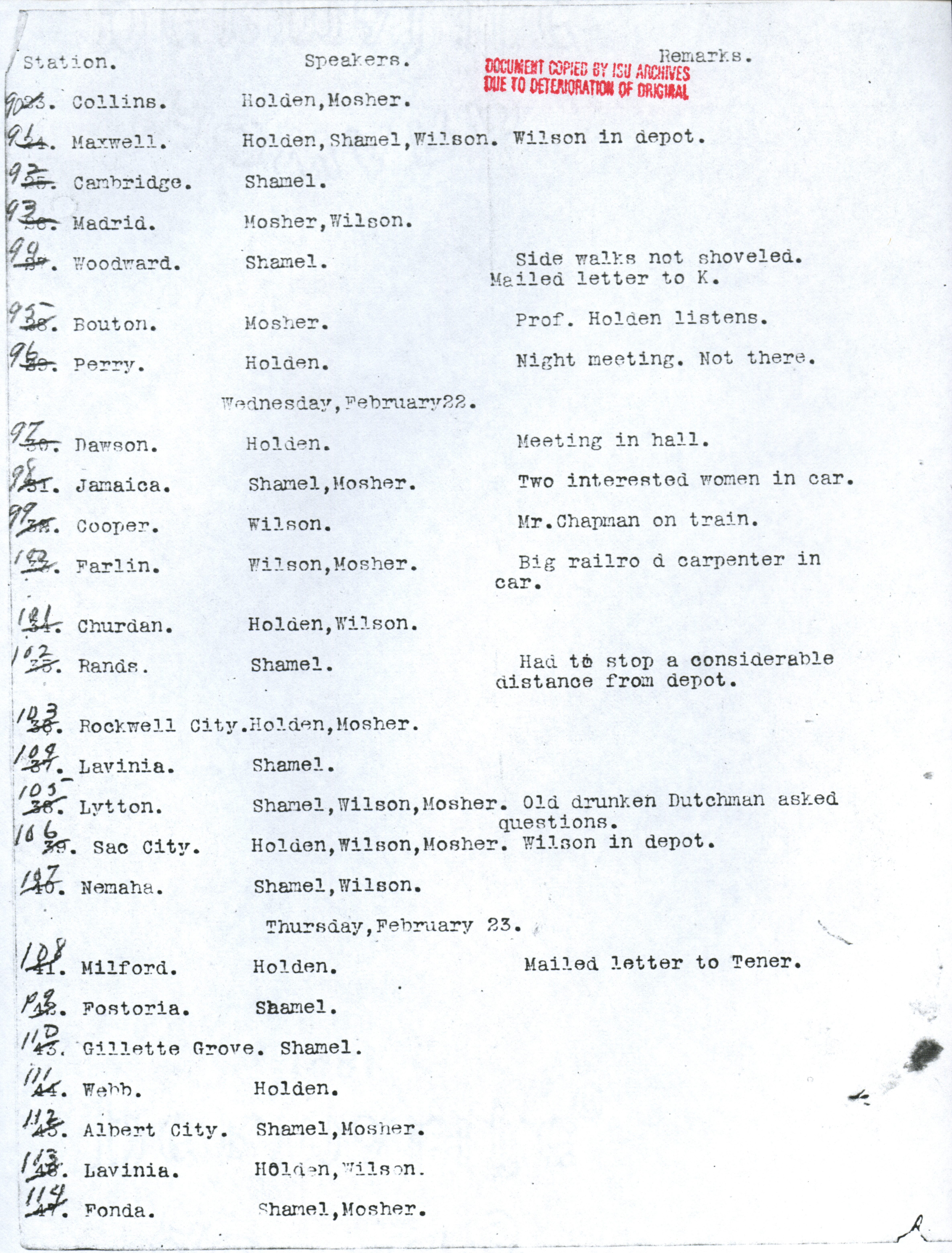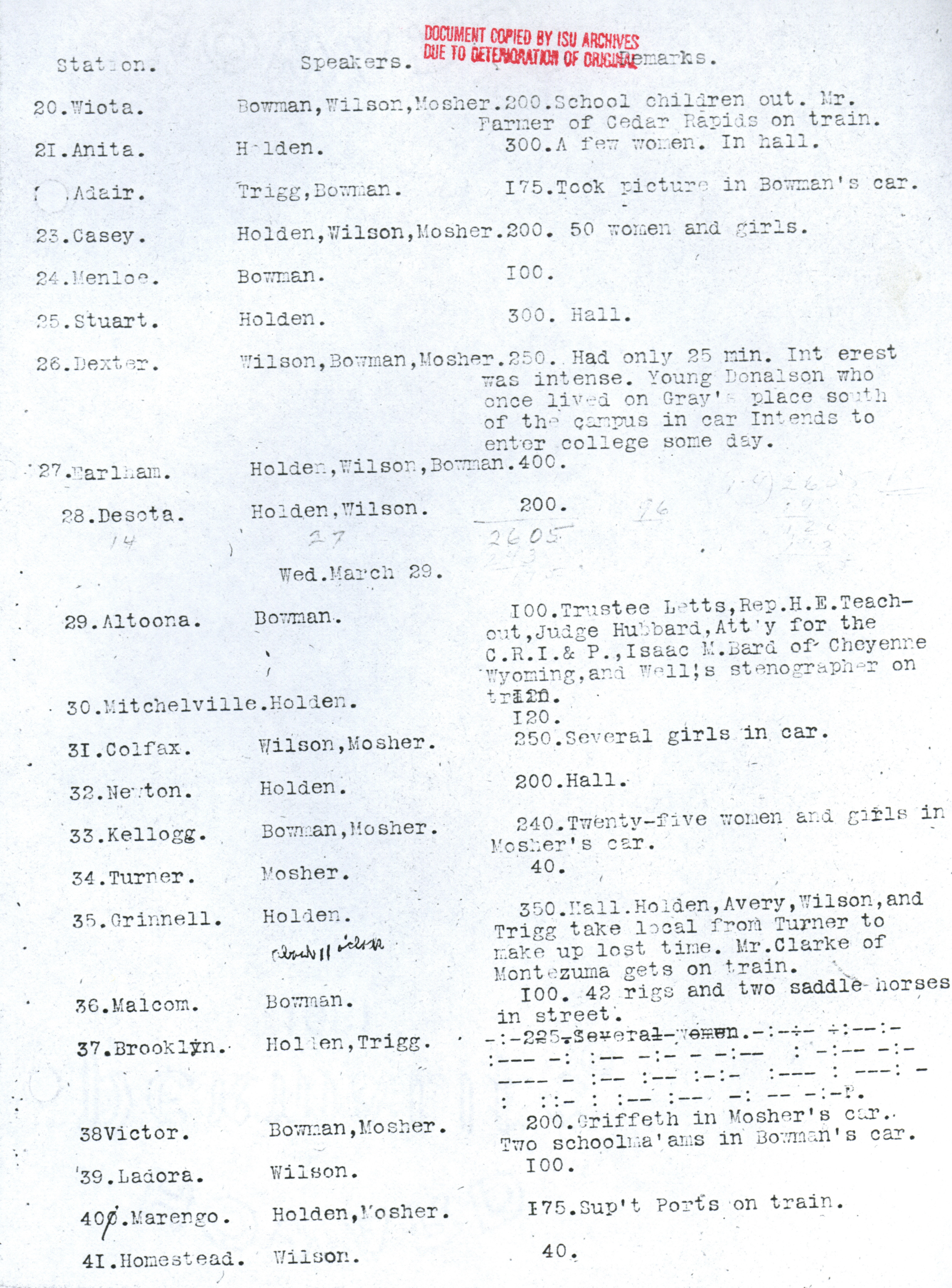 - Martin L. Mosher's diary, kept during the early corn train outings. Contains dates and locations of stops, as well as notes about participation and enthusiasm of participants. Item is a copy from the ISU Archives due to deterioration of the original.