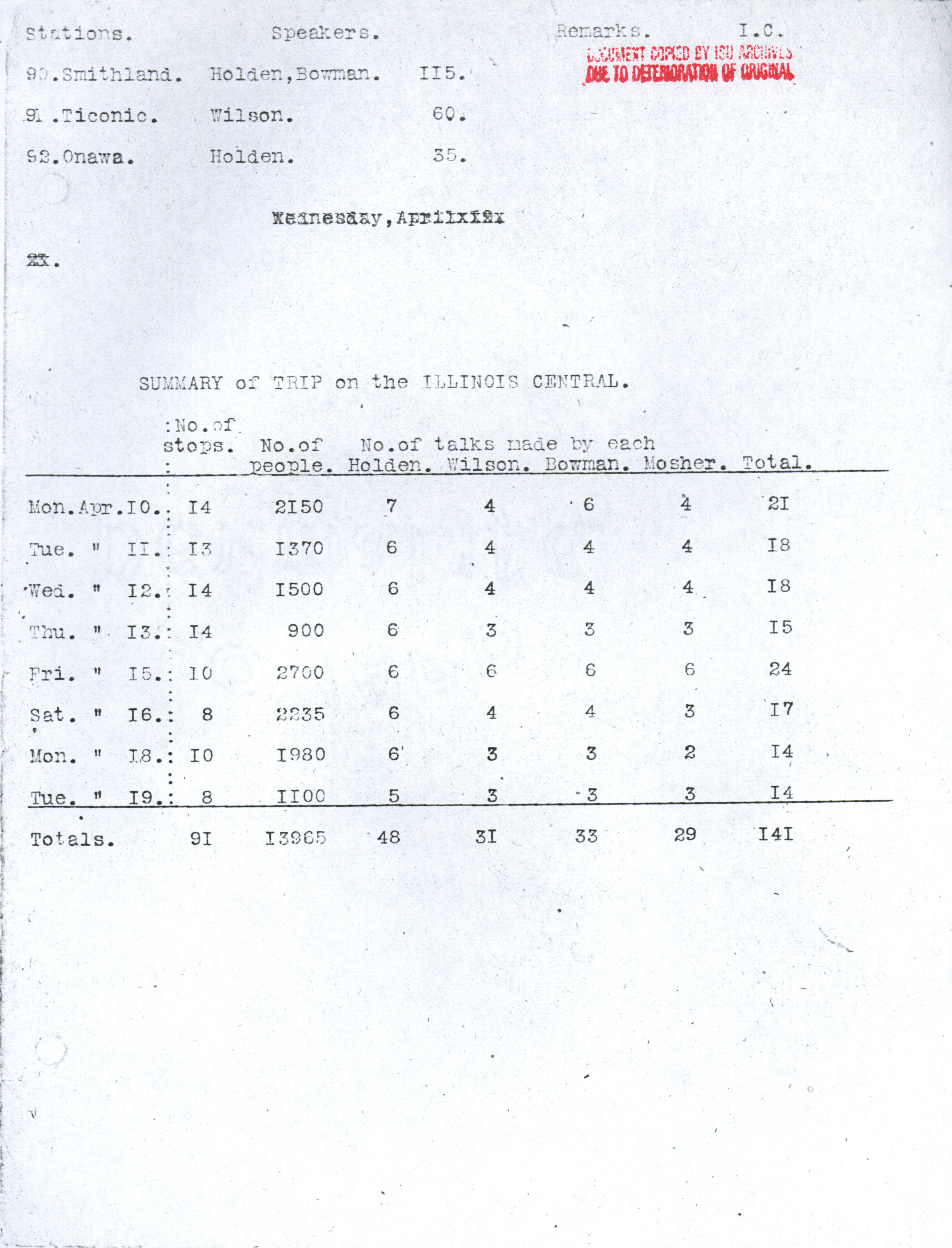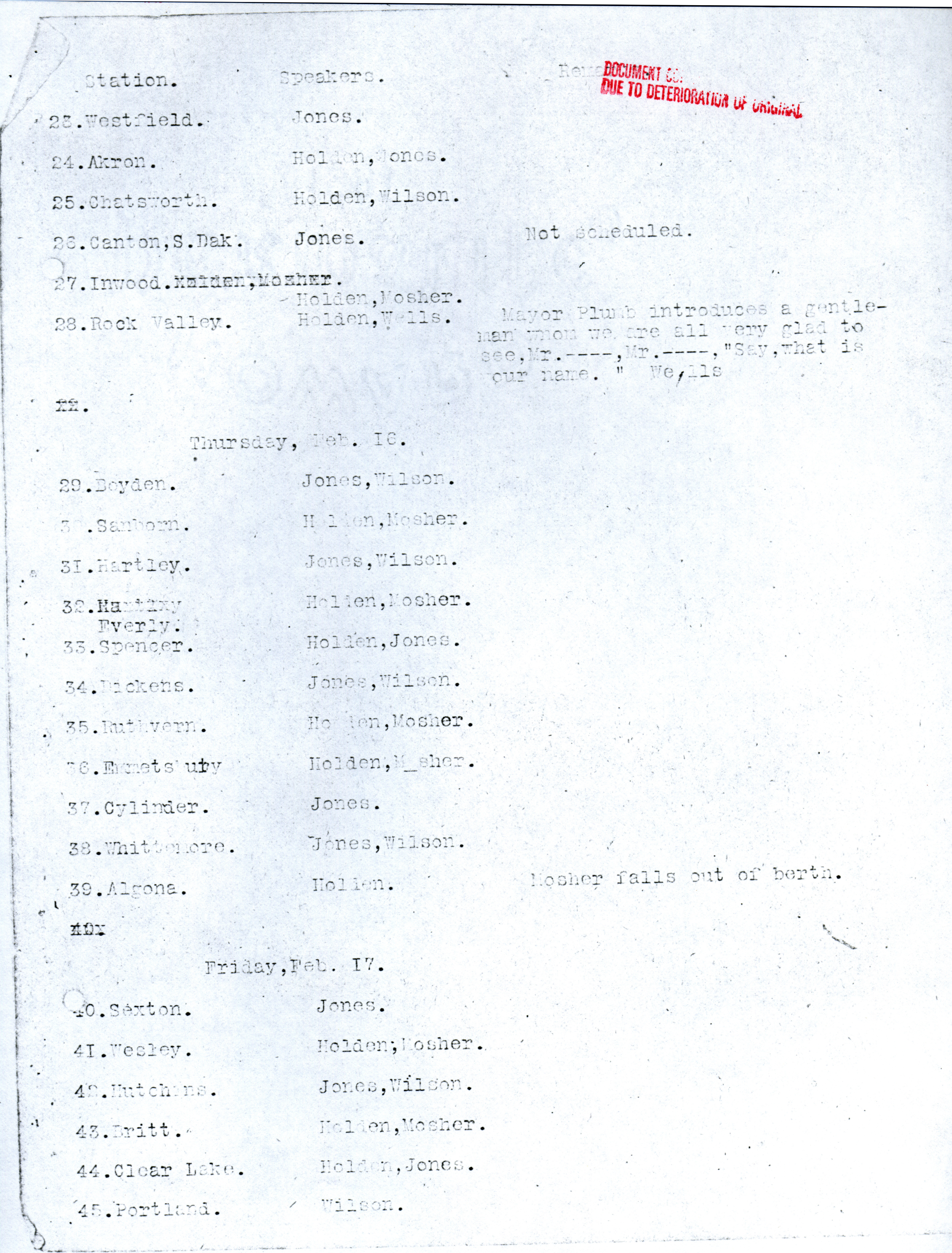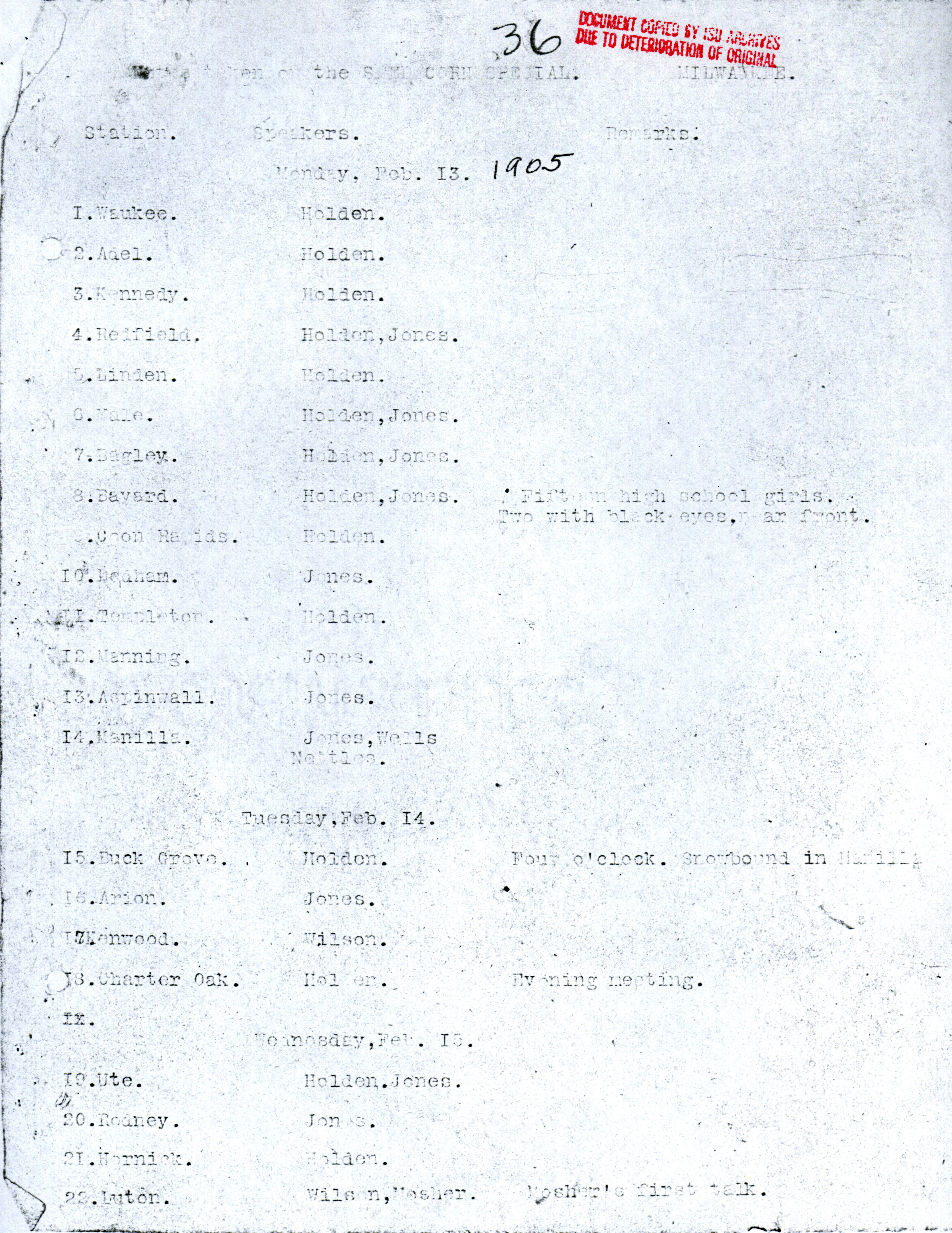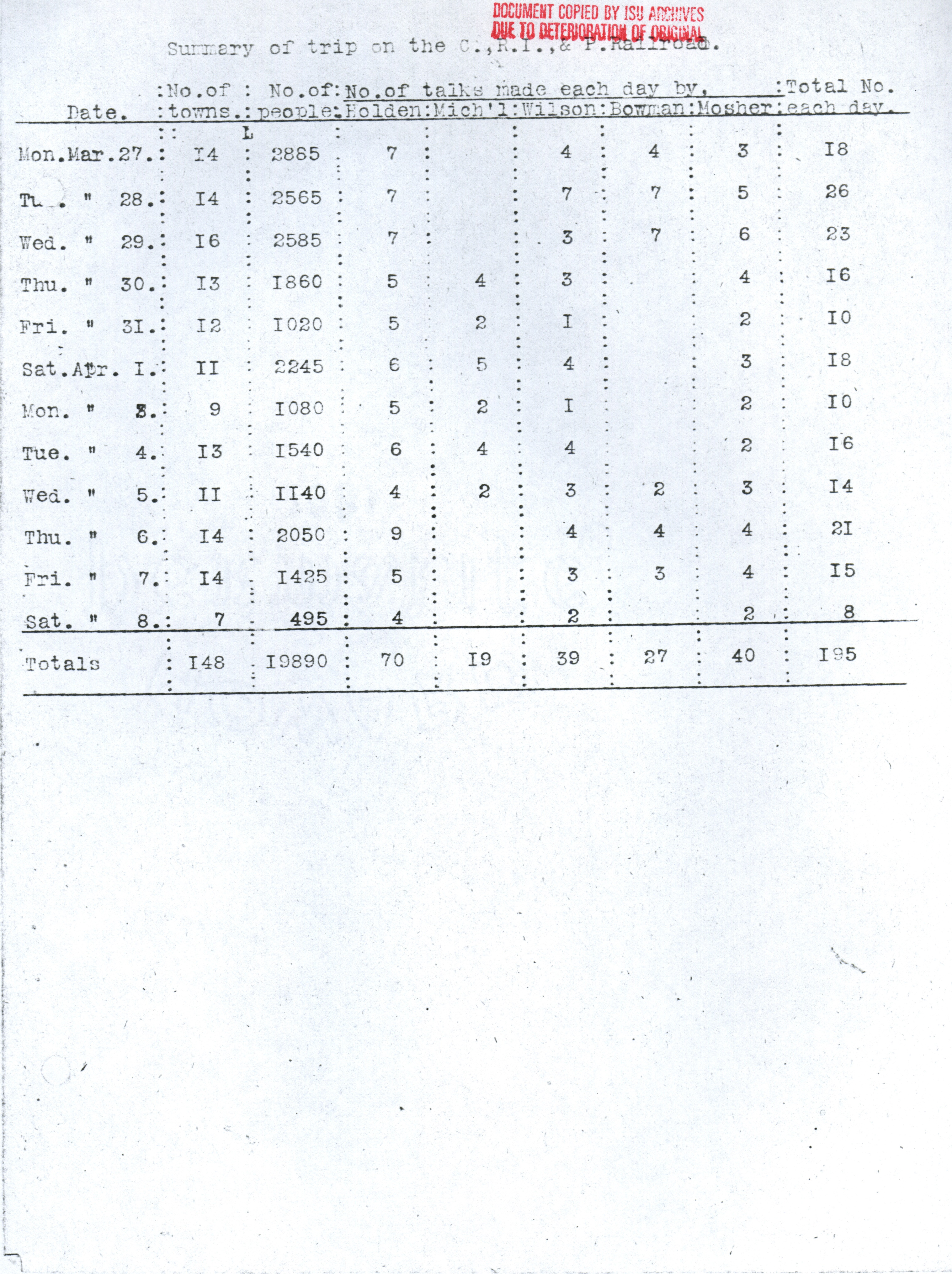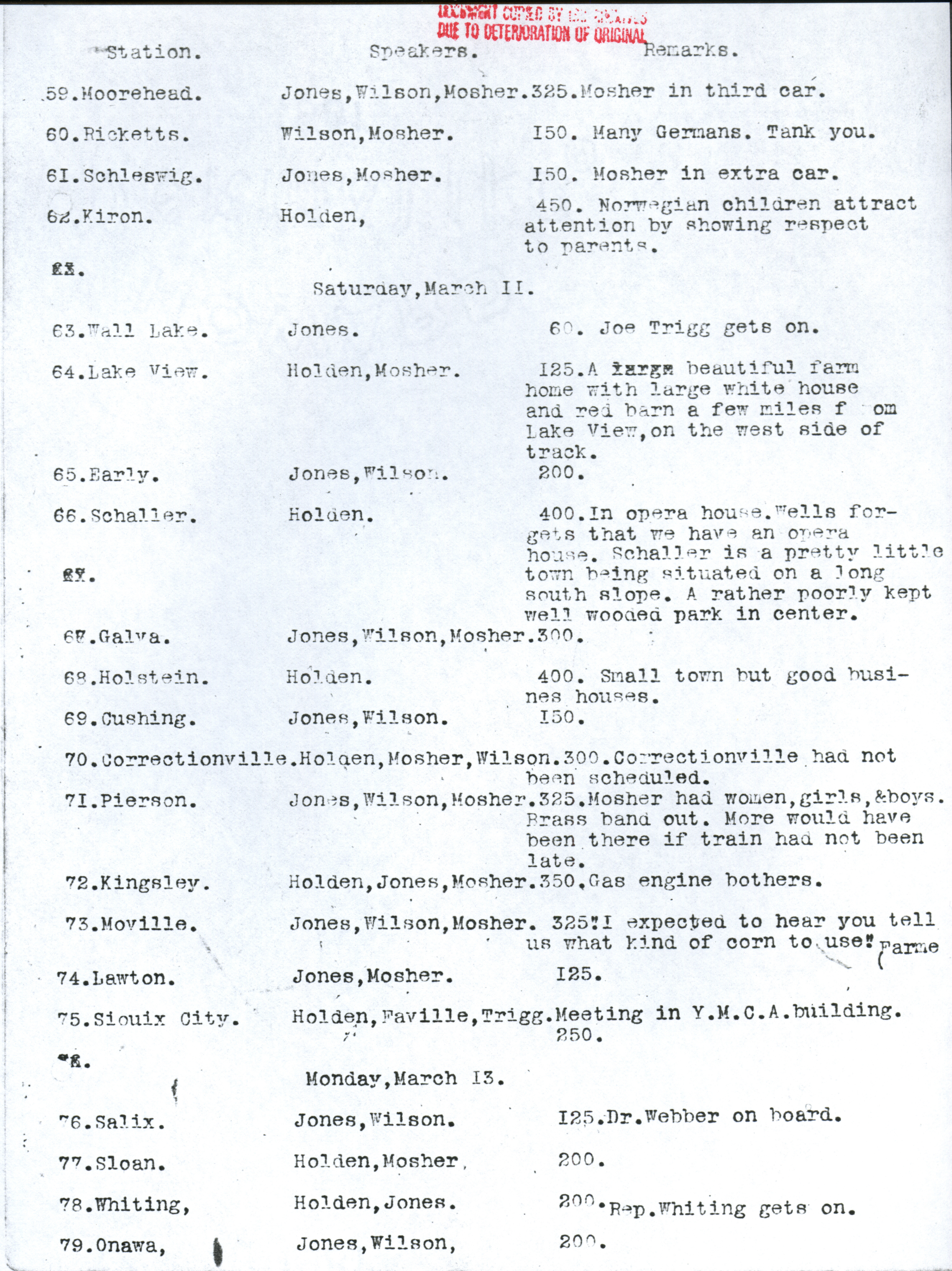 - Martin L. Mosher's diary, kept during the early corn train outings. Contains dates and locations of stops, as well as notes about participation and enthusiasm of participants. Item is a copy from the ISU Archives due to deterioration of the original.
