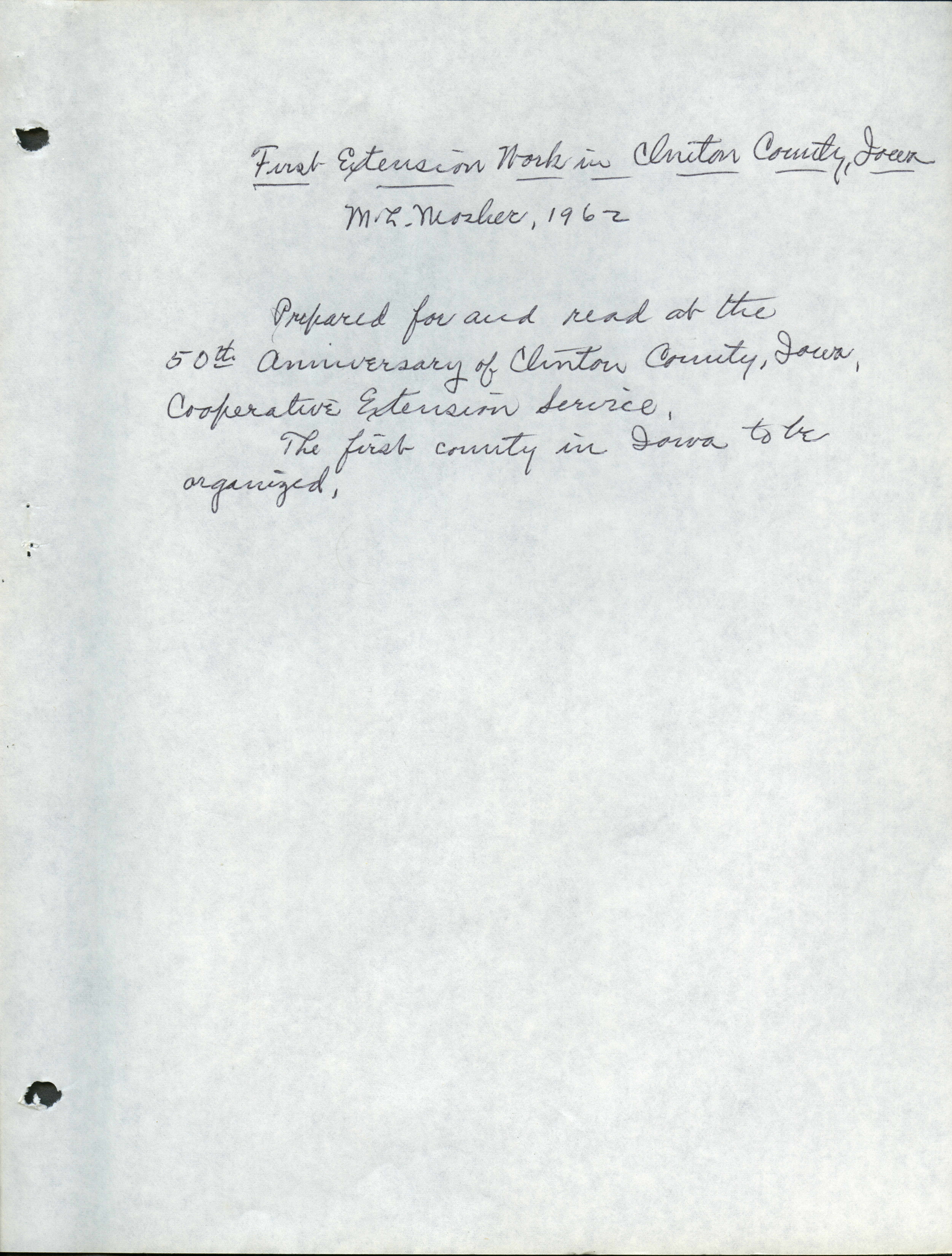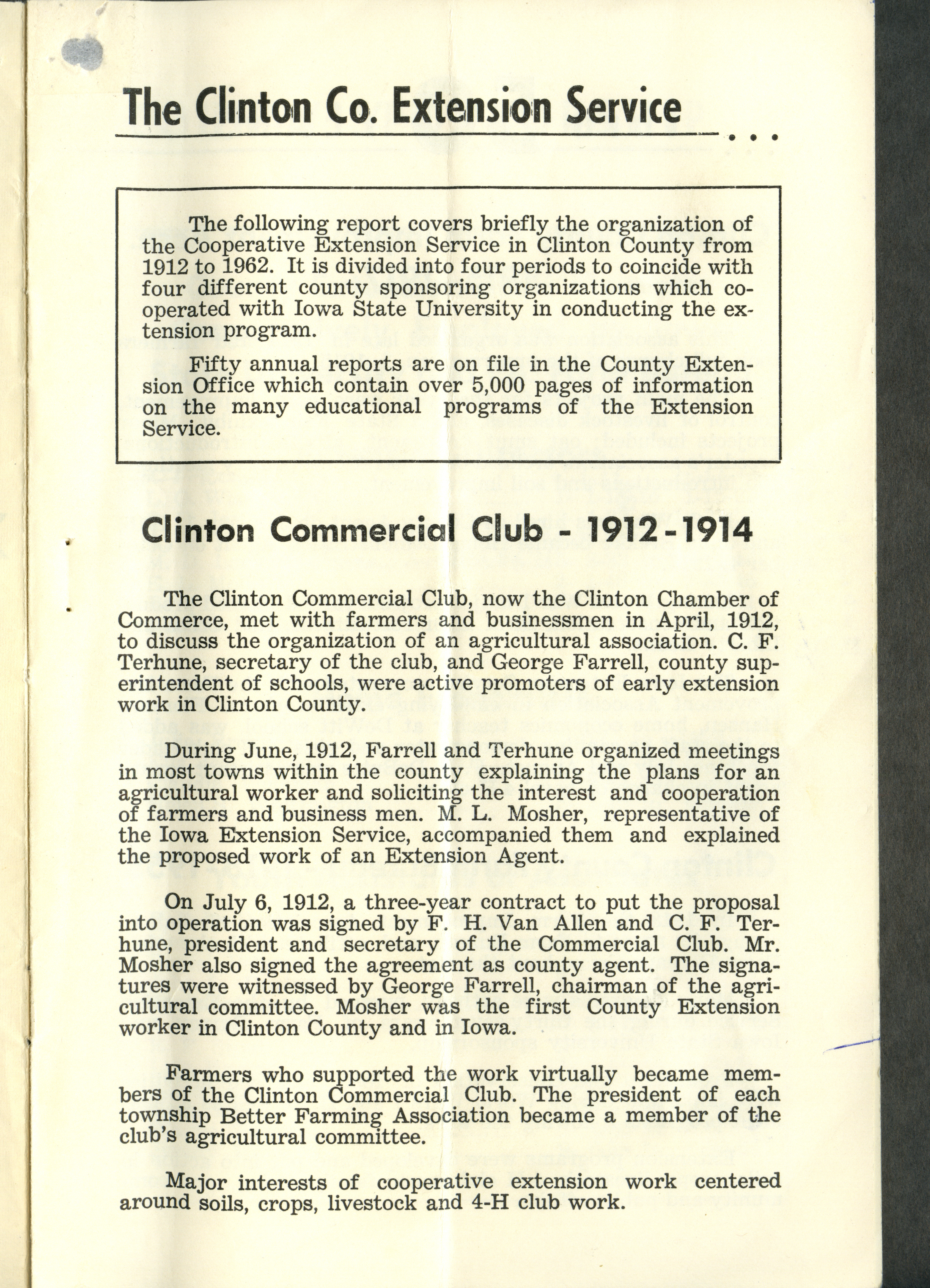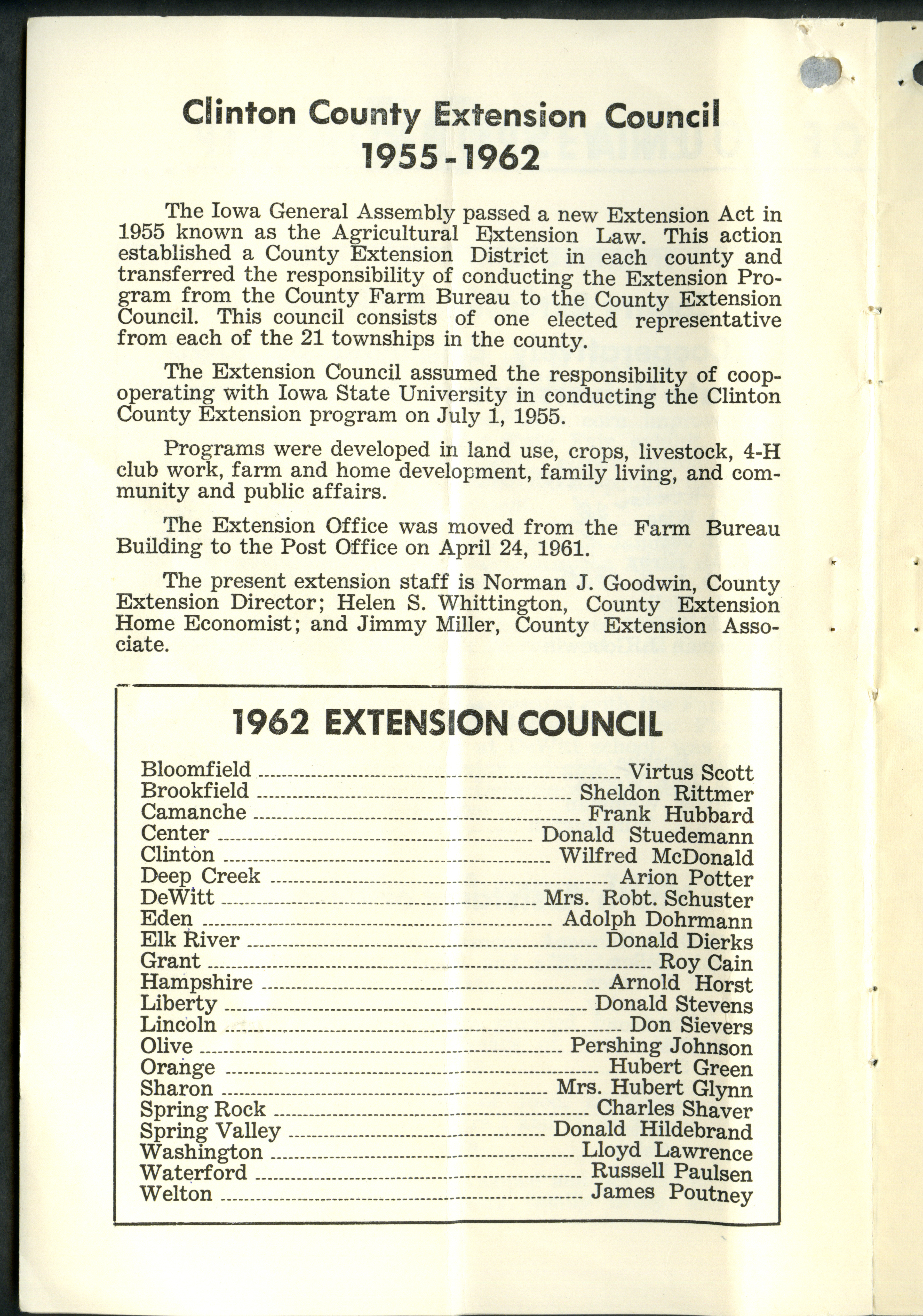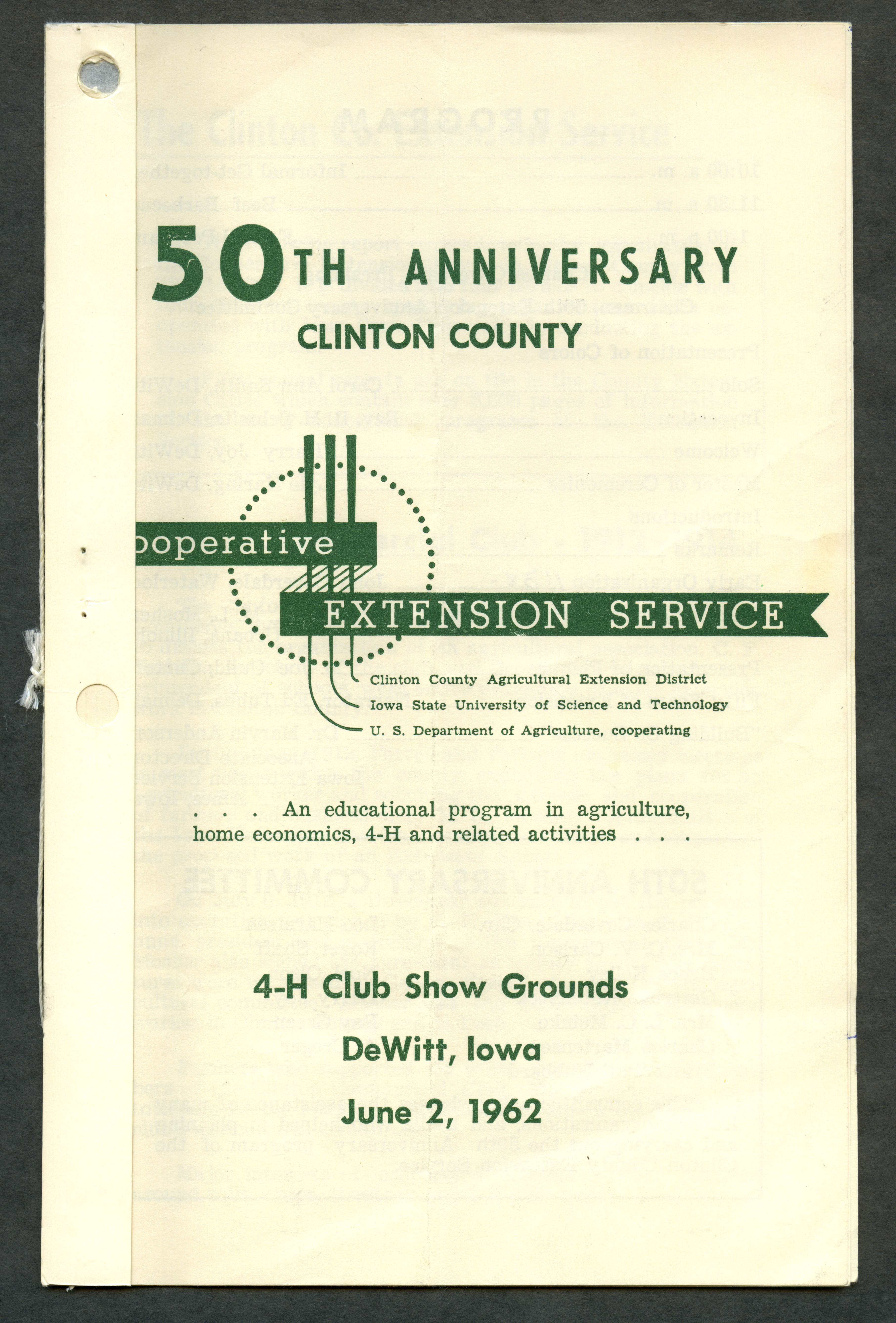 - Contains a 50th Anniversary of Cooperative Extension Service program from the 1962 celebration and an address of Martin L. Mosher's personal recollections about the extension work in Clinton County, Iowa. Part of the address contains thoughts about what the Extension in Clinton County might be like in 2012.