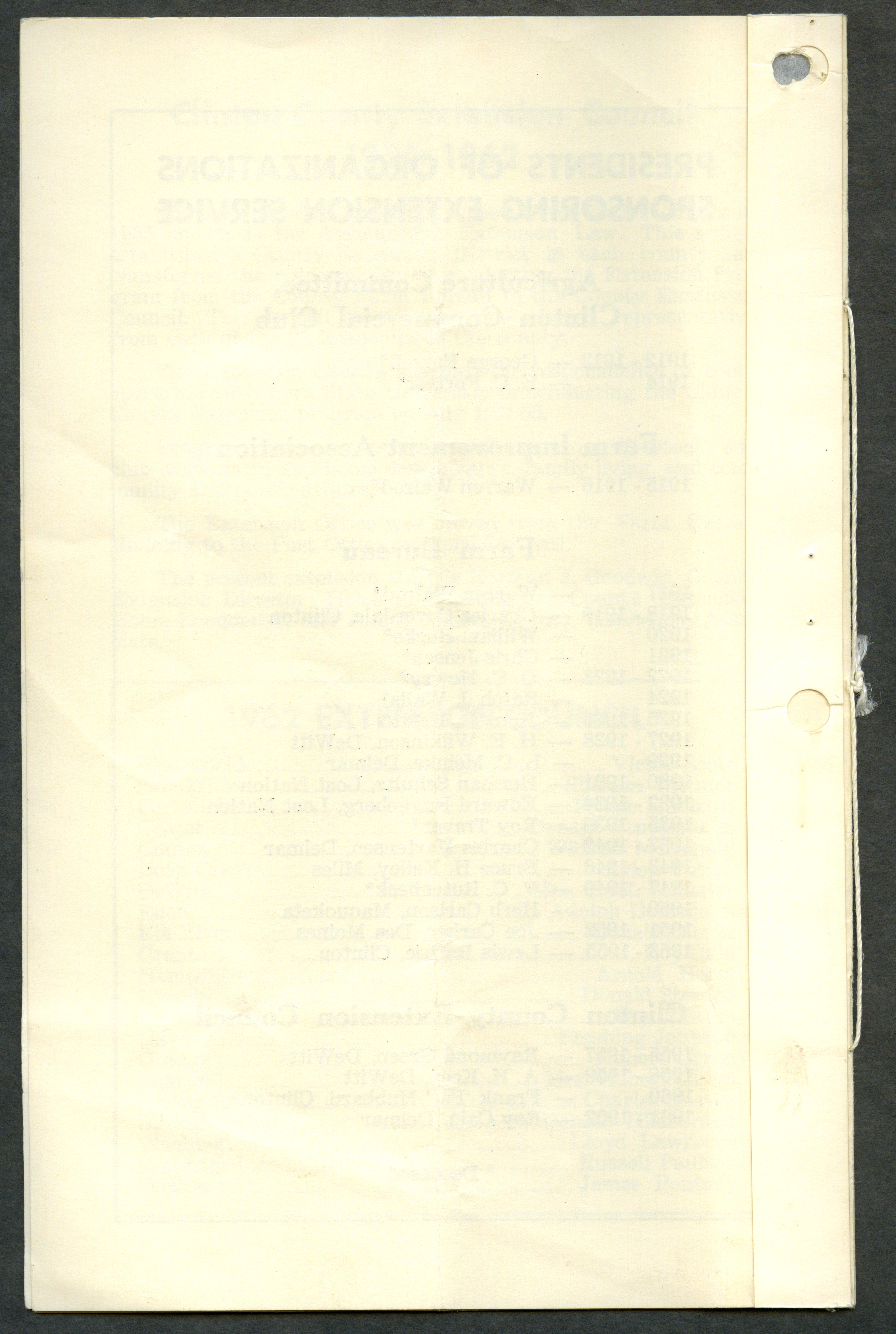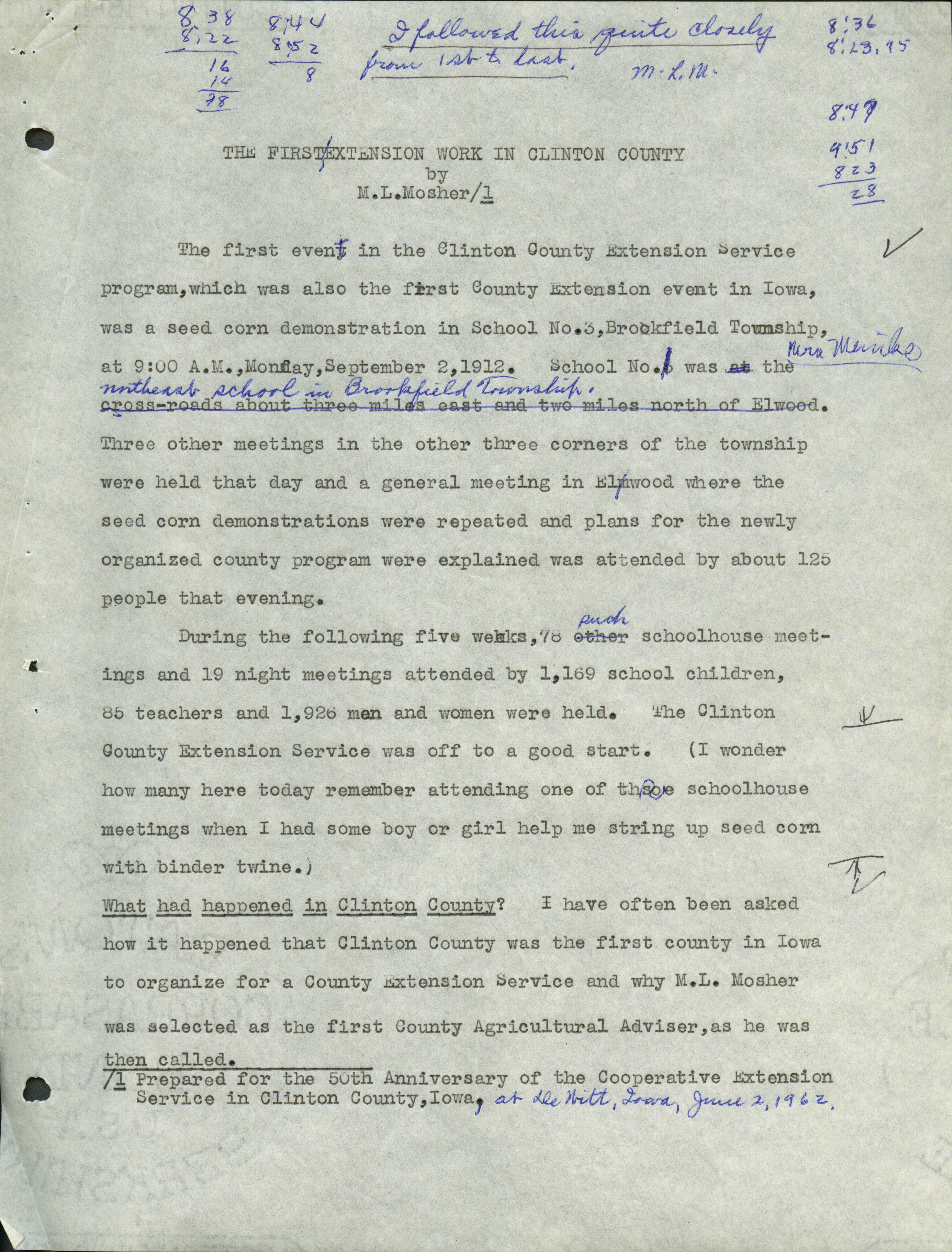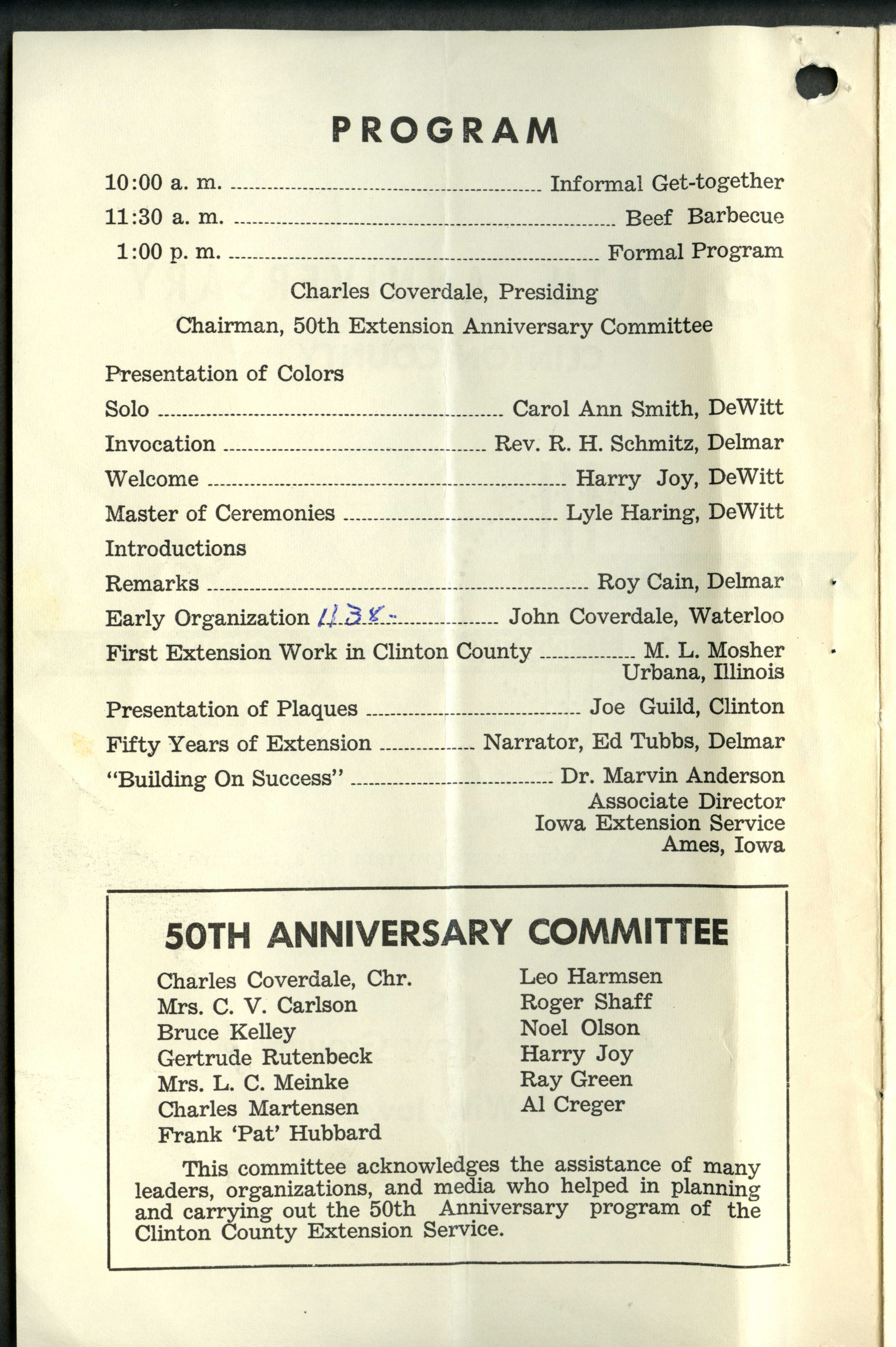 - Contains a 50th Anniversary of Cooperative Extension Service program from the 1962 celebration and an address of Martin L. Mosher's personal recollections about the extension work in Clinton County, Iowa. Part of the address contains thoughts about what the Extension in Clinton County might be like in 2012.
