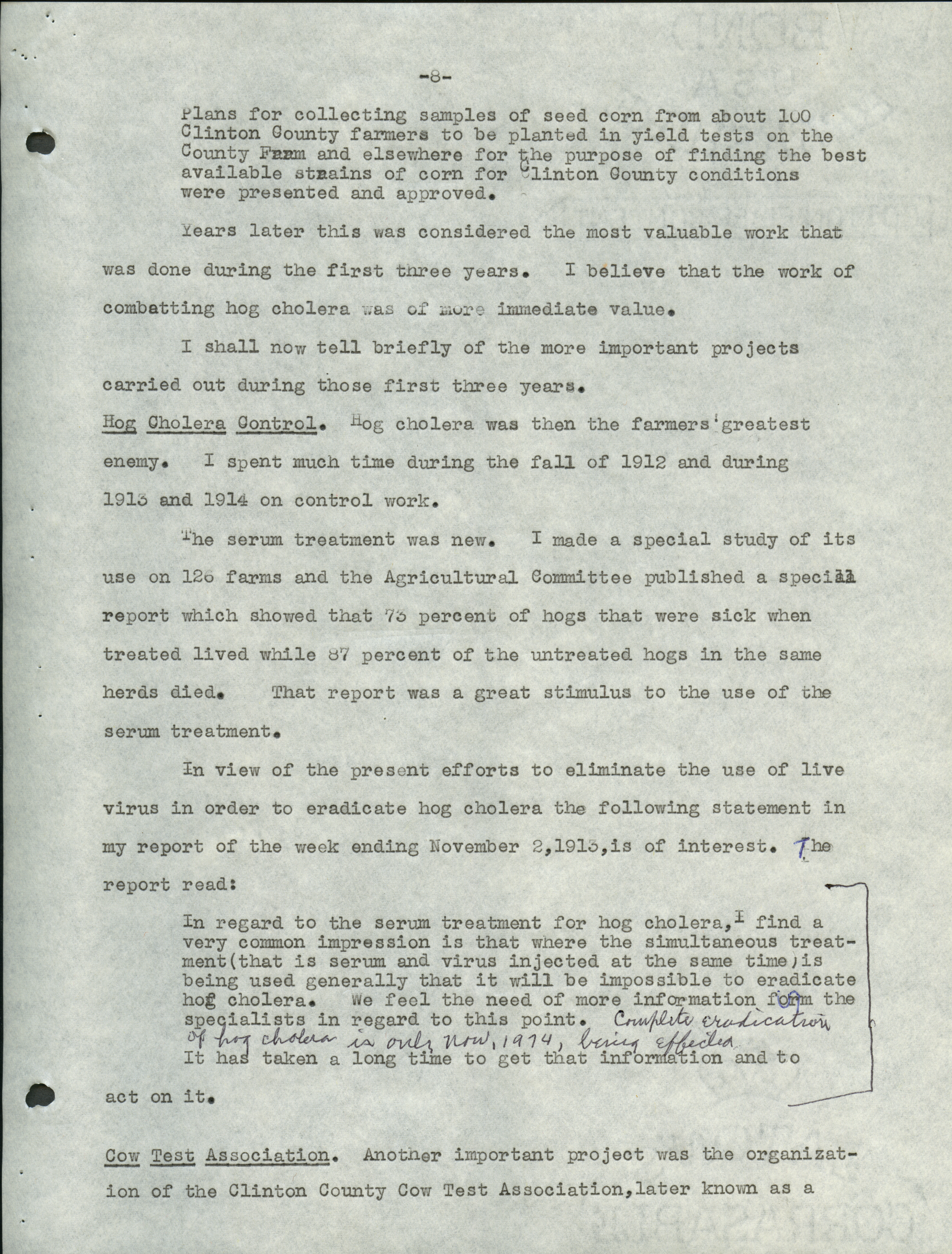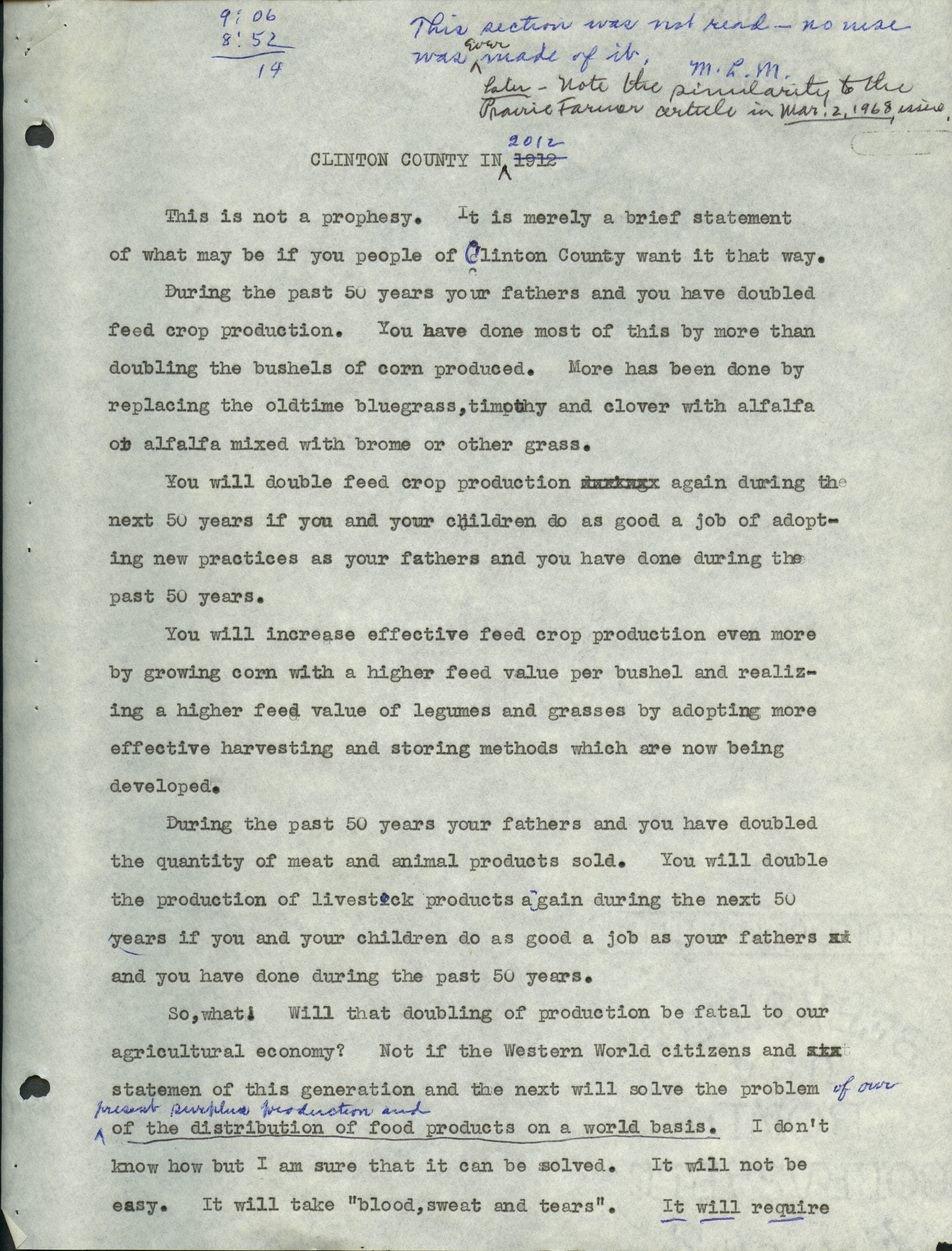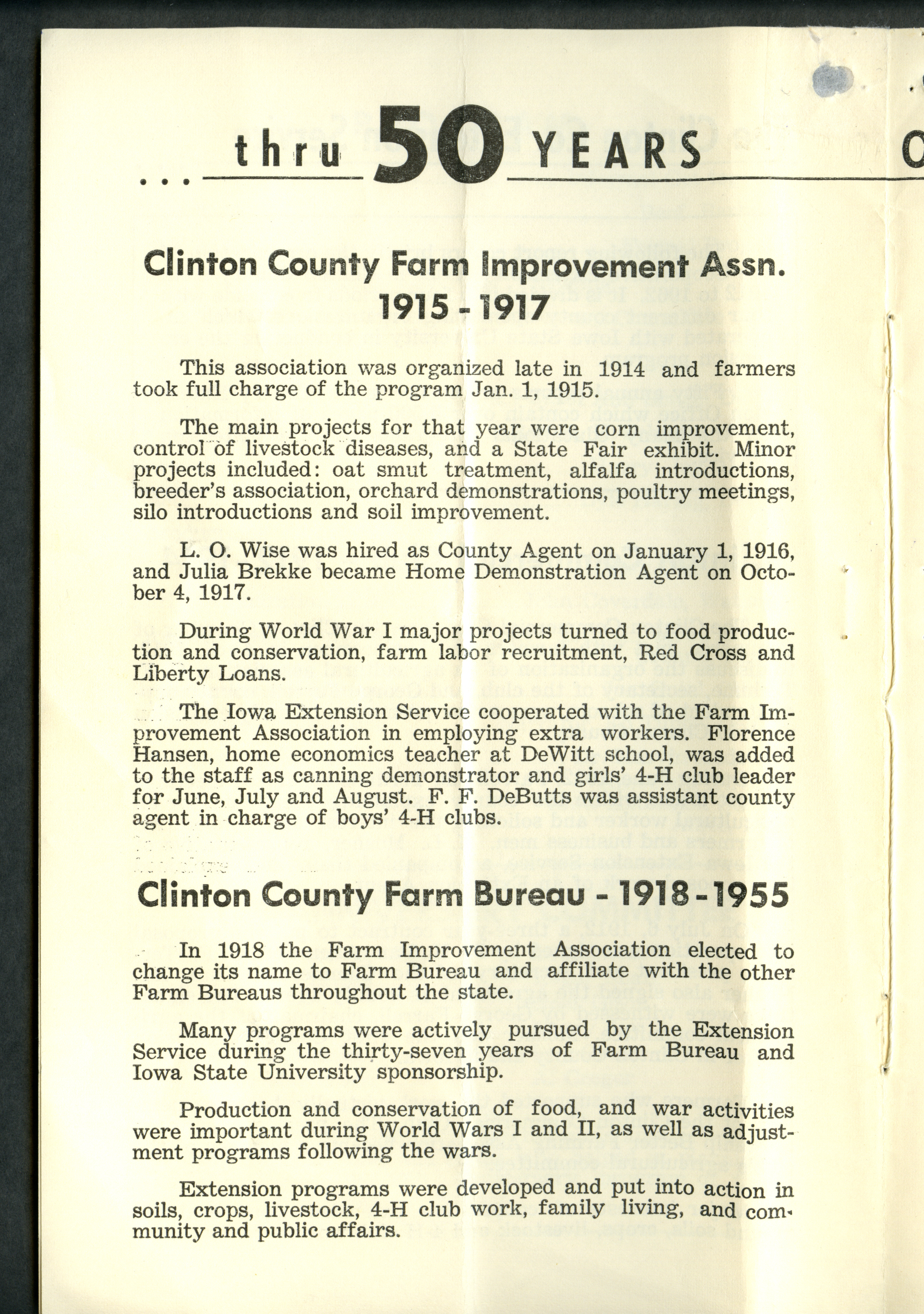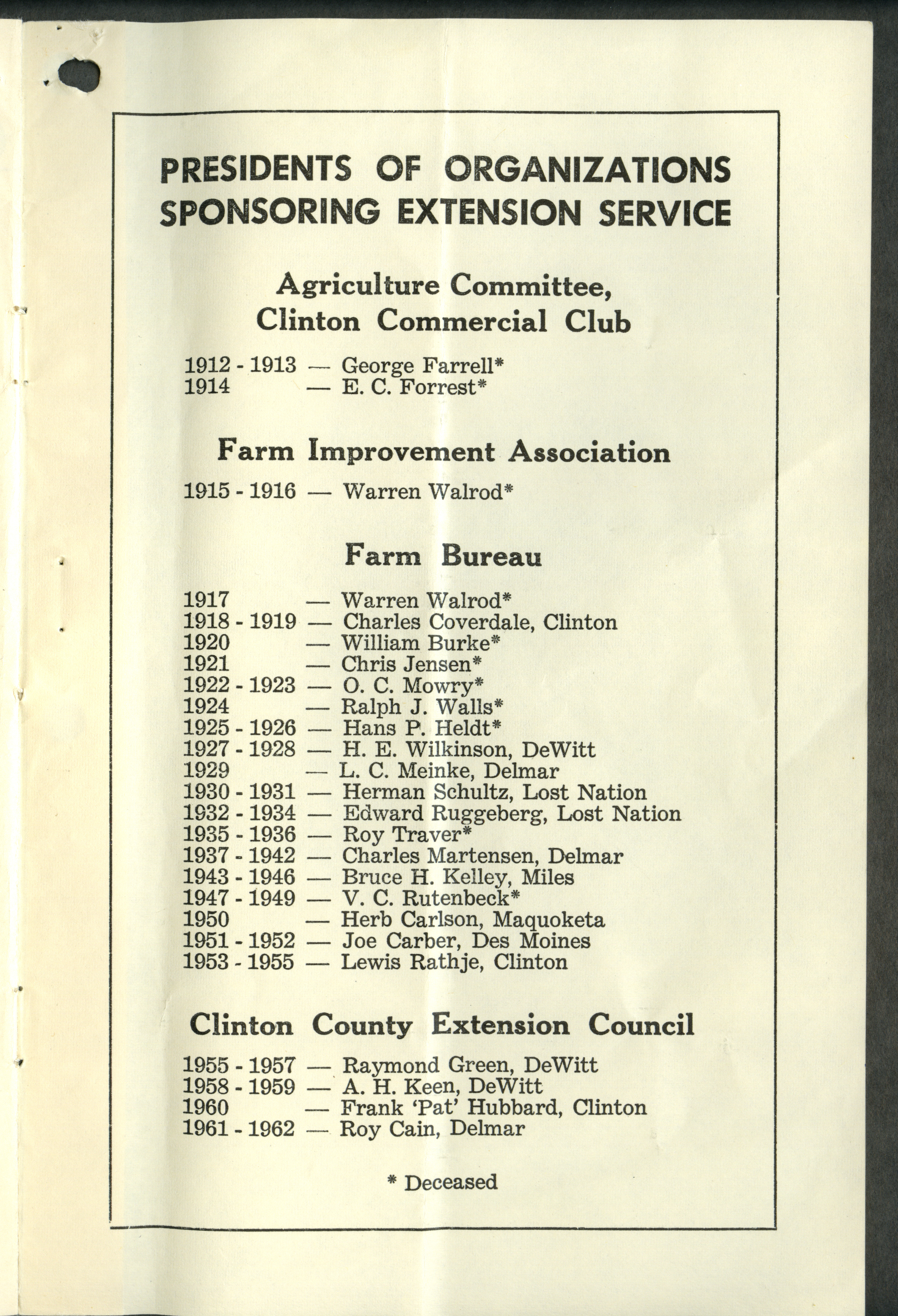 - Contains a 50th Anniversary of Cooperative Extension Service program from the 1962 celebration and an address of Martin L. Mosher's personal recollections about the extension work in Clinton County, Iowa. Part of the address contains thoughts about what the Extension in Clinton County might be like in 2012.