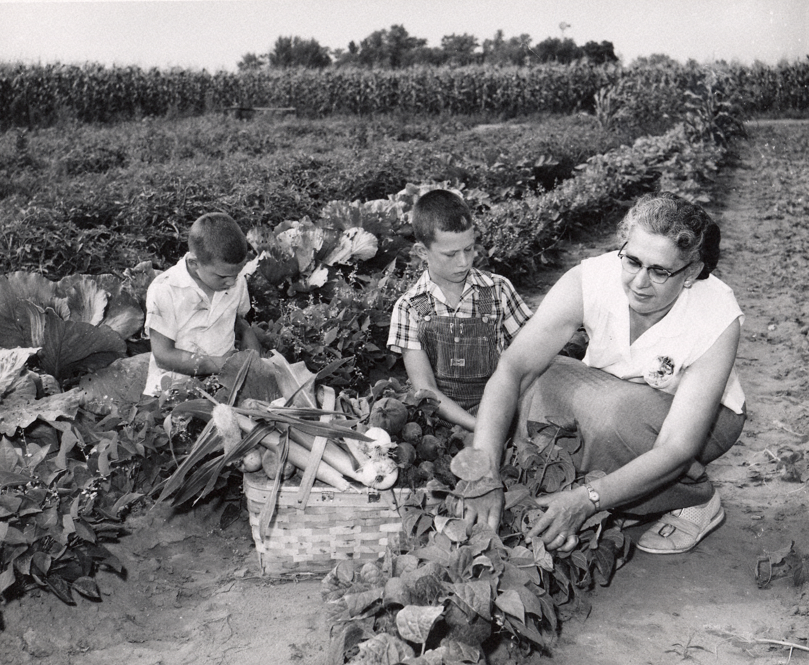 - Photograph of two children and a woman picking crops in a farm garden in Wright County, Iowa.