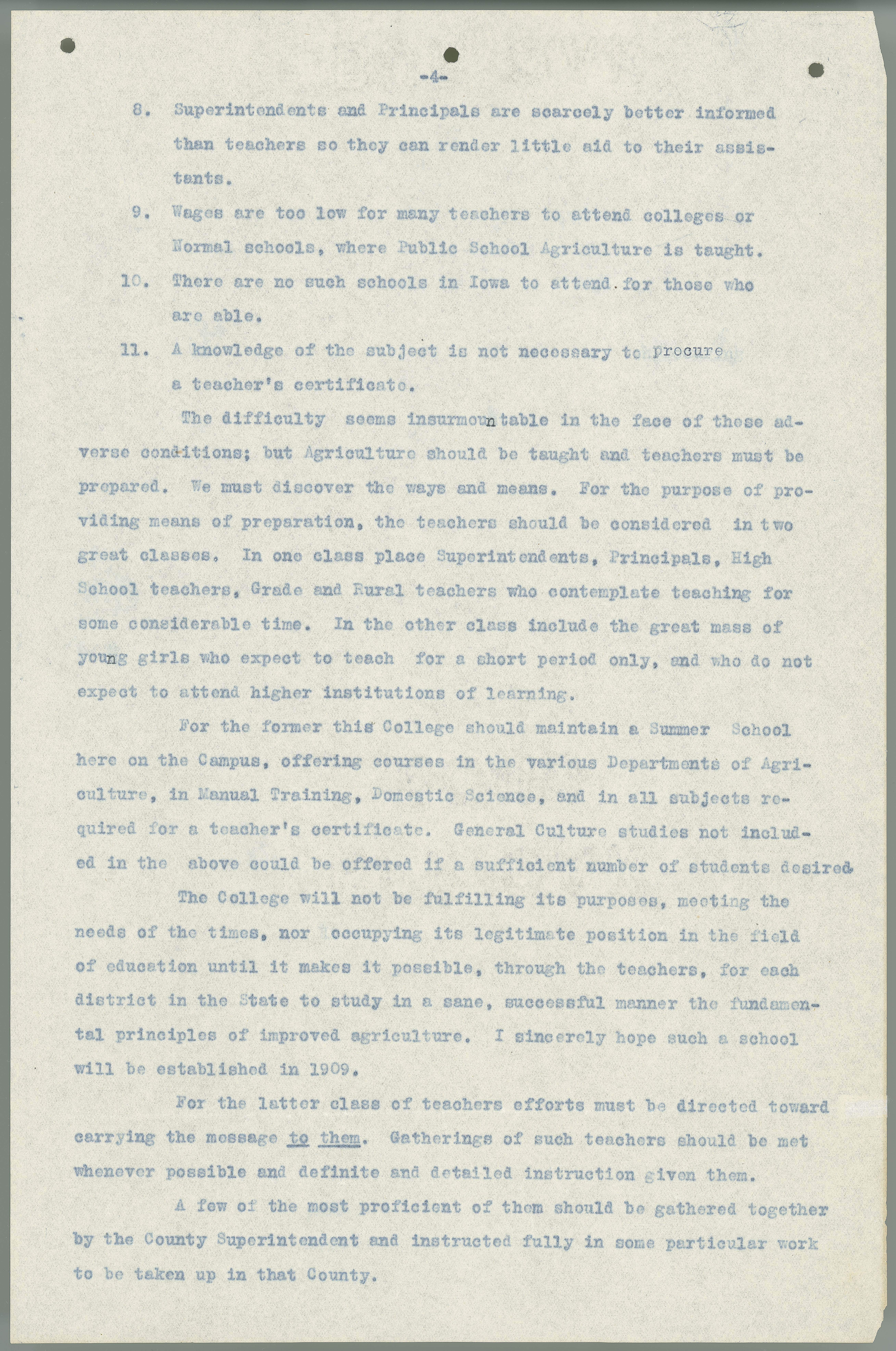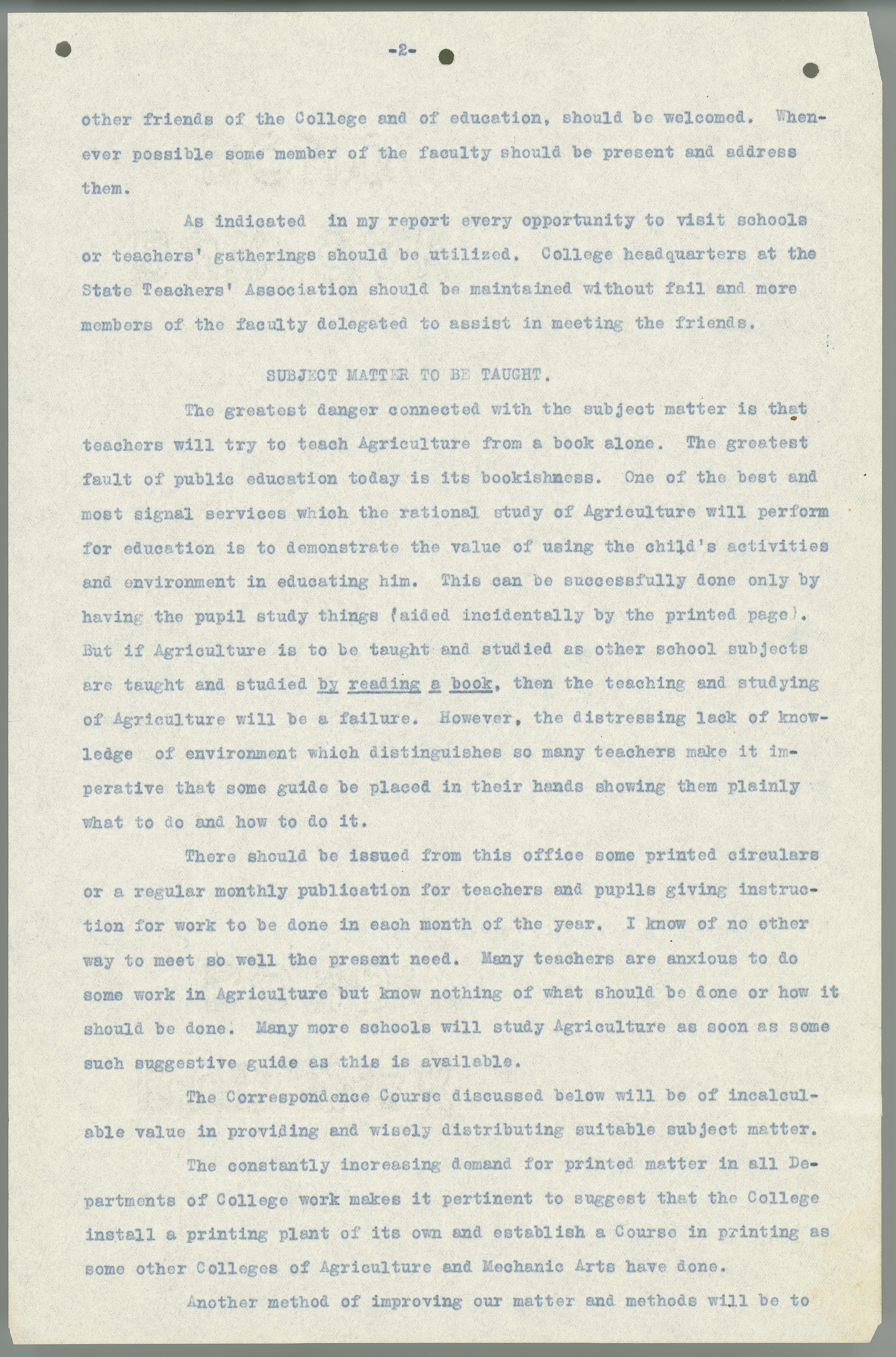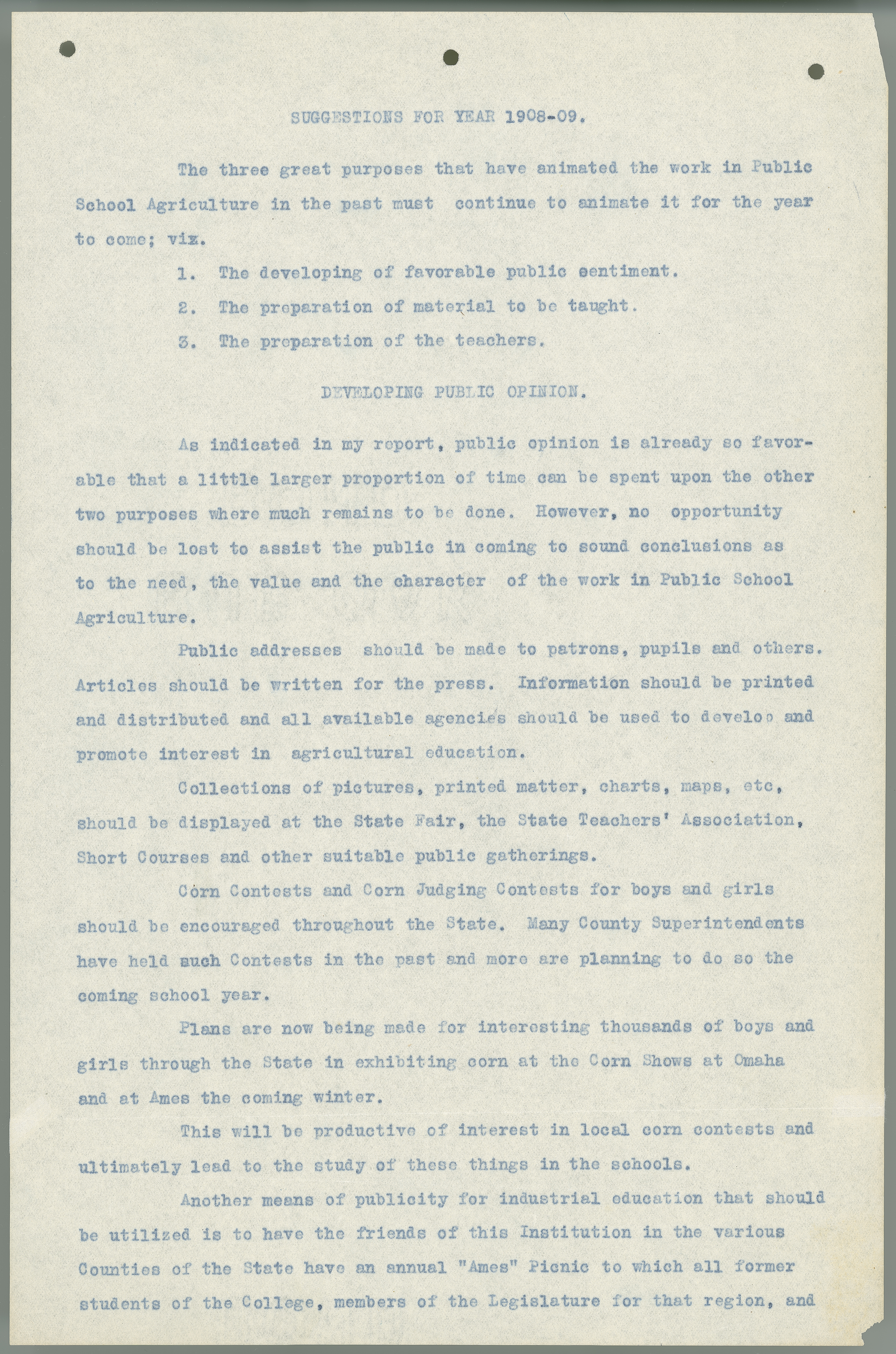 - A plan of work for 1908-1909 that includes ideas for promotion of public school agriculture, subject matter to be taught, preparing teachers, summer school, and correspondence school.