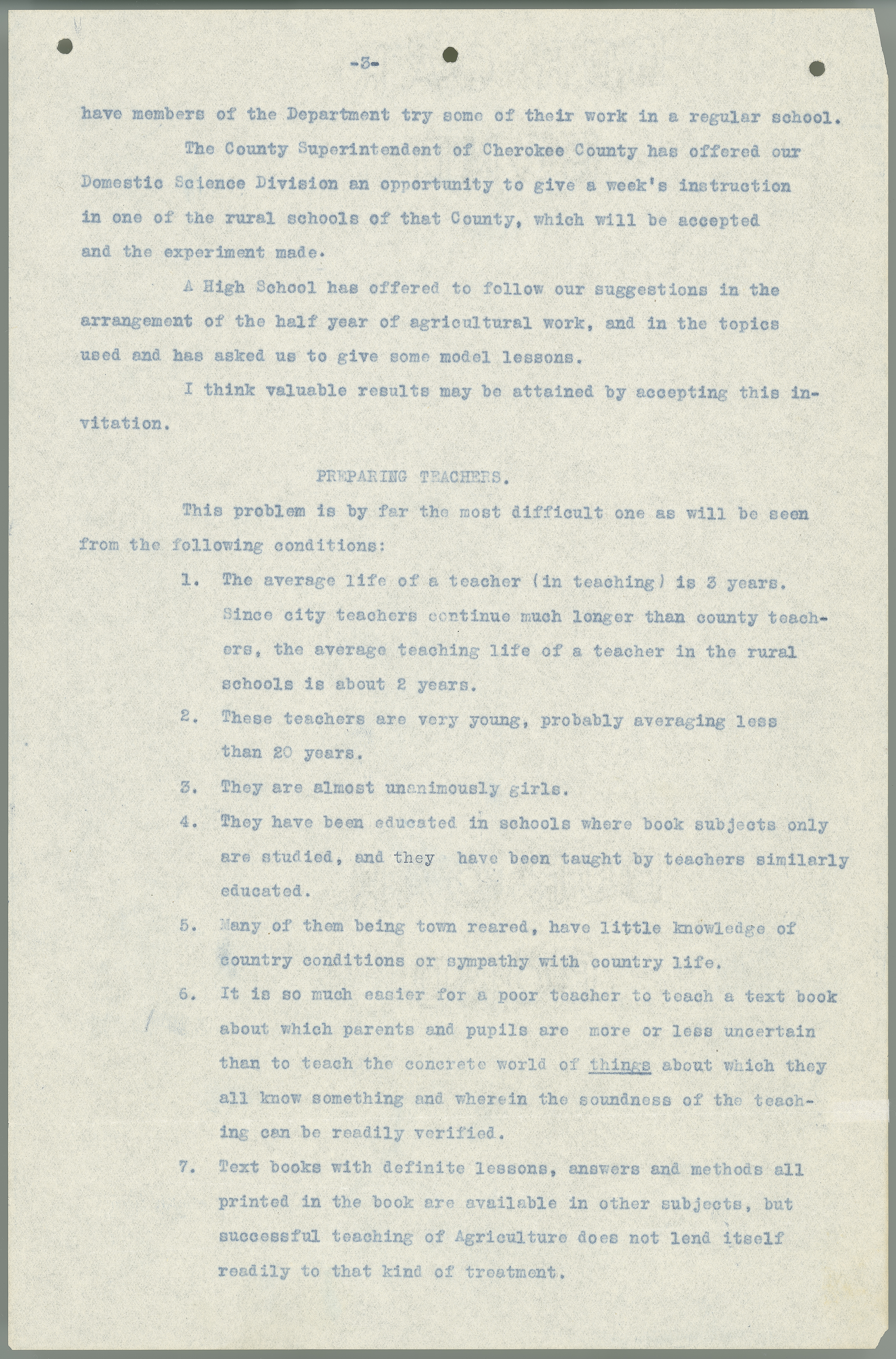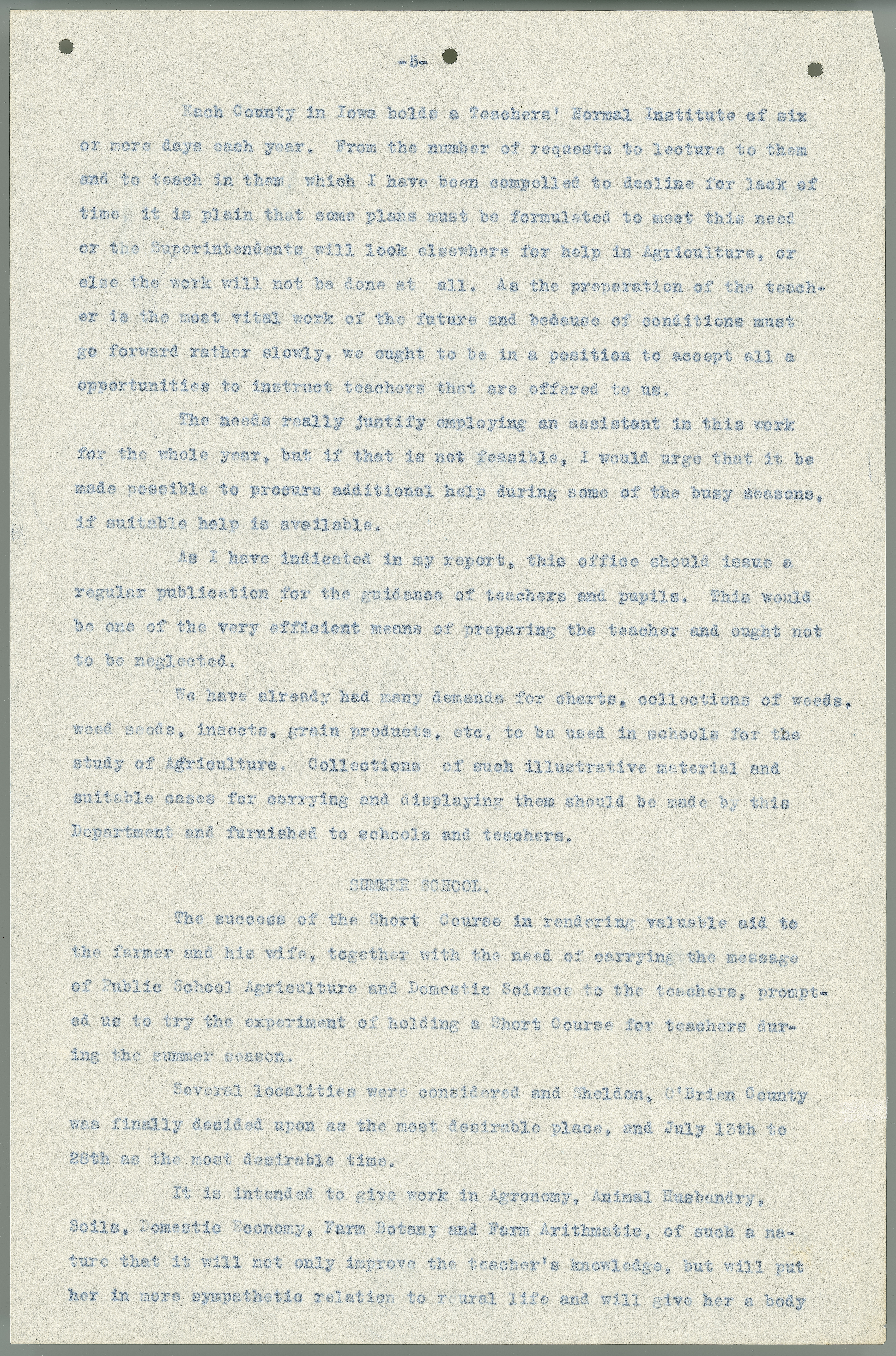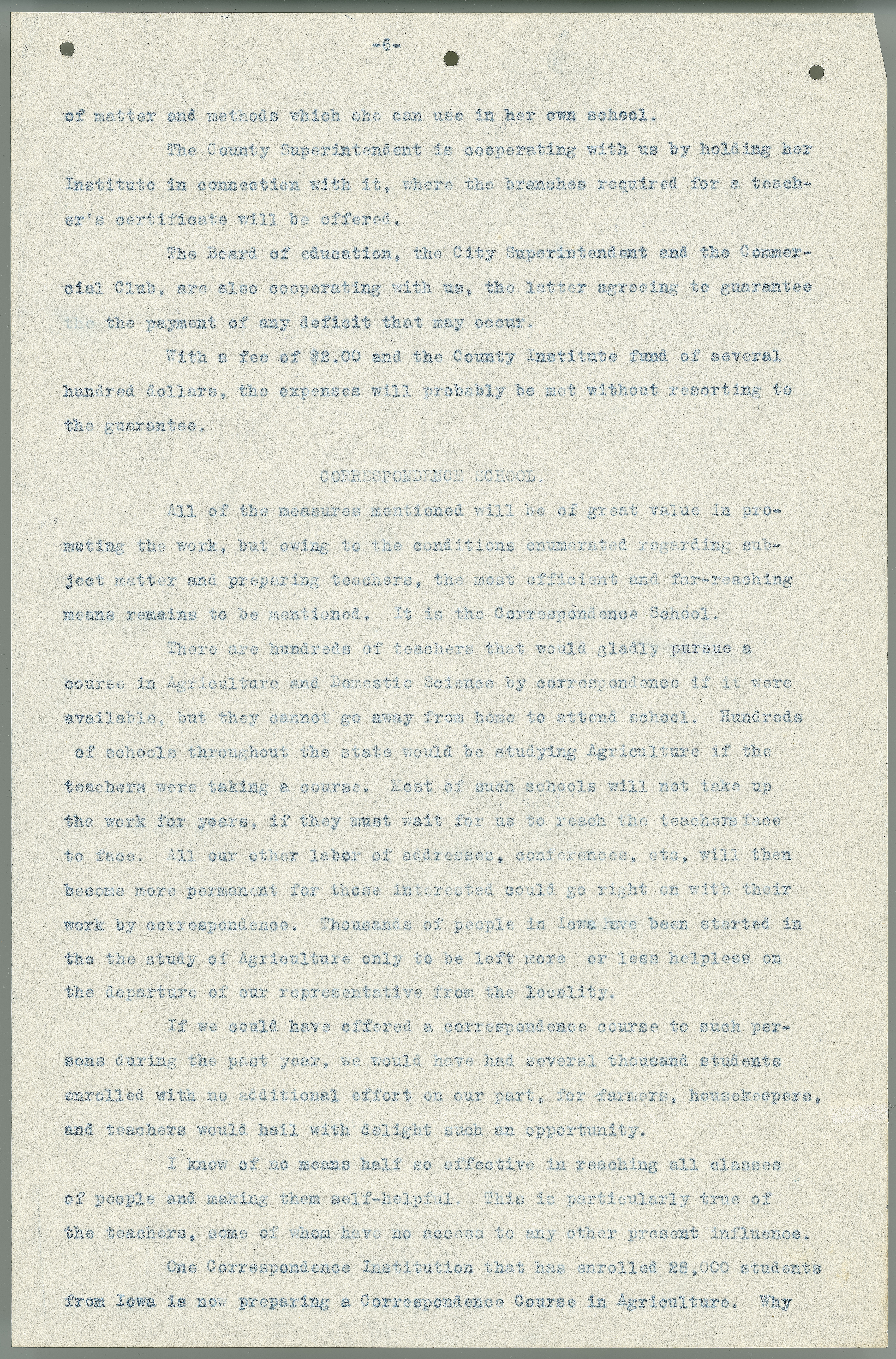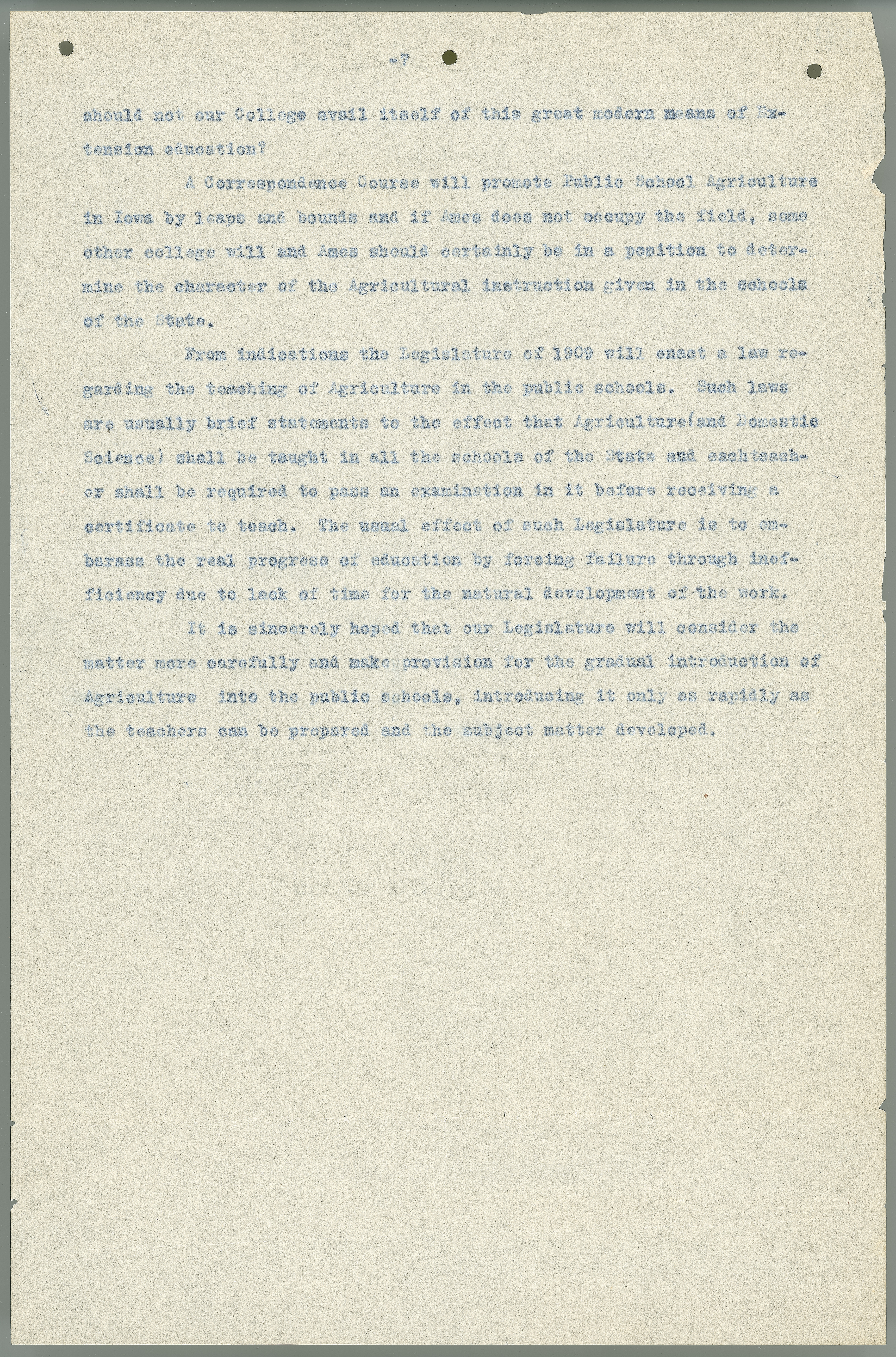 - A plan of work for 1908-1909 that includes ideas for promotion of public school agriculture, subject matter to be taught, preparing teachers, summer school, and correspondence school.