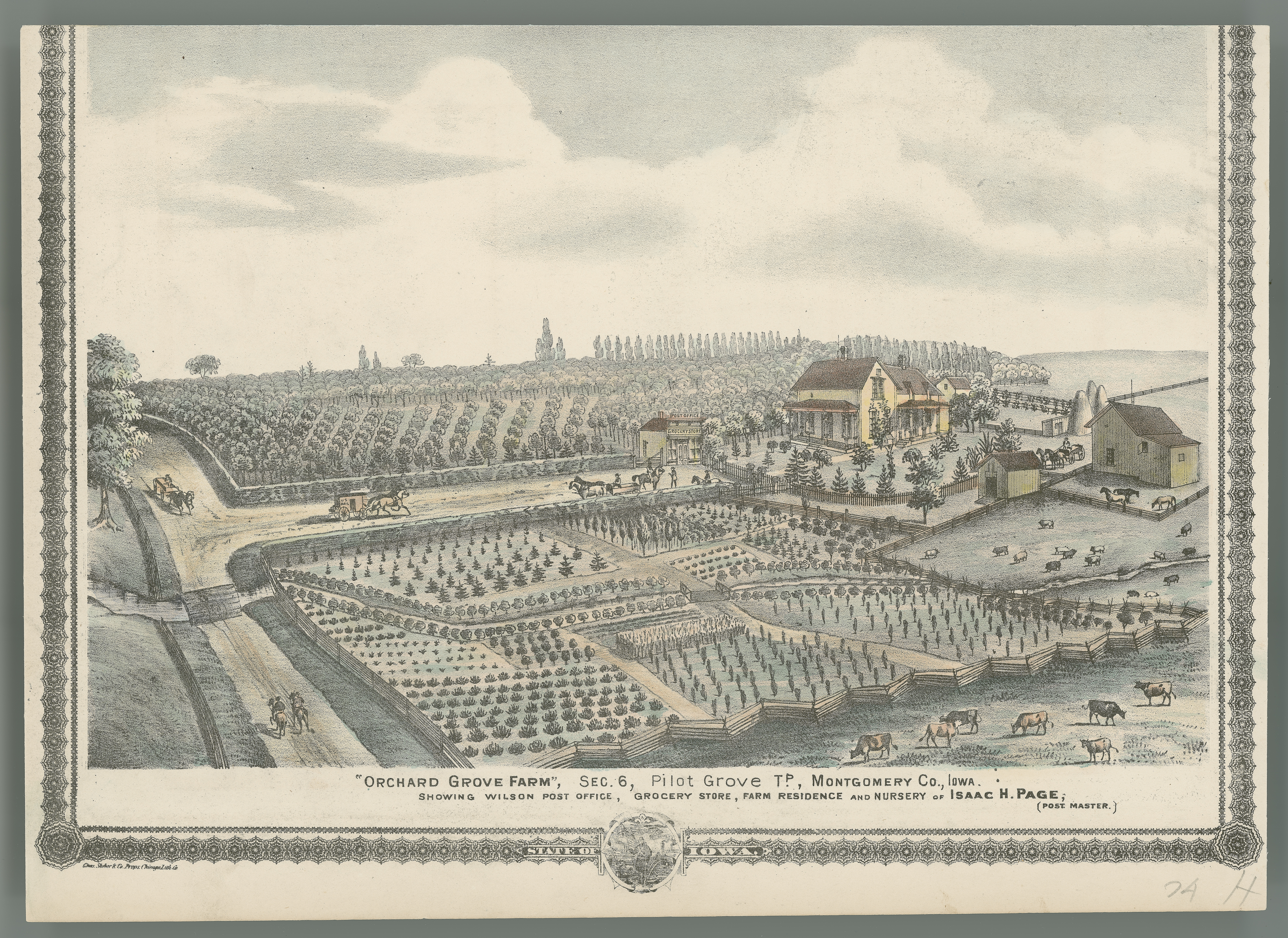 - Illustration of Orchard Grove Farm, including Wilson Post Office, a grocery store, and the farm residence and nursery of Isaac H. Page, postmaster. Published in A. T. Andreas, Illustrated Historical Atlas of the State of Iowa, Chicago: Andreas Atlas Co., 1875.