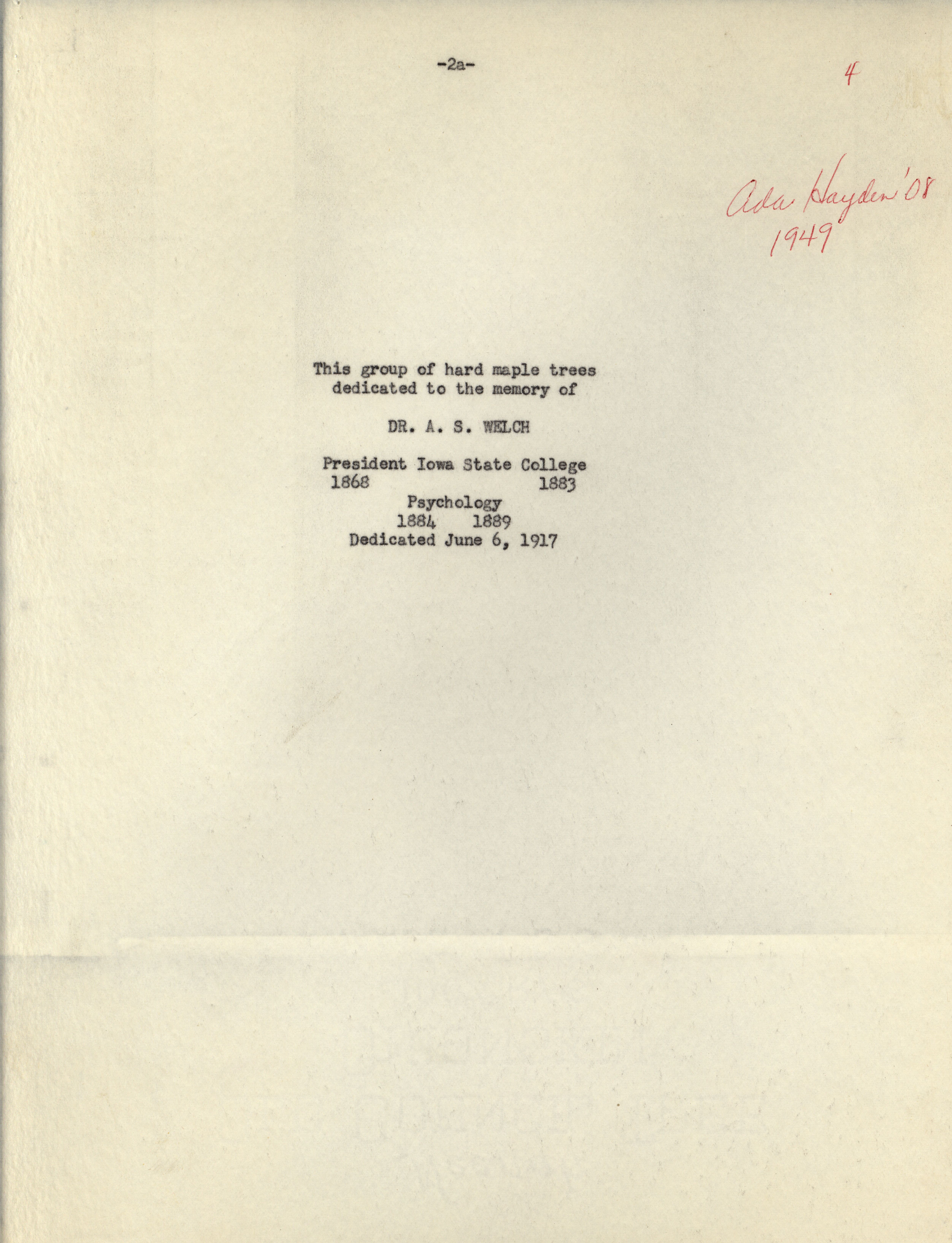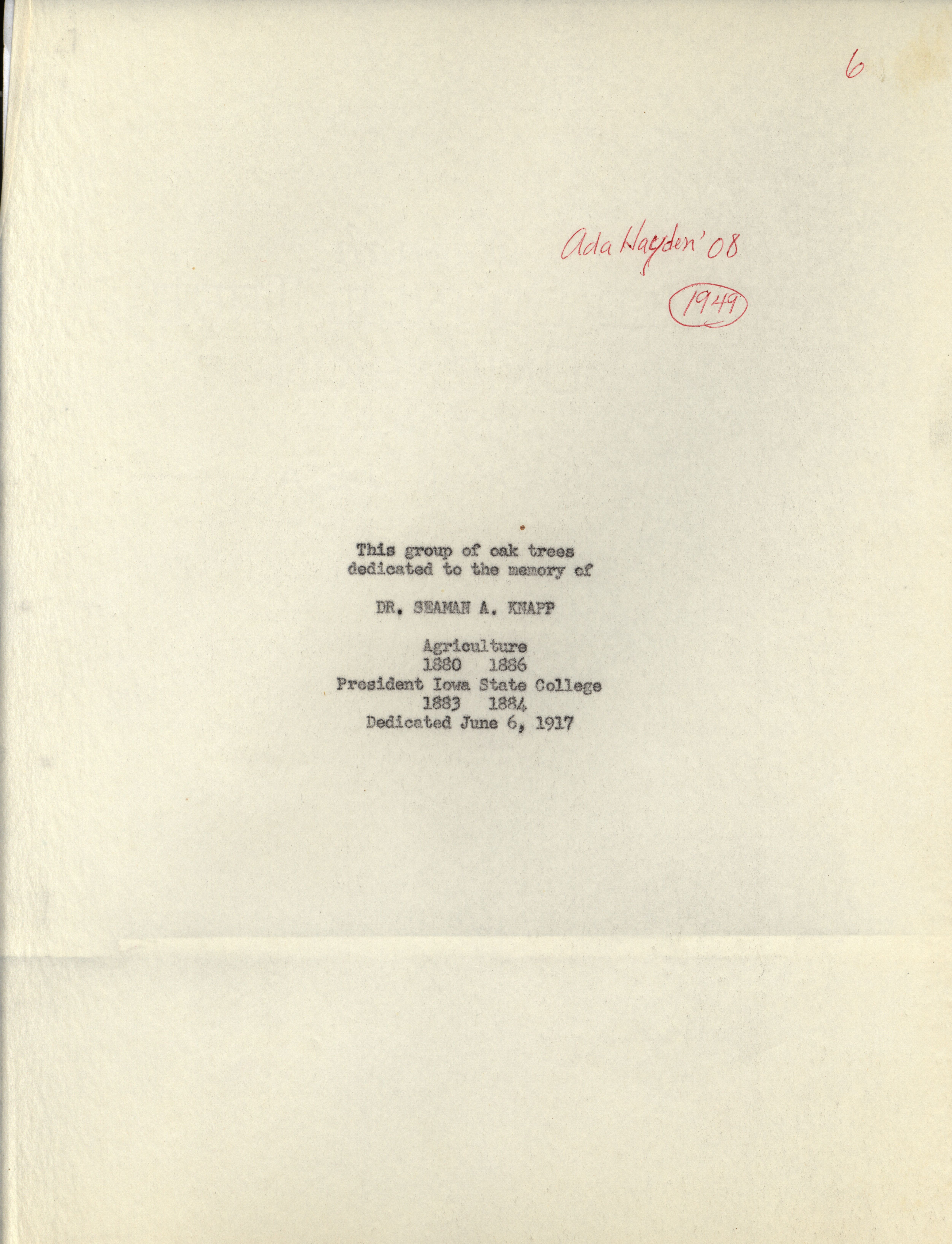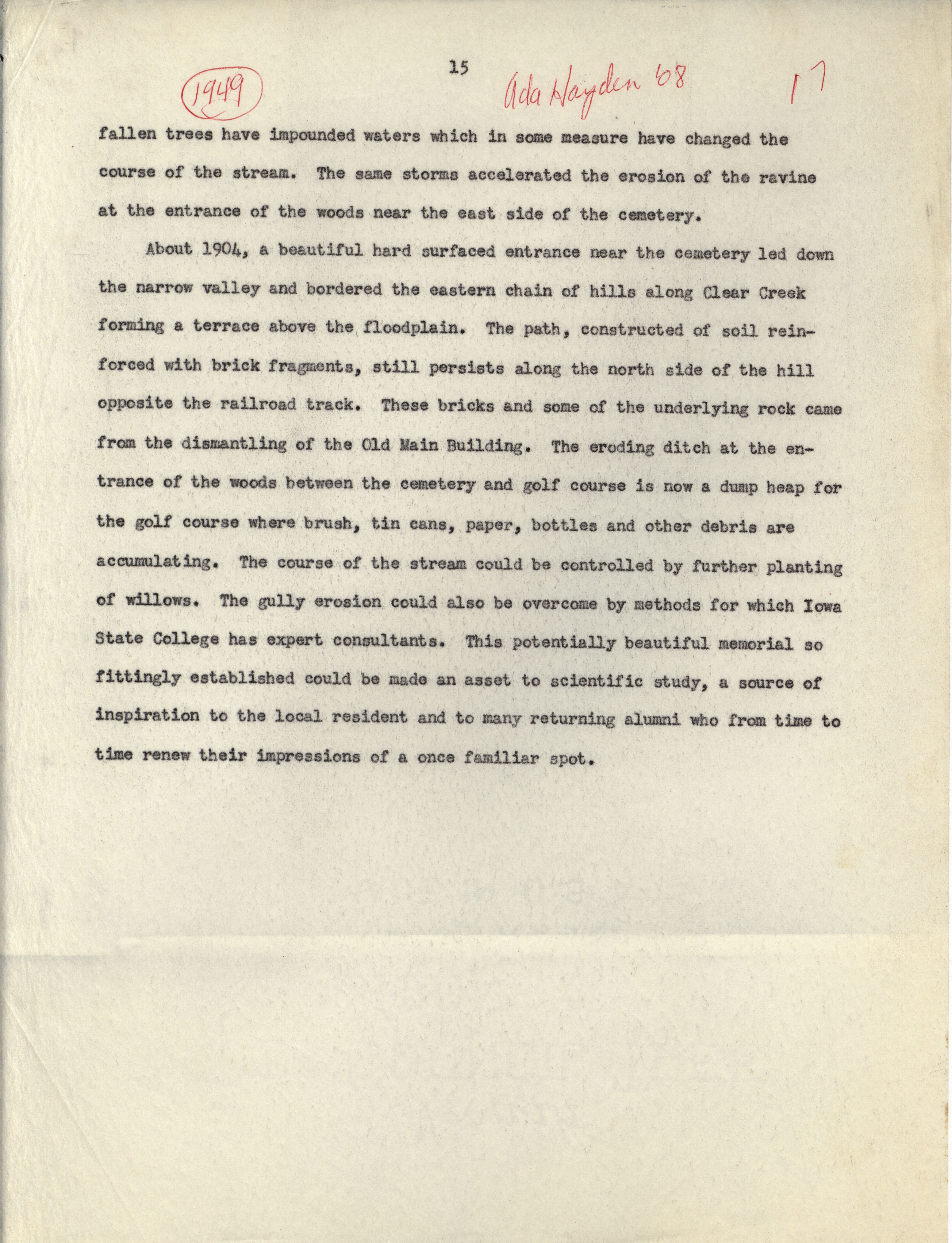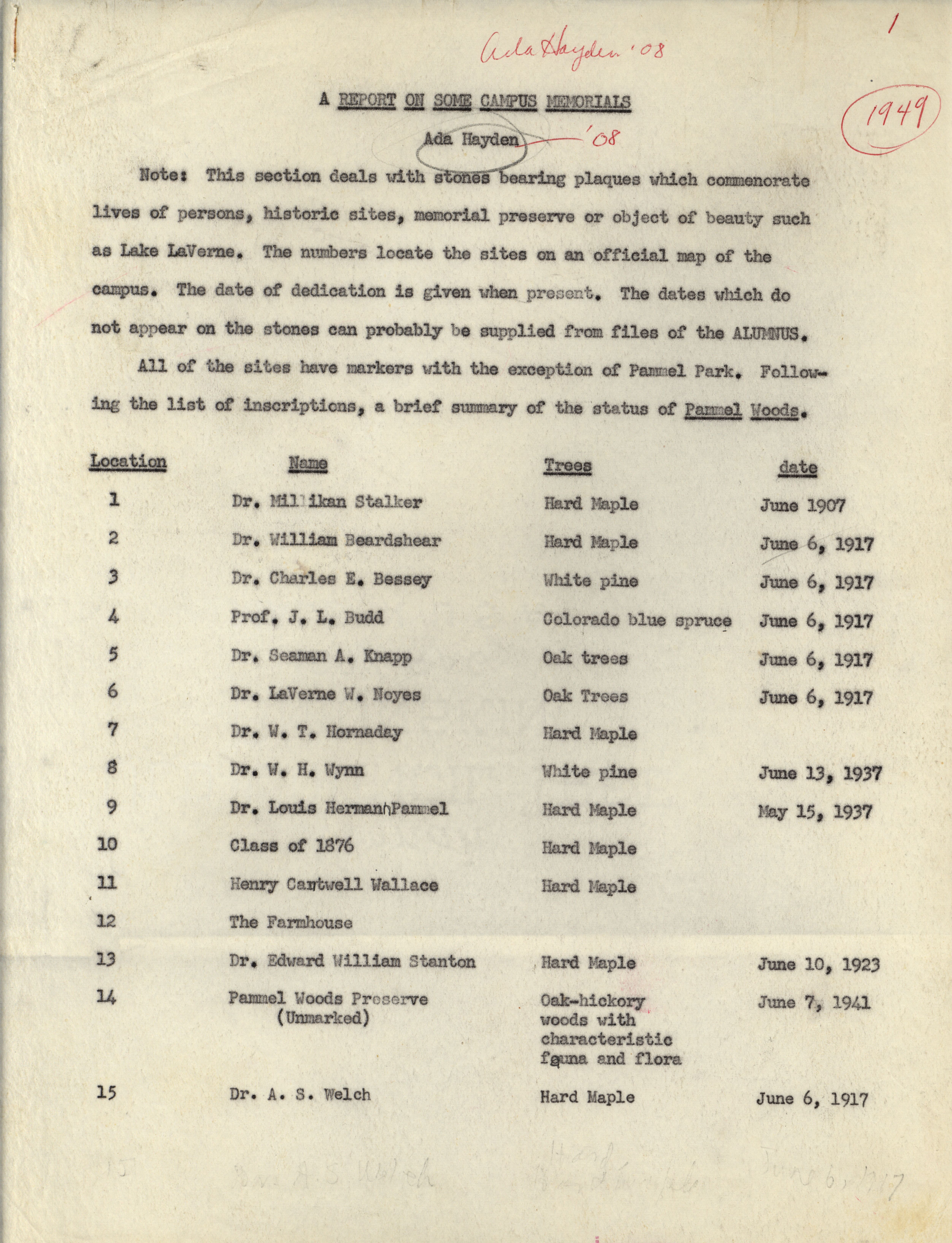 - Report written by Ada Hayden entitled, "A Report on Some Campus Memorials." Describes the stones and plaques found across Iowa State University's campus commemorating people, sites or objects from 1949.