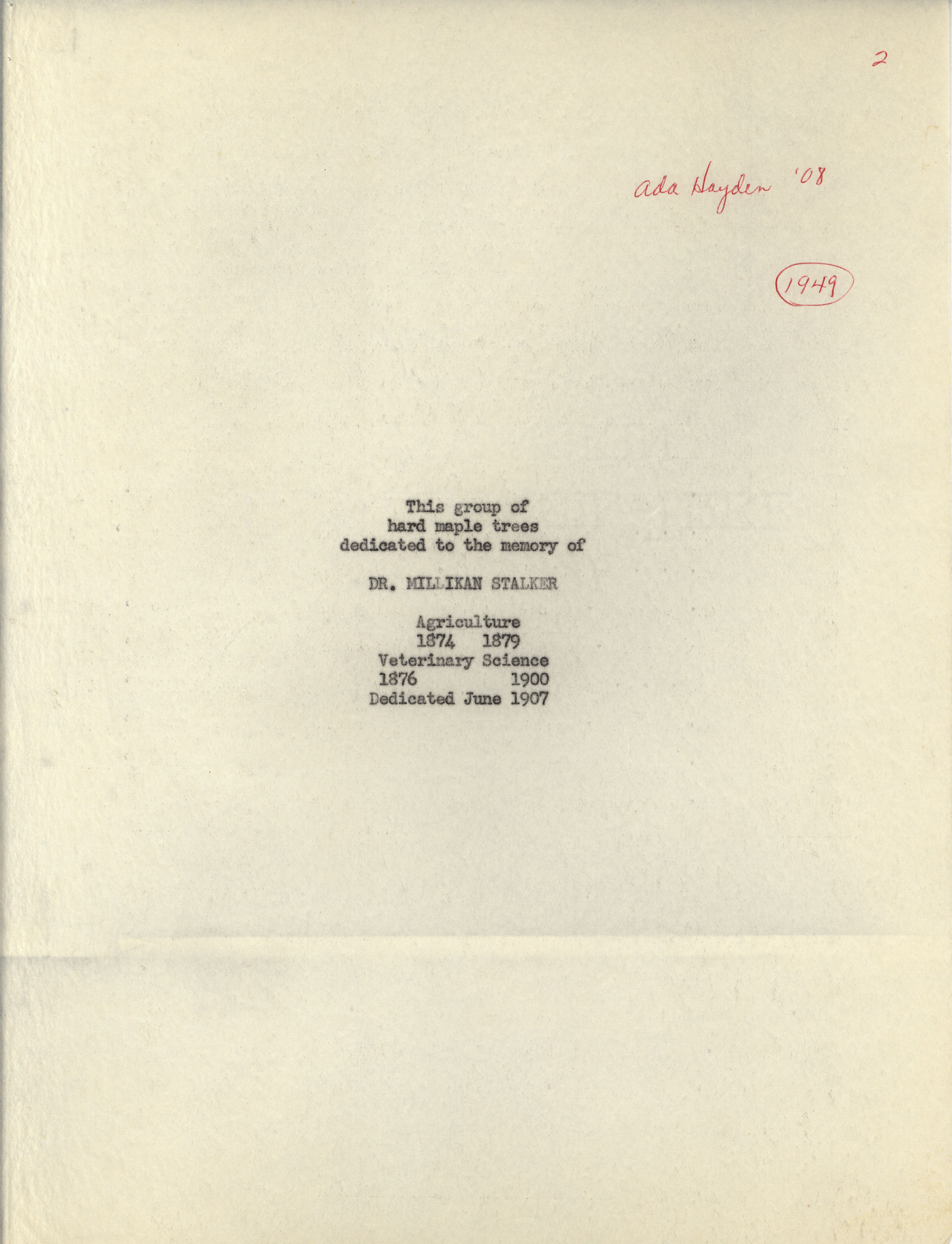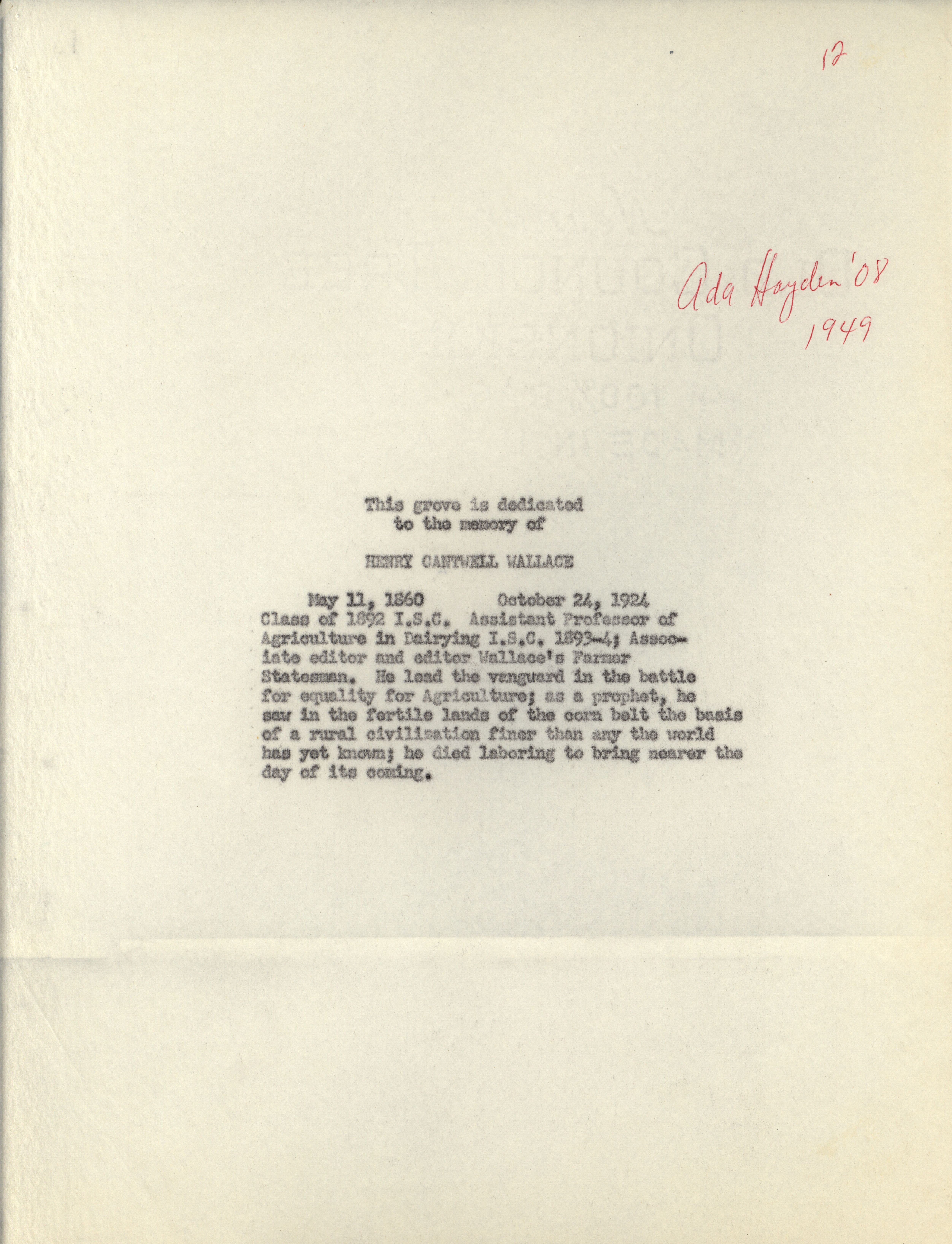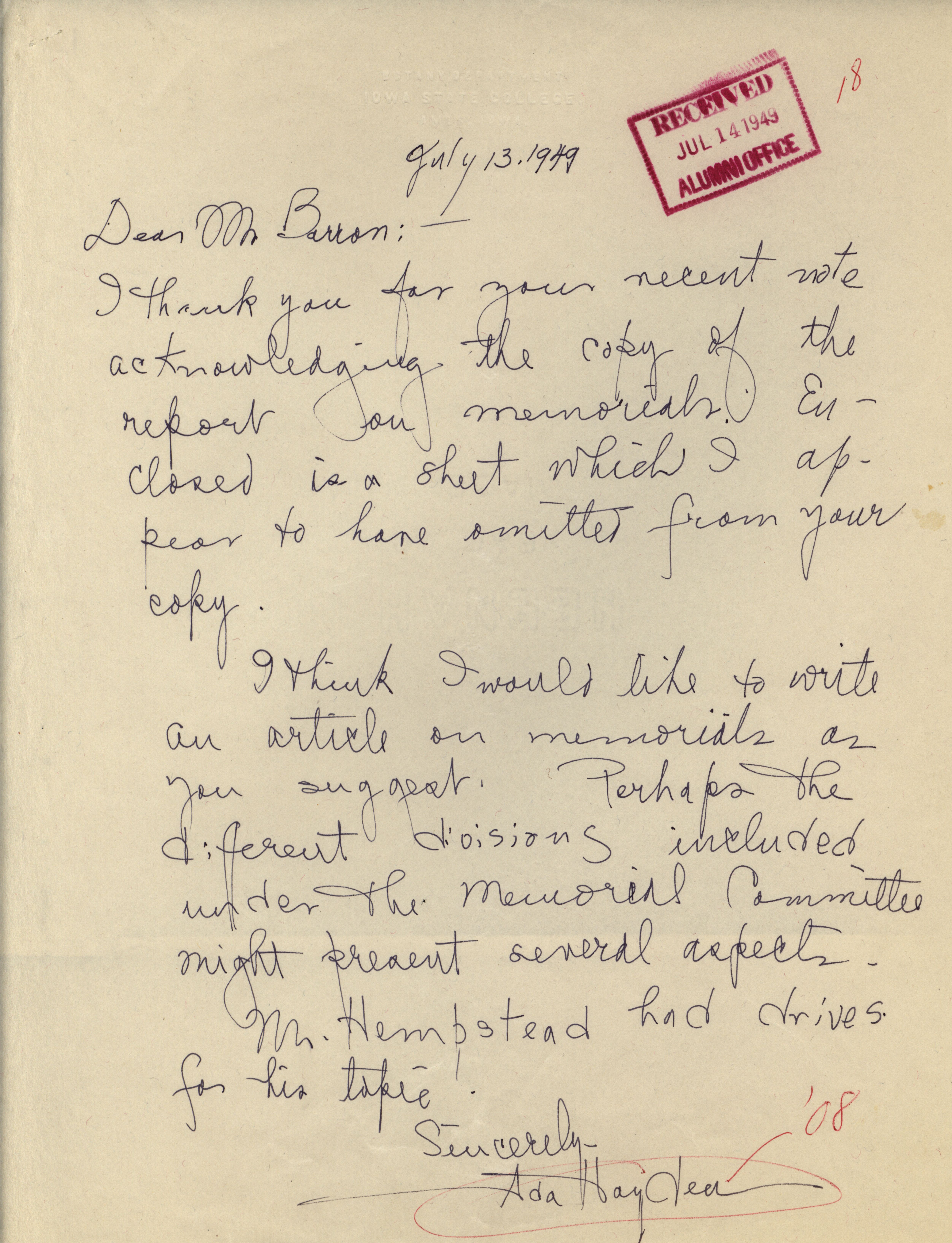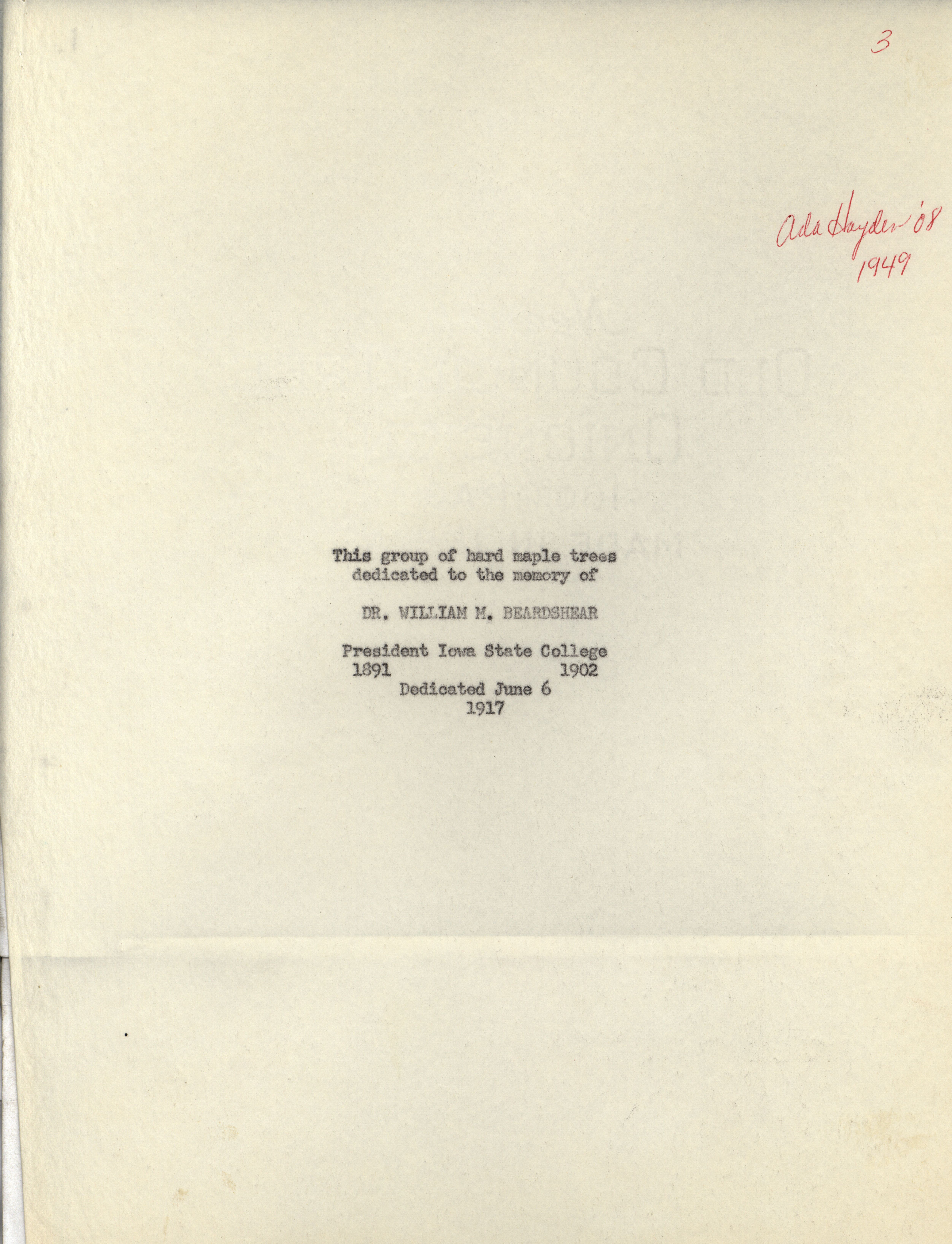 - Report written by Ada Hayden entitled, "A Report on Some Campus Memorials." Describes the stones and plaques found across Iowa State University's campus commemorating people, sites or objects from 1949.