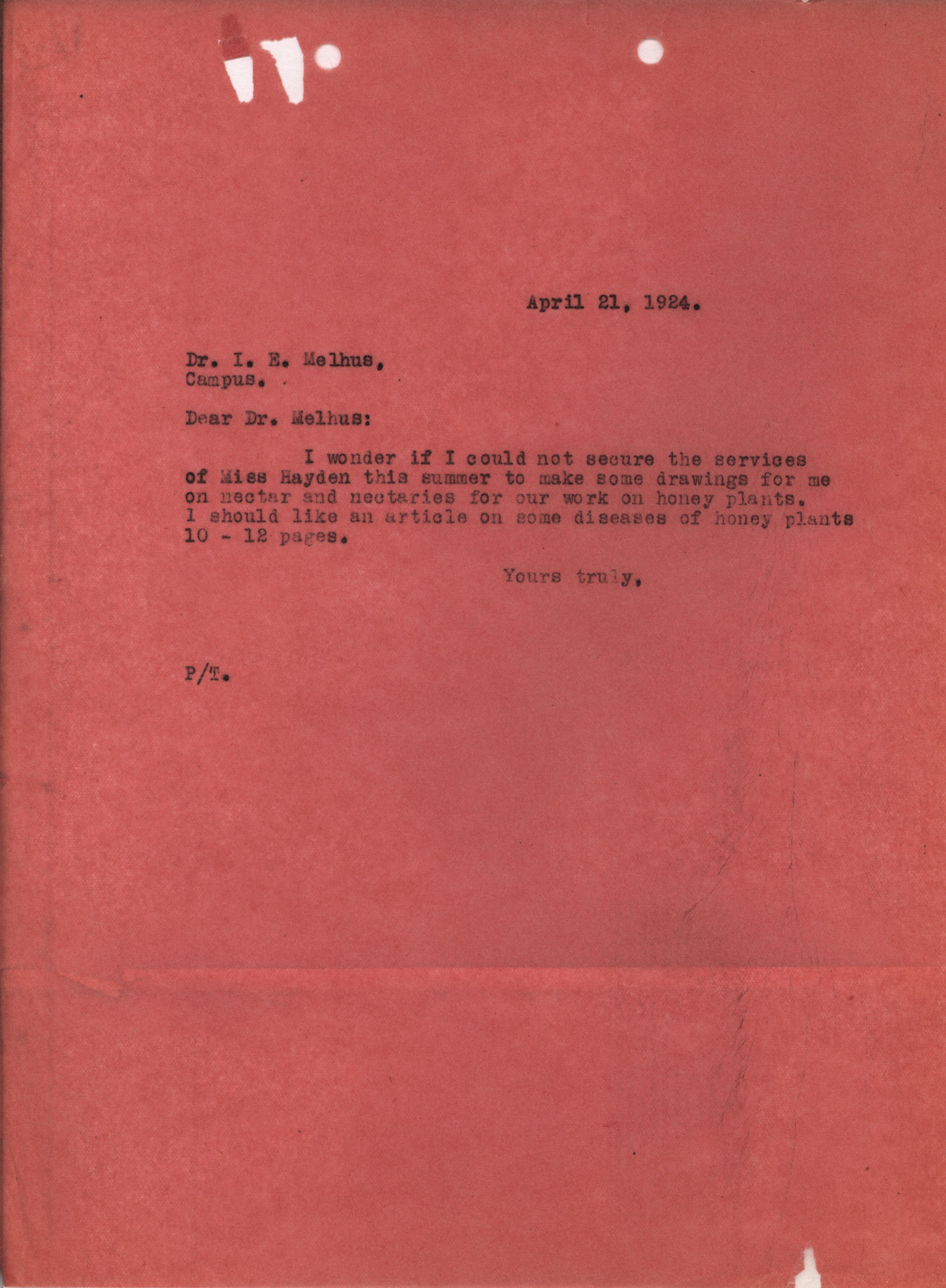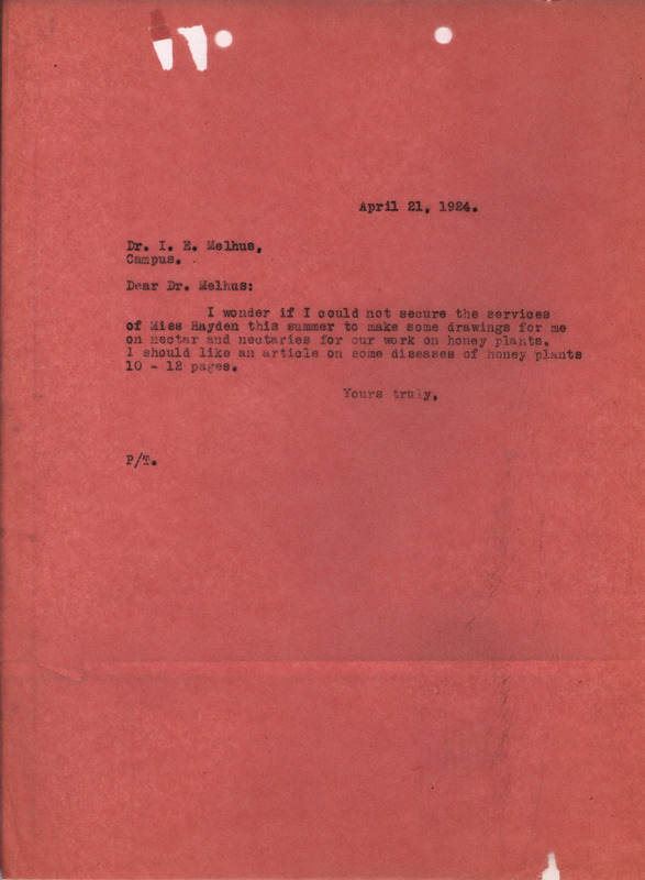 - Letter from Louis Hermann Pammel to I. E. Melhus, requesting that Ada Hayden to create drawings of honey plants.
