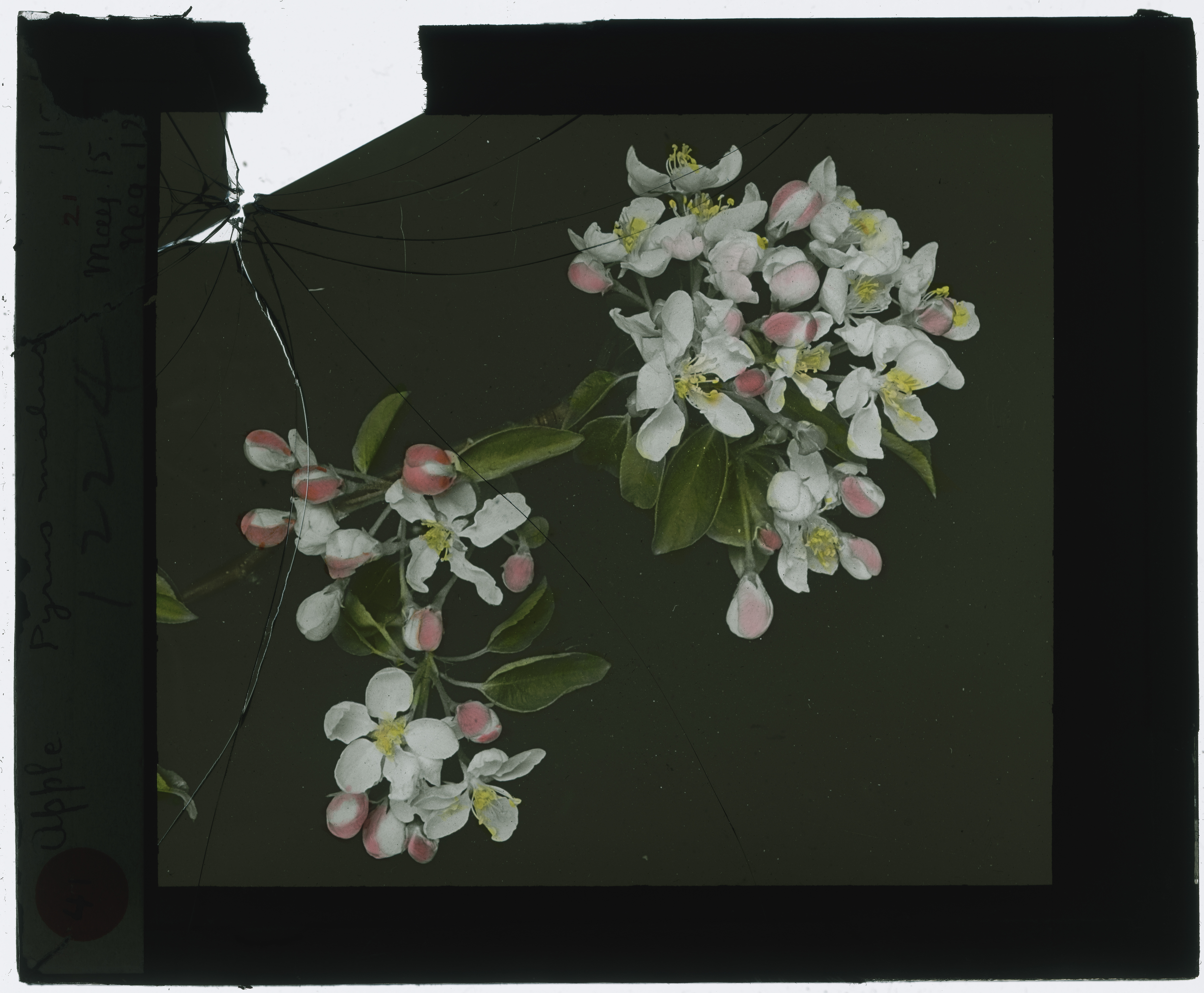 - Malus domestica (Apple blossoms) specimen (hand colored), including flowers and plants, no negative number. Broken.