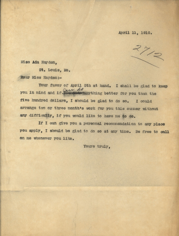 - Letter from Louis Hermann Pammel to Ada Hayden, offering to give a personal recommendation for Hayden's applications for jobs.