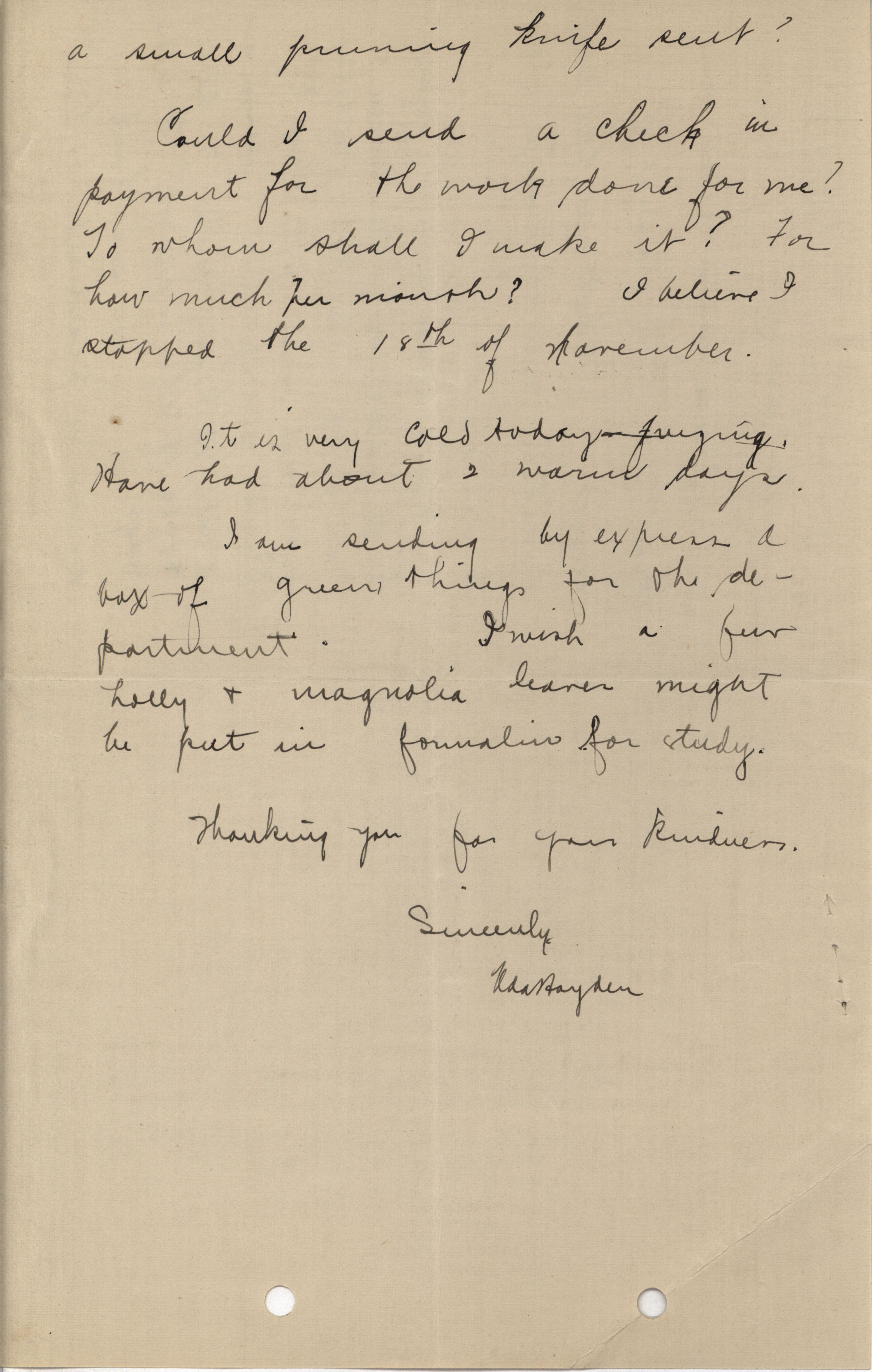 - Letter from Ada Hayden to Louis Hermann Pammel, describing her work in Houston, Texas and inquiring about payment for some work she did in Ames.