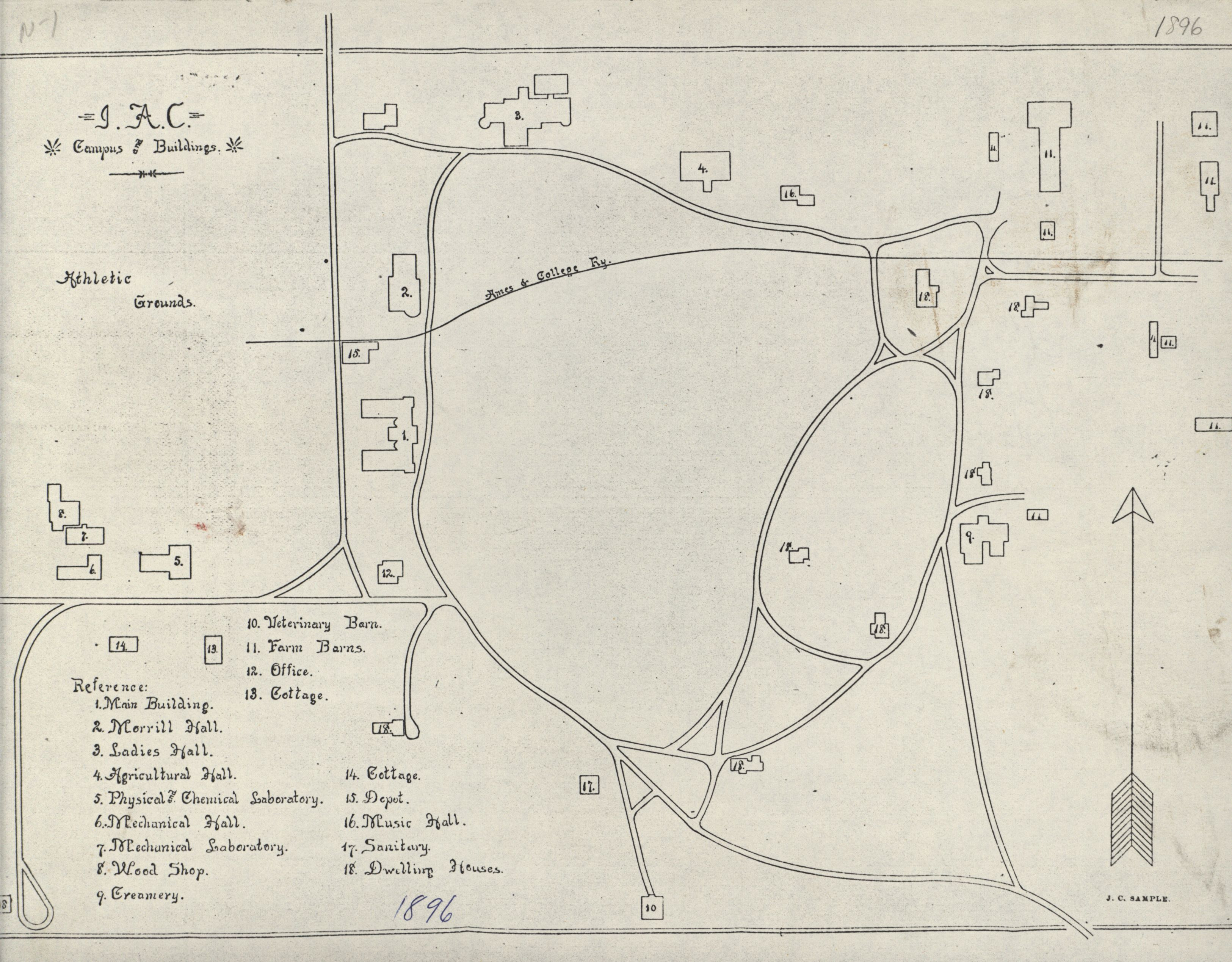 - Map of the Iowa Agricultural College campus and buildings from 1896, including a reference key.
