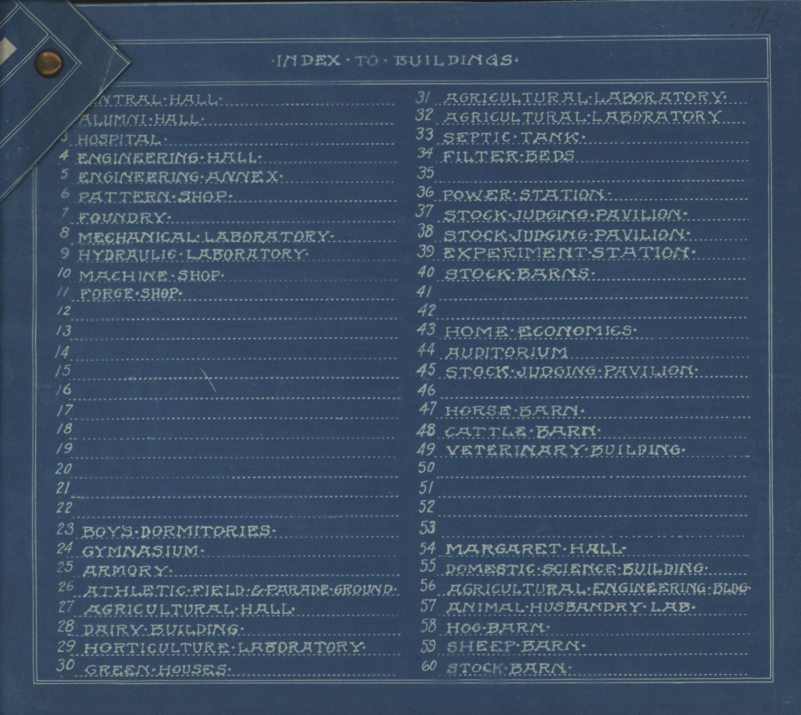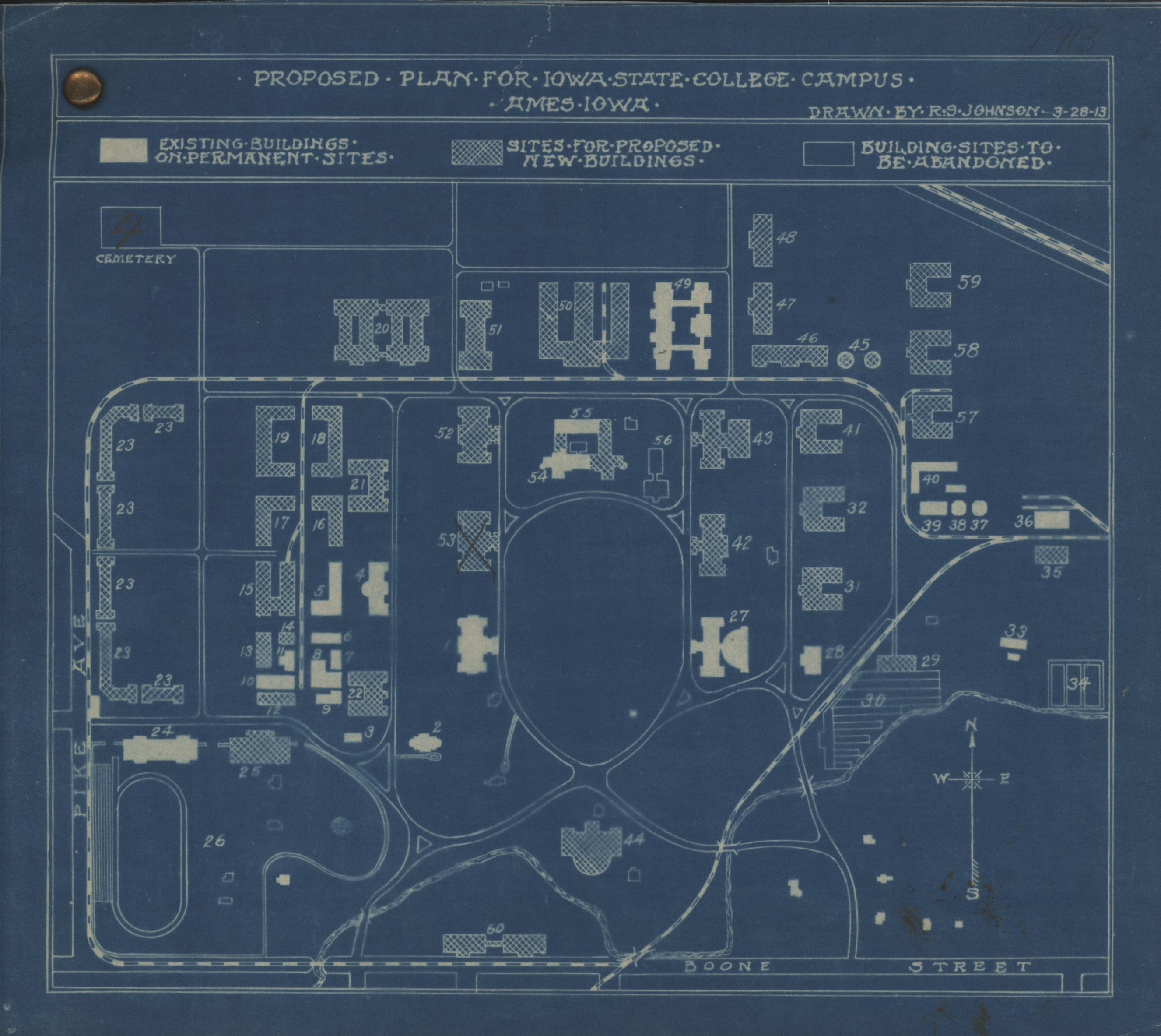 - Blueprint map showing proposed plan for Iowa State College campus in Ames, Iowa. Drawn by R. S. Johnson in 1913, includes key of buildings on campus.