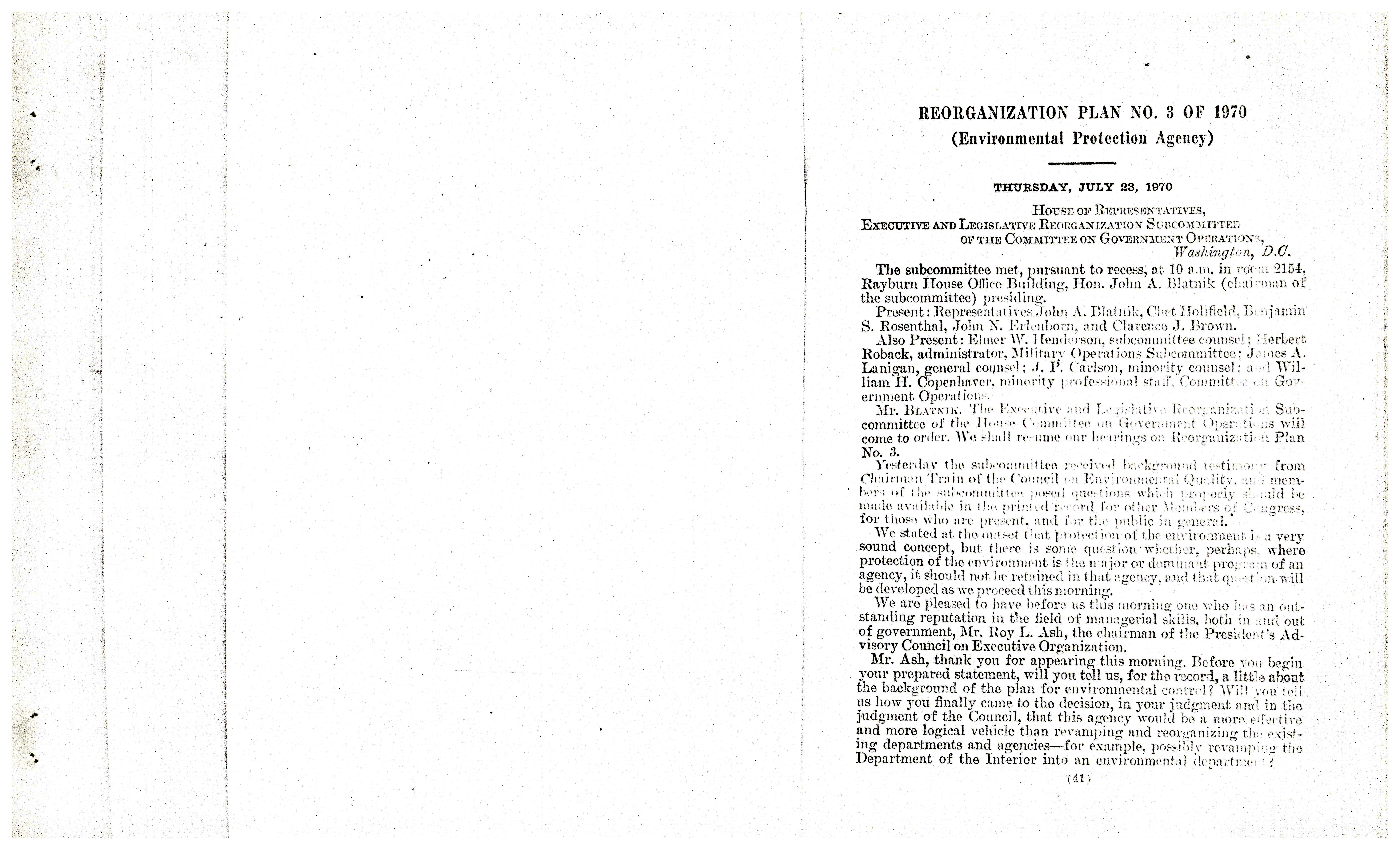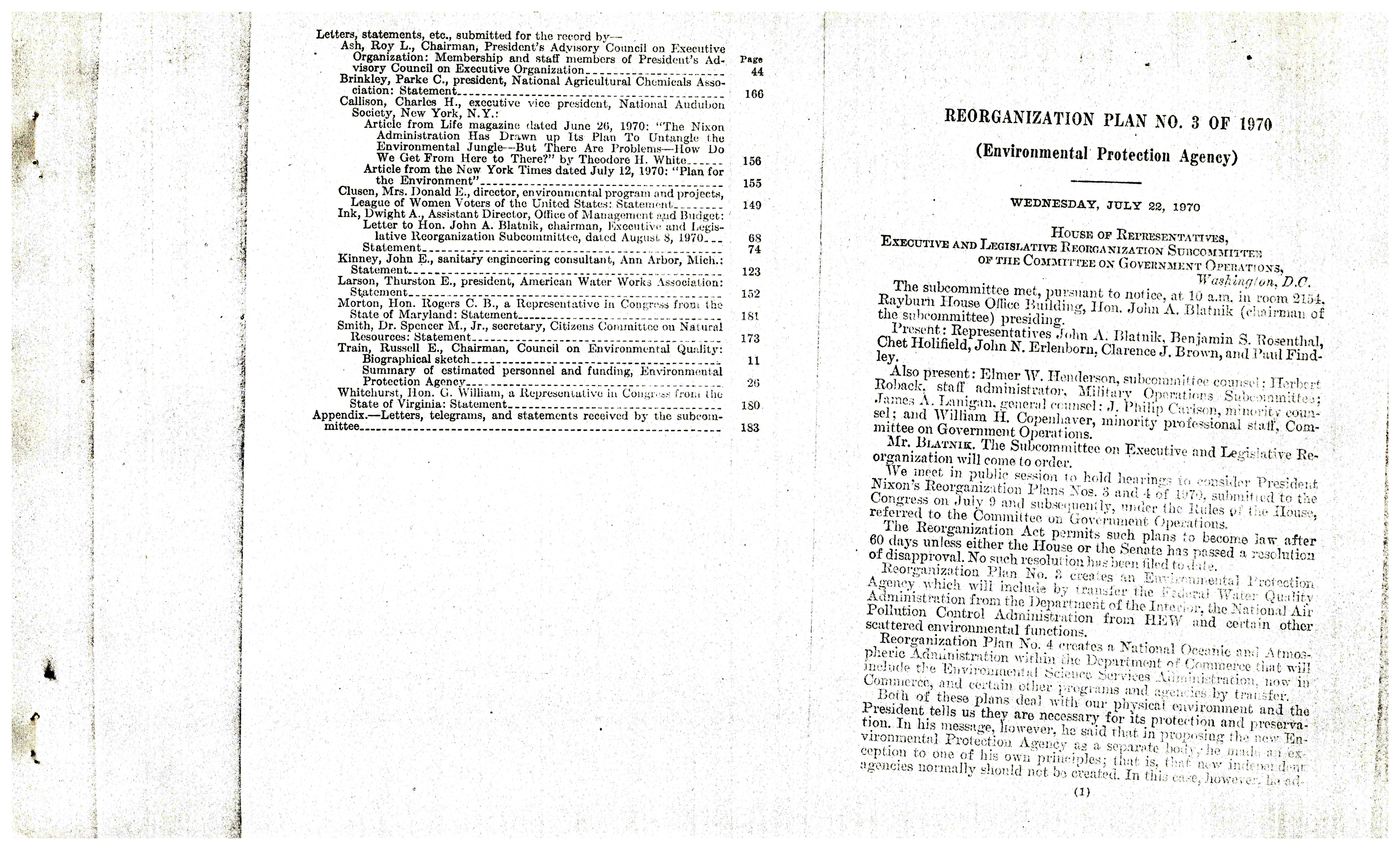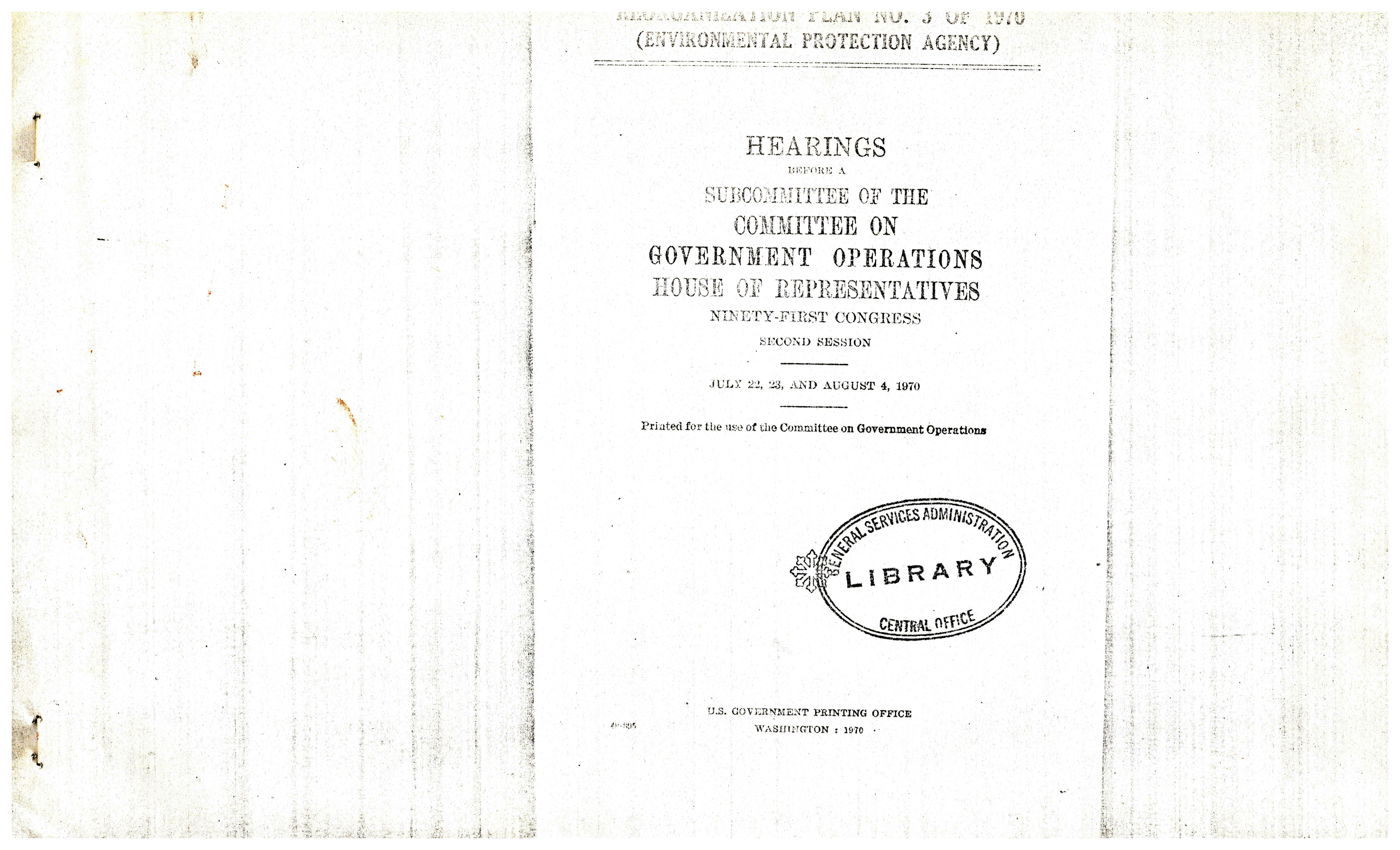 - U.S. Congress. House. Committee on Government Operations. Reorganization plan no. 3, Environmental Protection Agency, hearings booklet, 1970