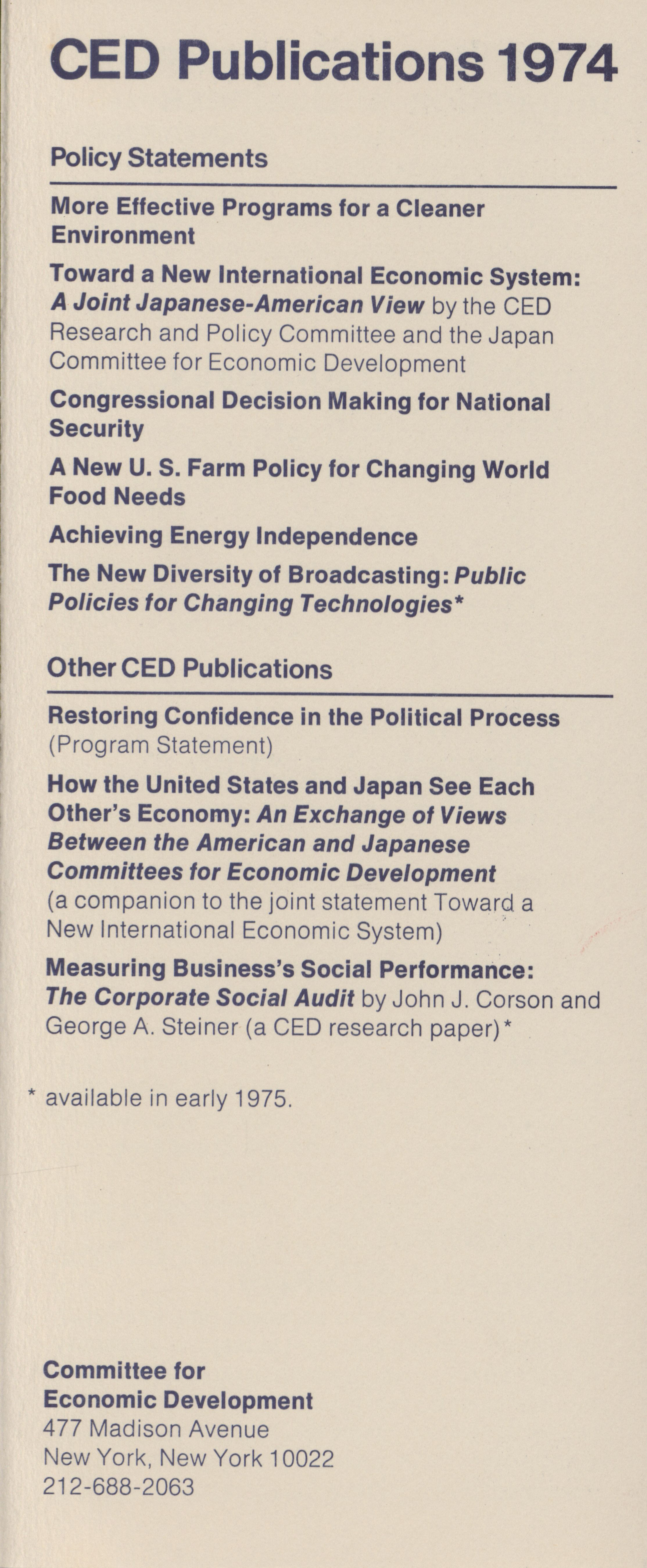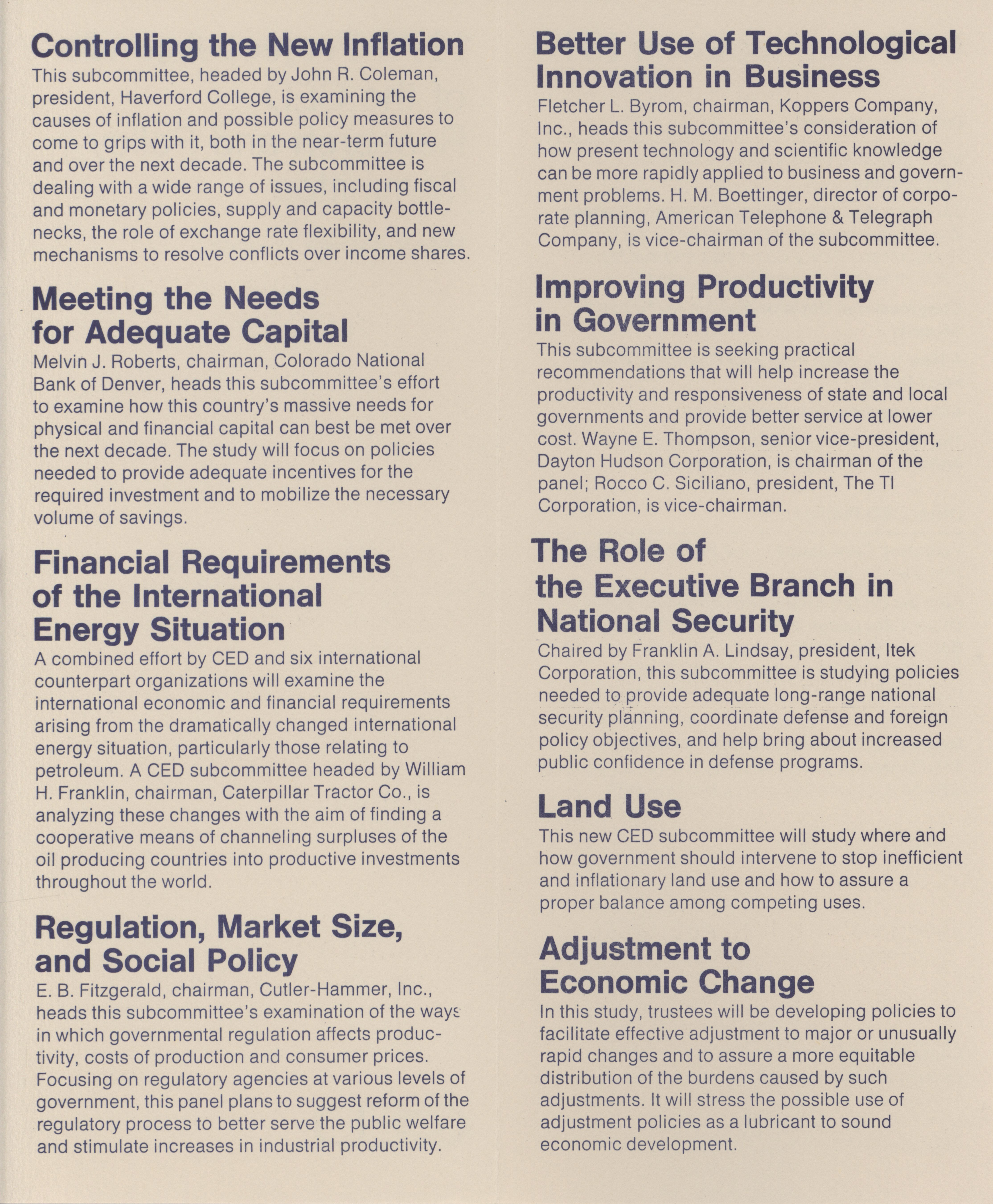 - "1975 project agenda of the CED Research and Policy Committee", Dwight Ink Collection, Iowa State University Library Digital Collections