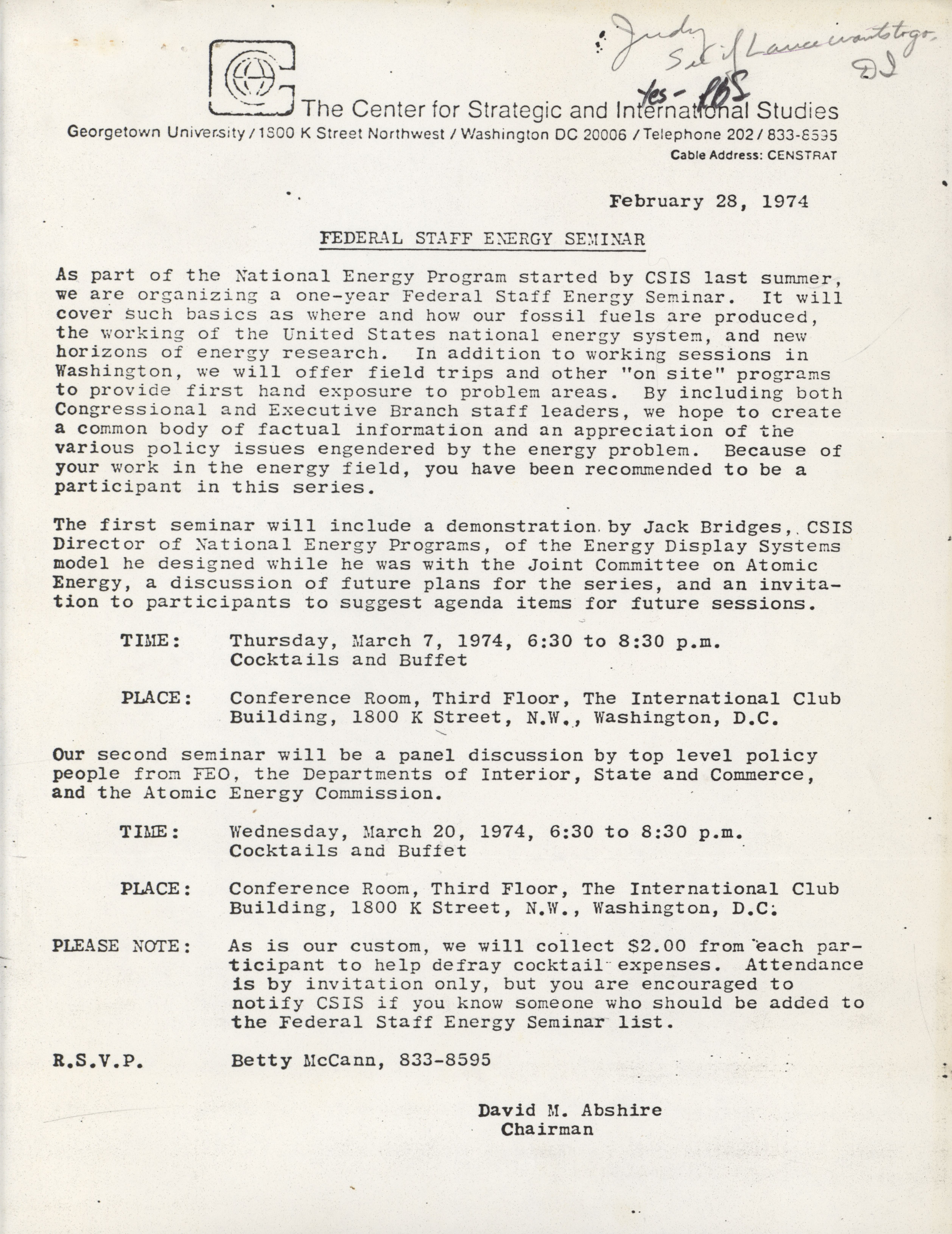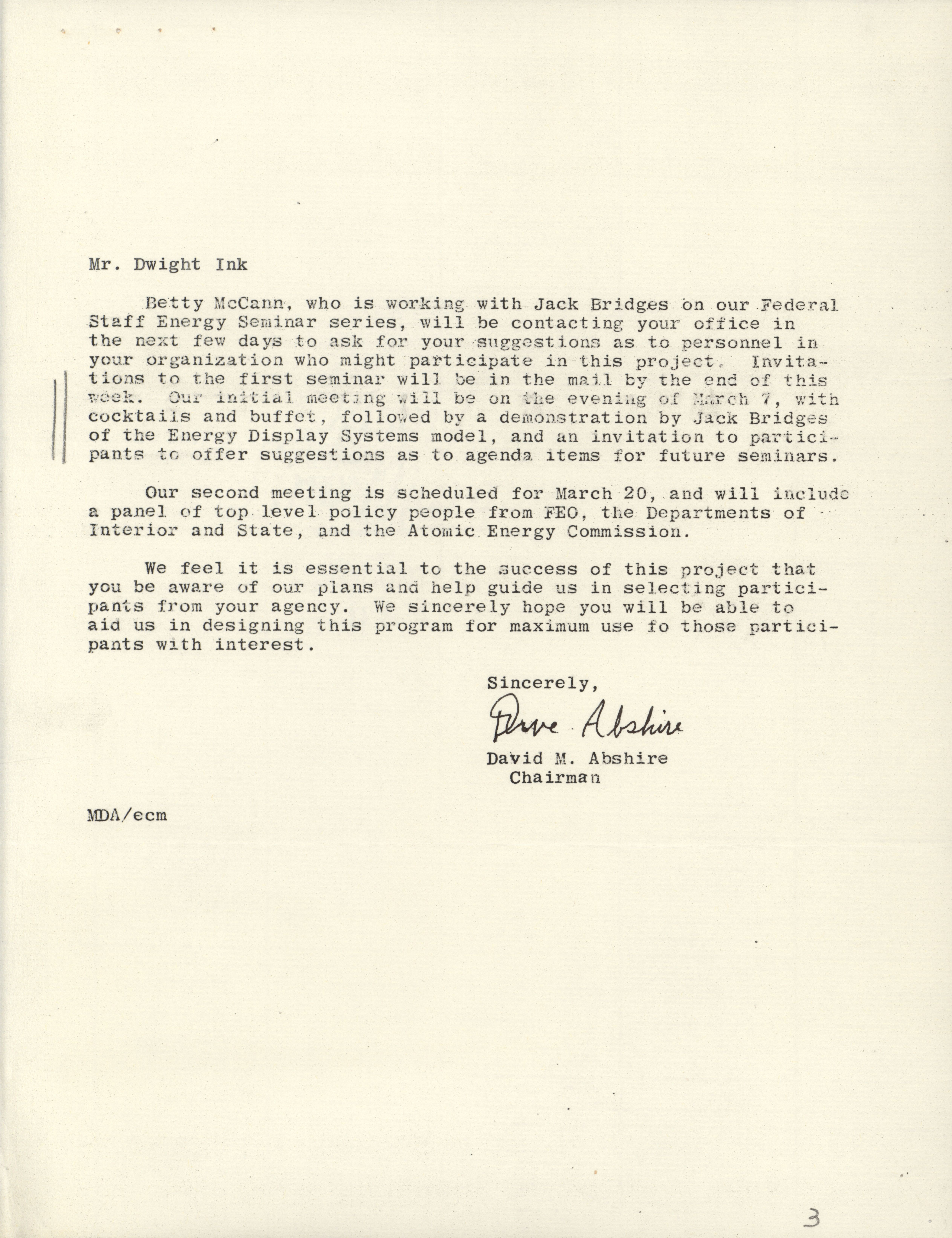 - David M. Abshire letter to Dwight Ink, February 27, 1974, includes seminar description