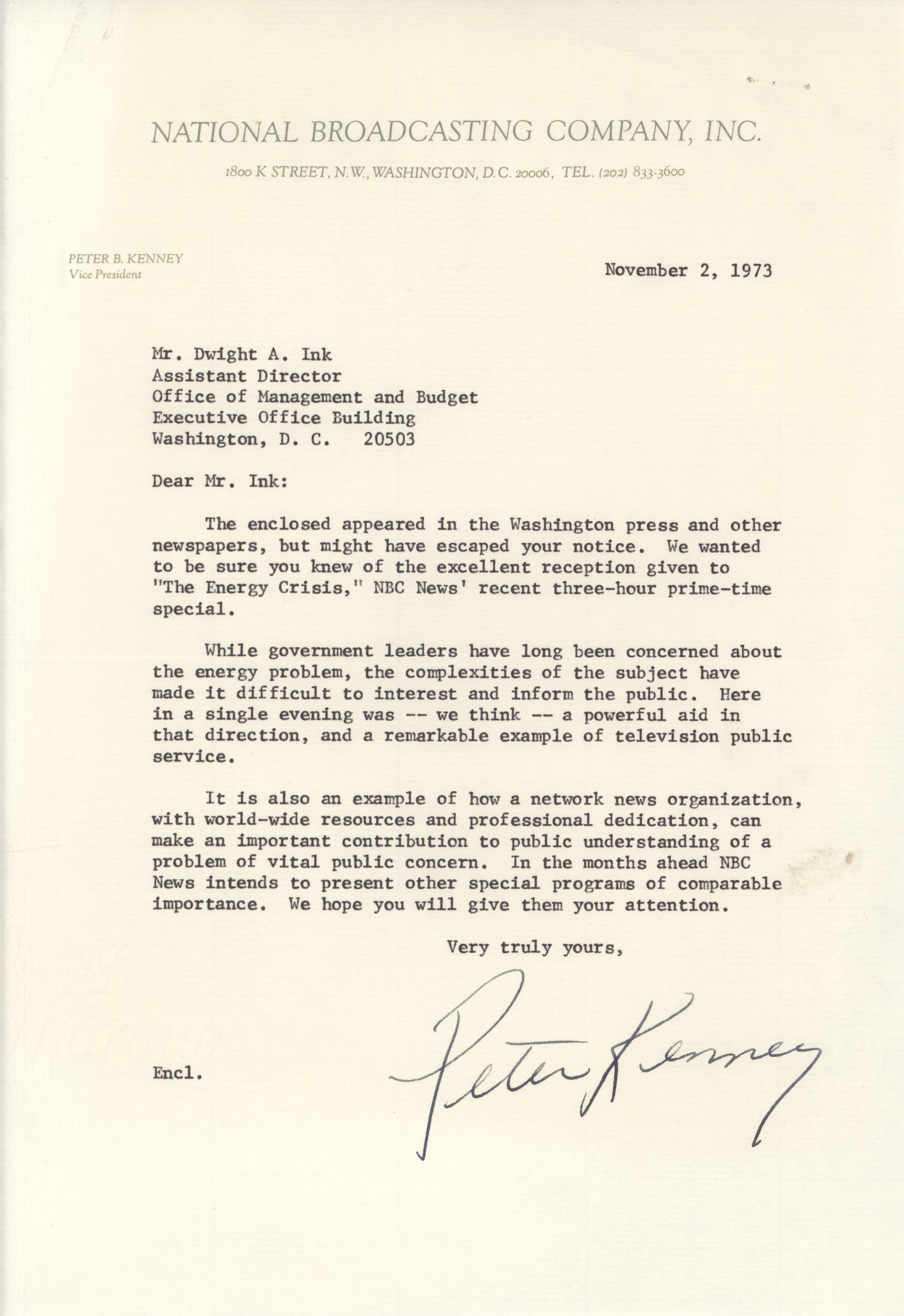 - Peter Kenney letter to Dwight A. Ink, November 2, 1973, includes advertisement