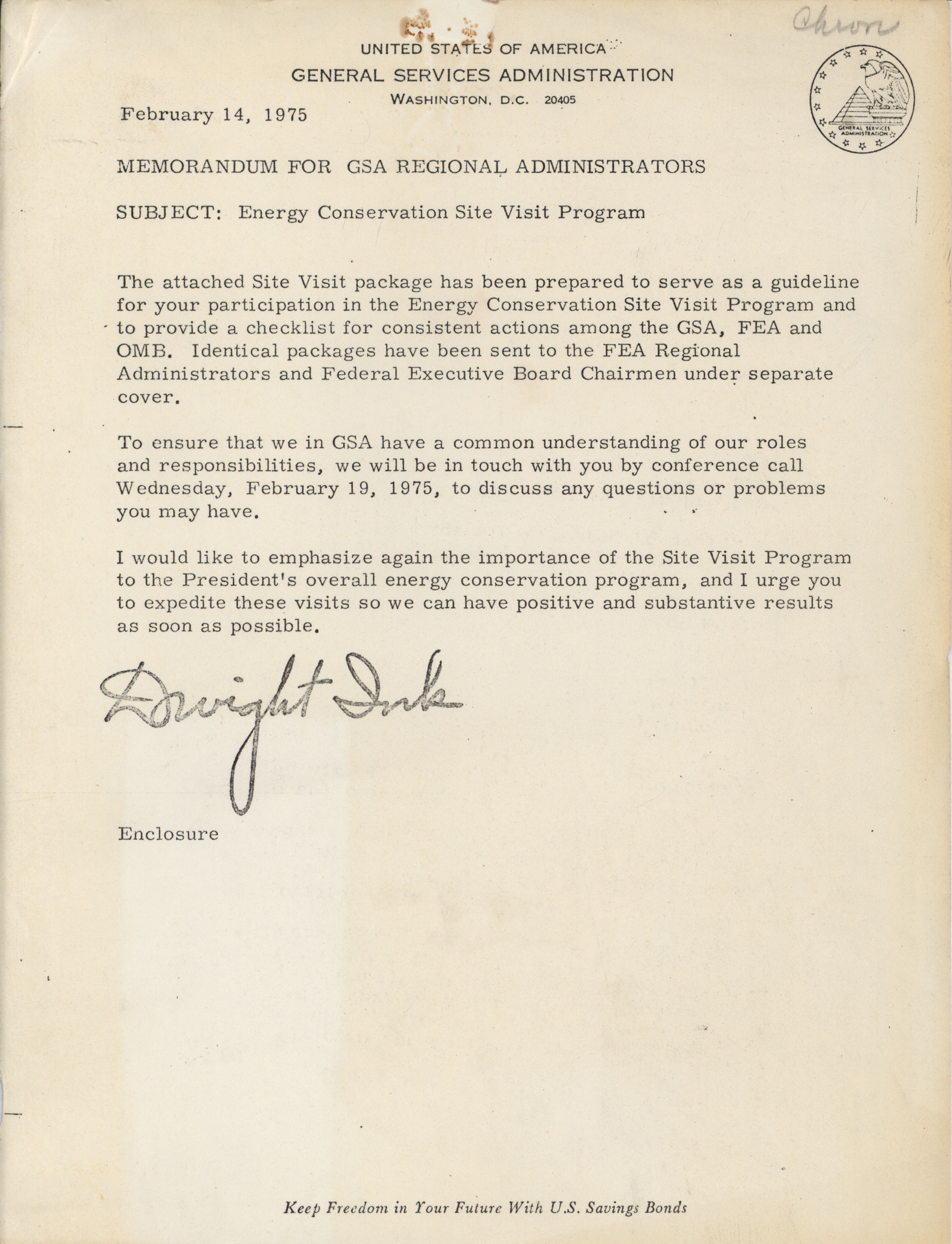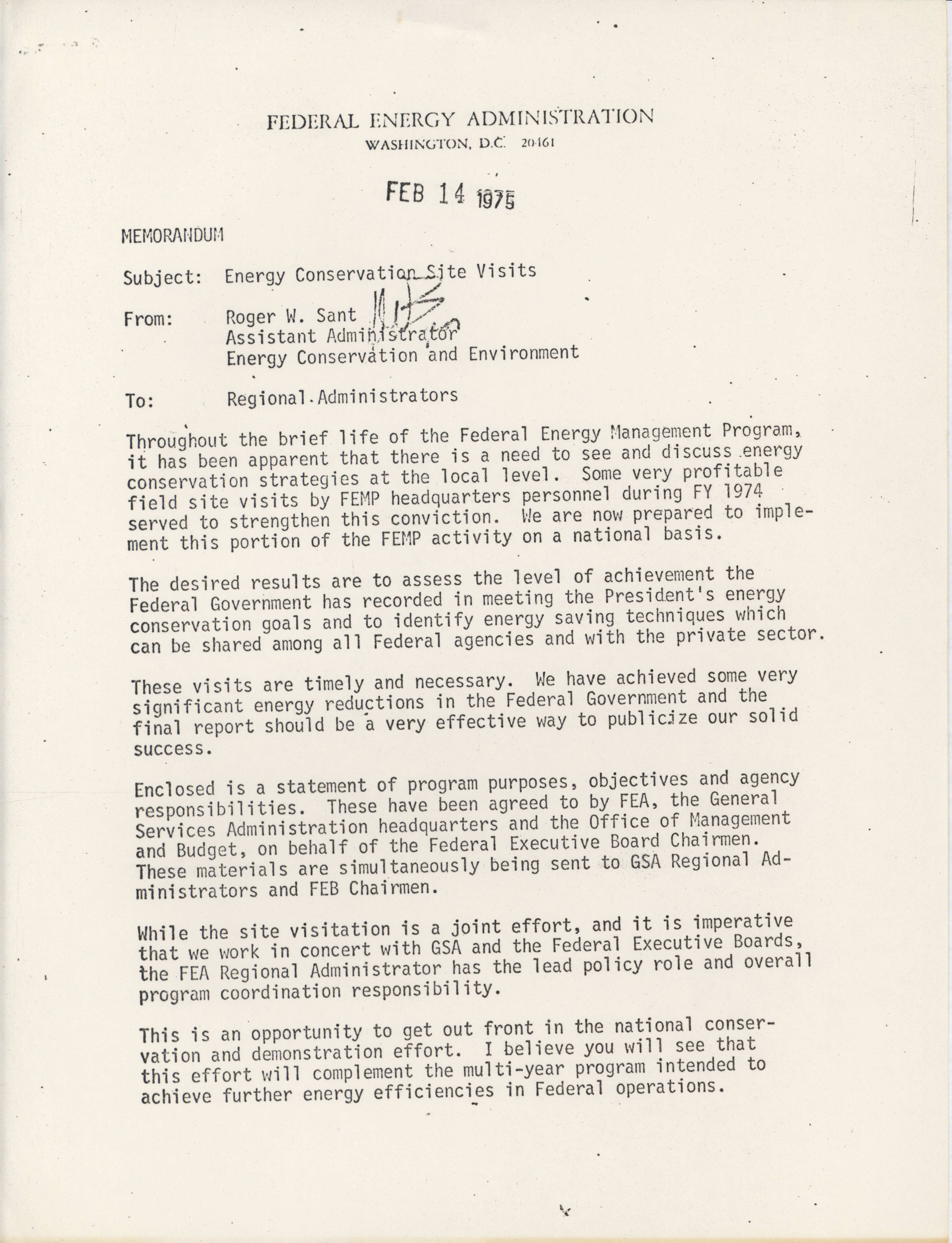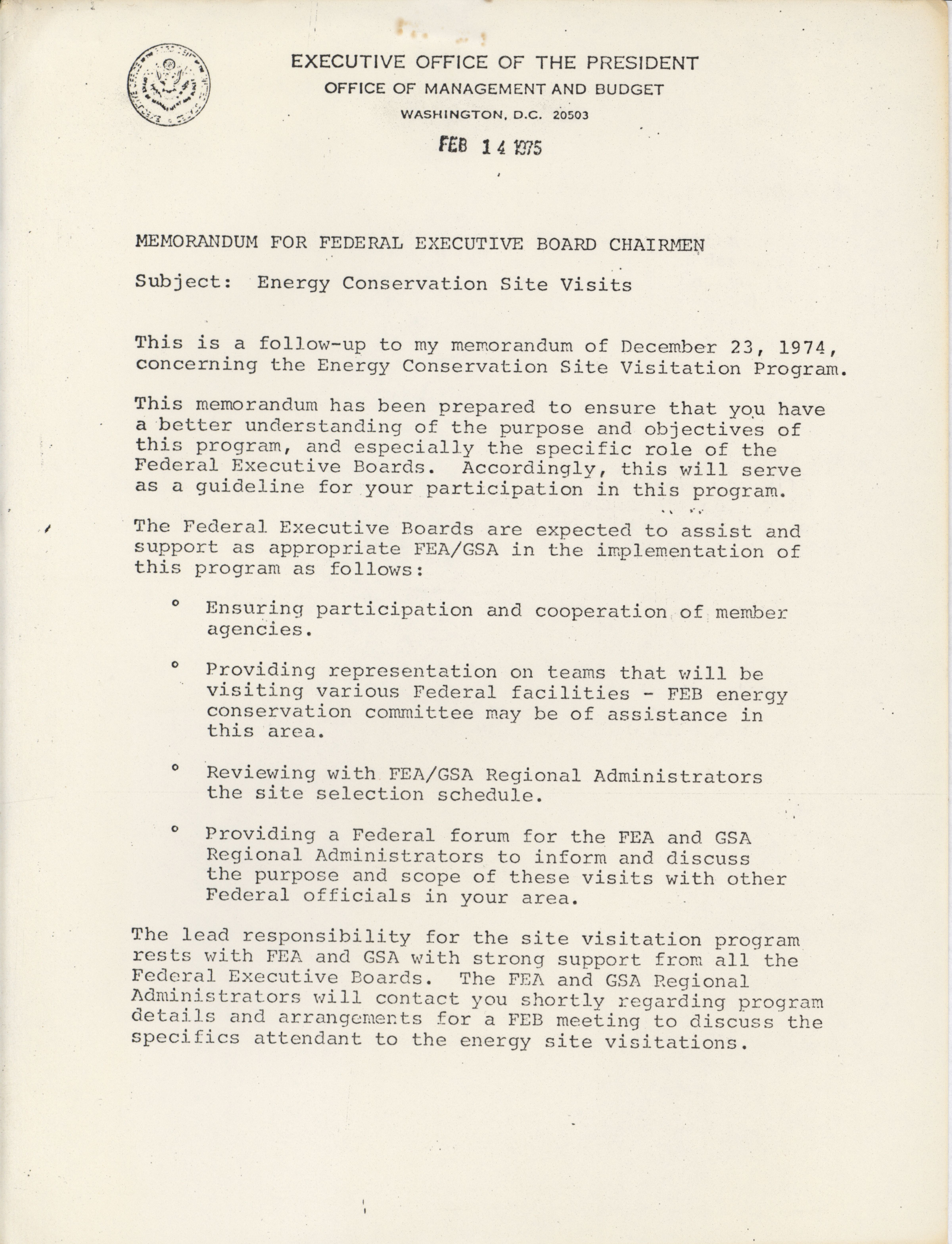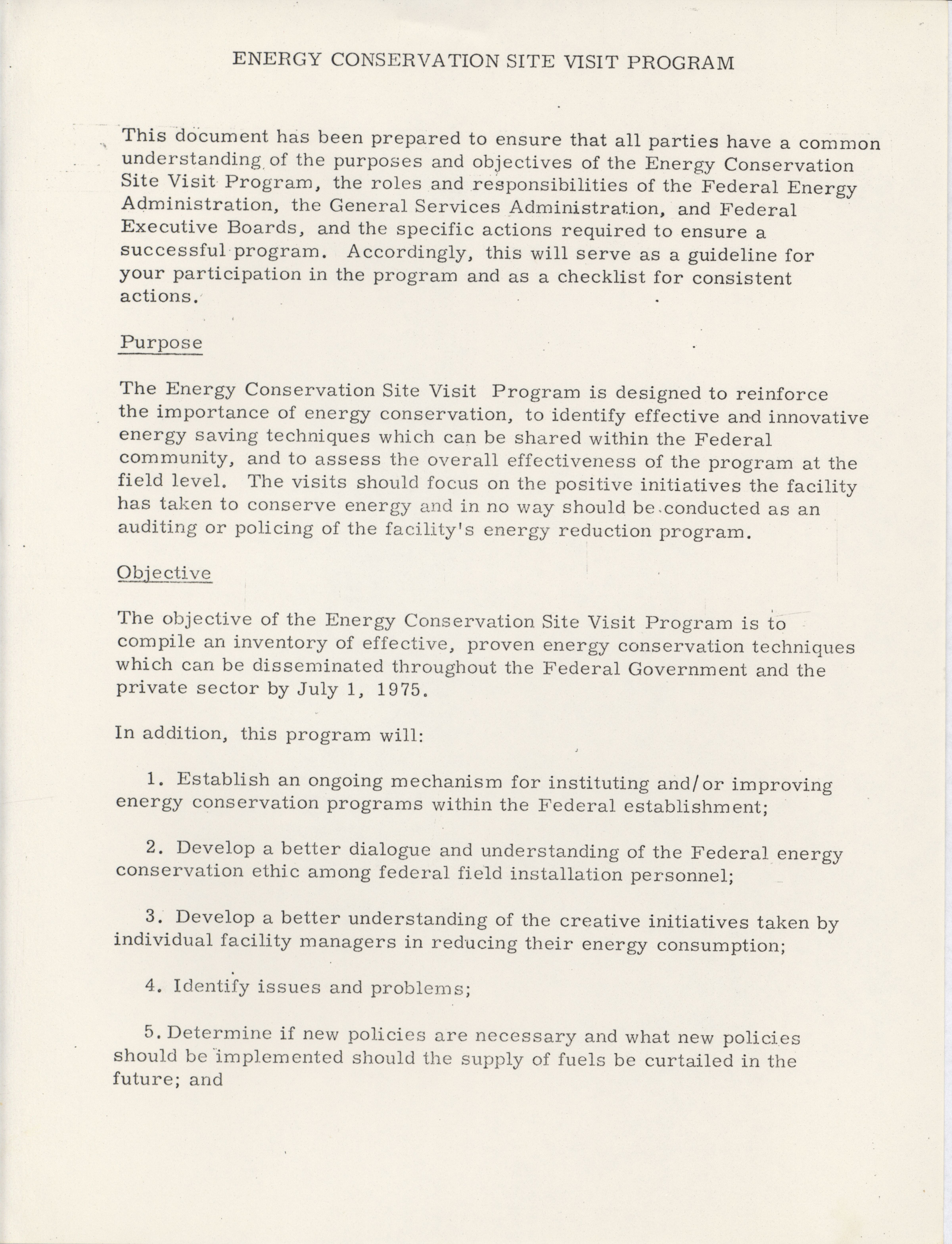- Energy Conservation Site Visit Program overview and memorandums, 1975