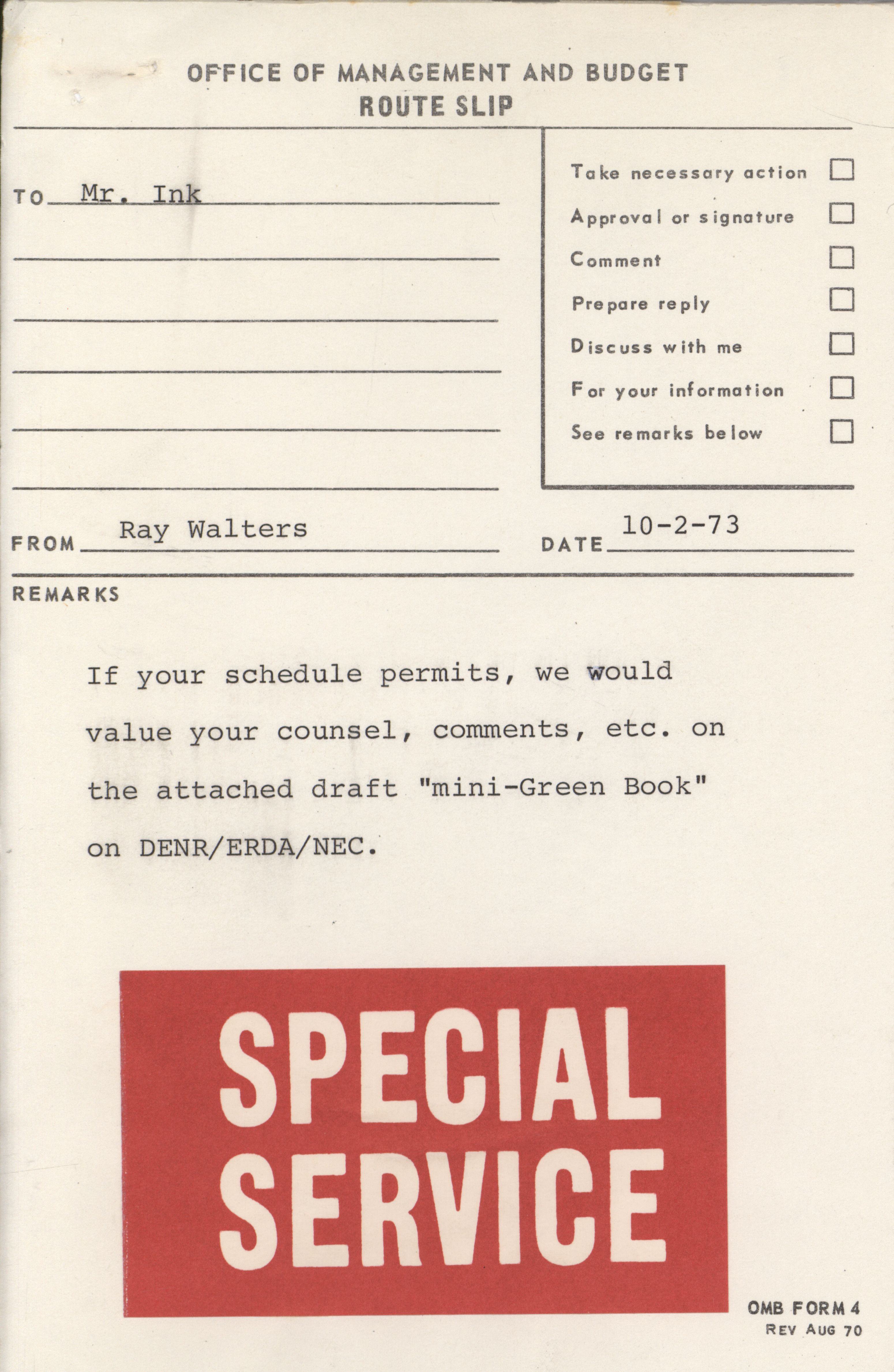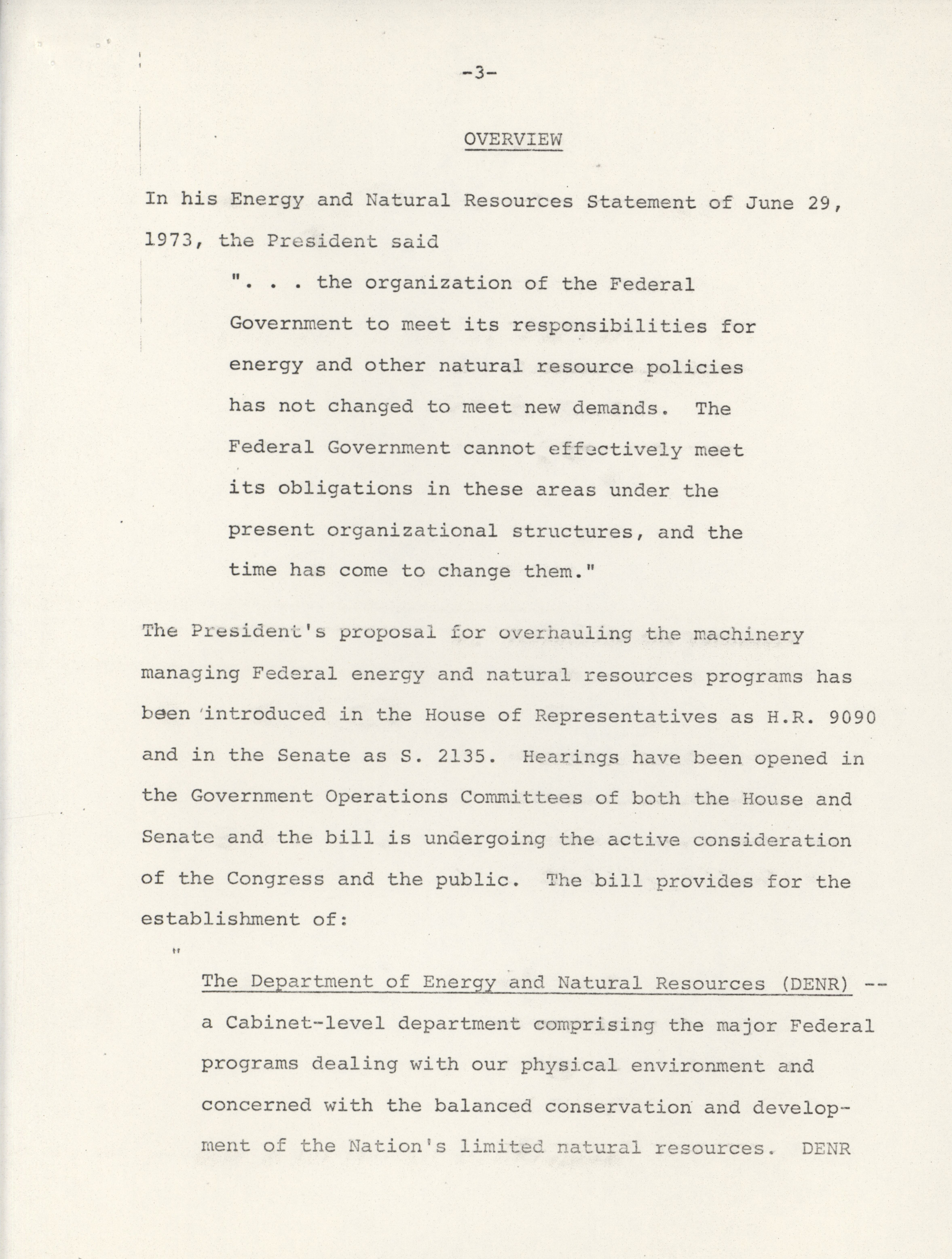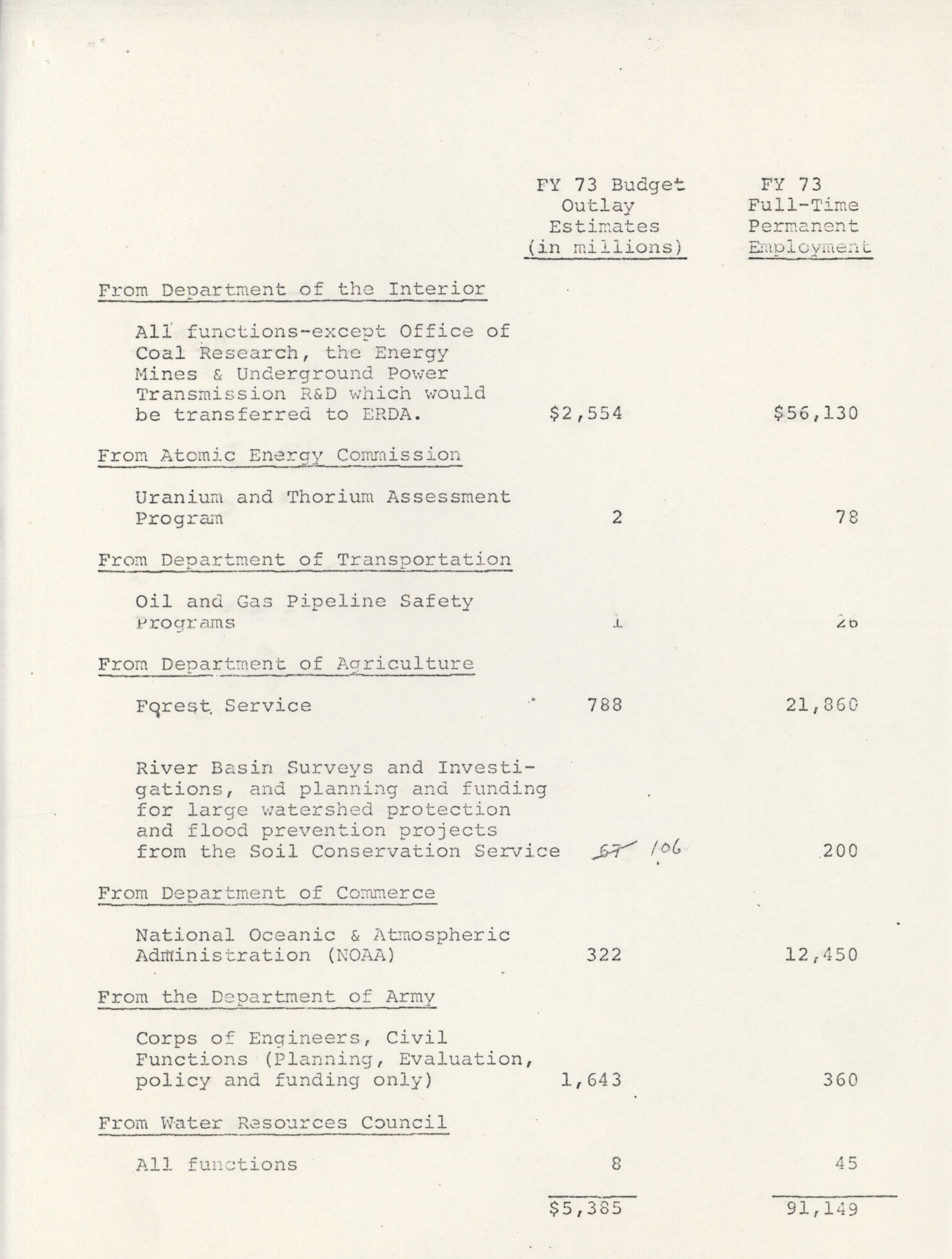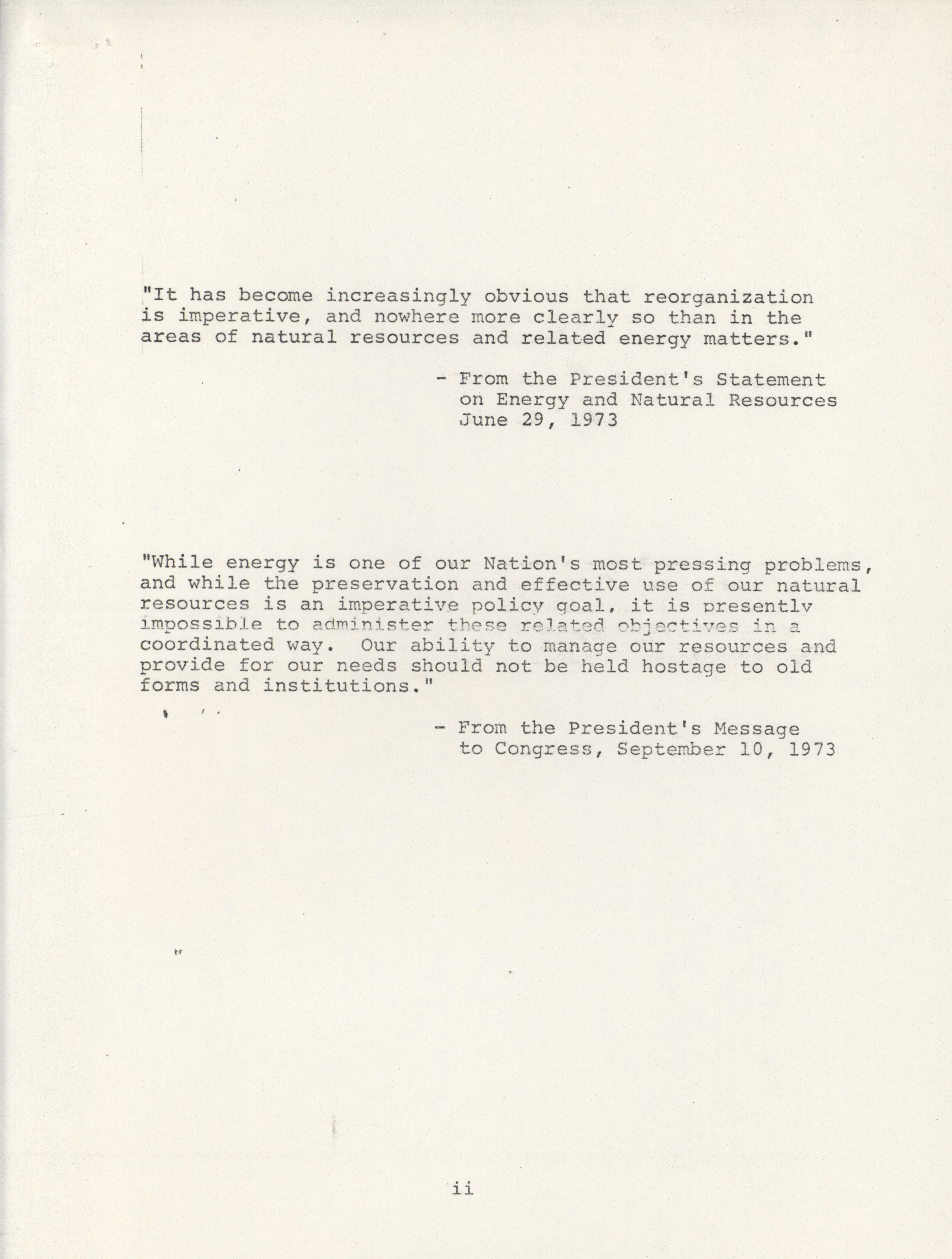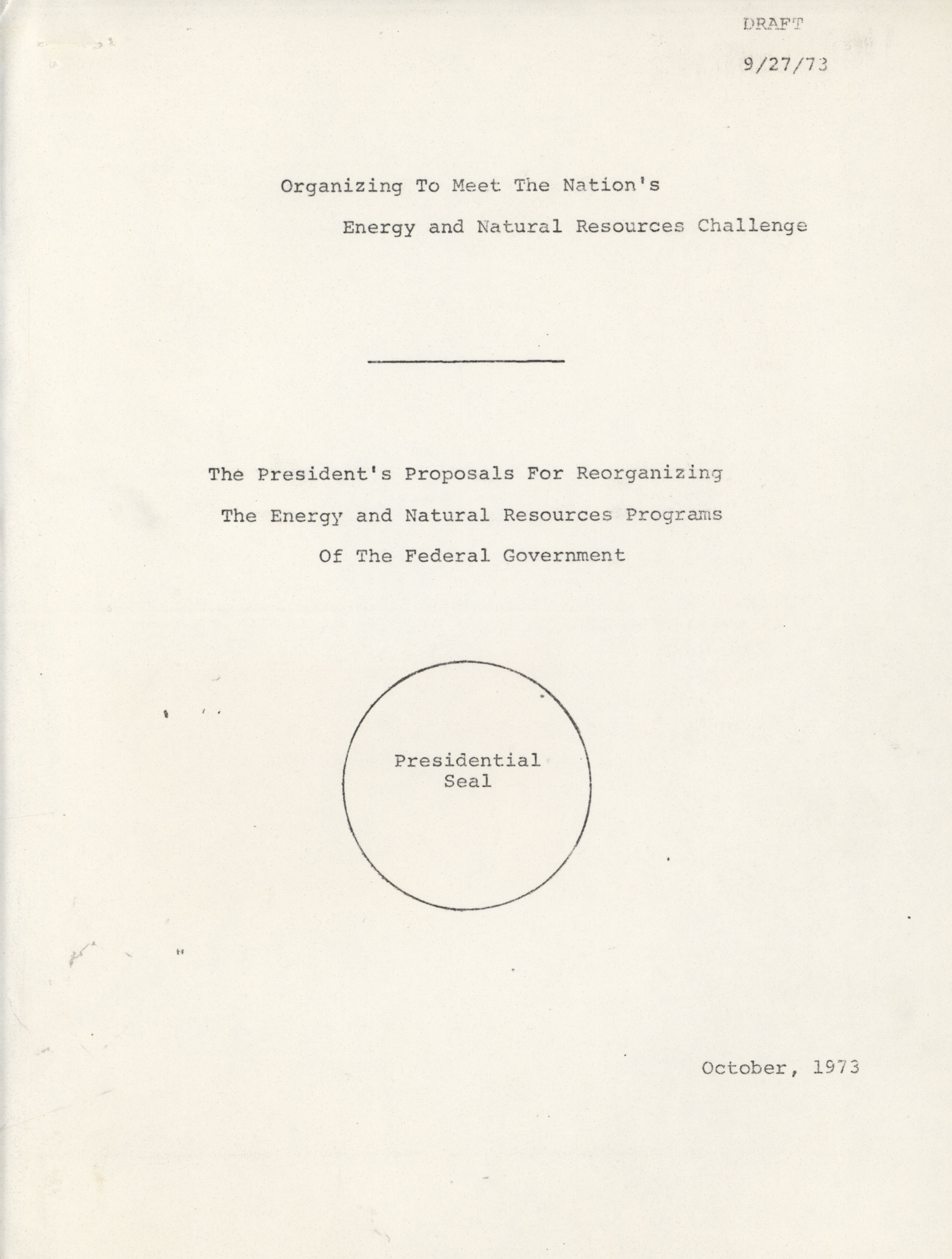 - OMB. "President's proposals for reorganizing the energy and natural resources programs of the federal government," annotated draft, 1973