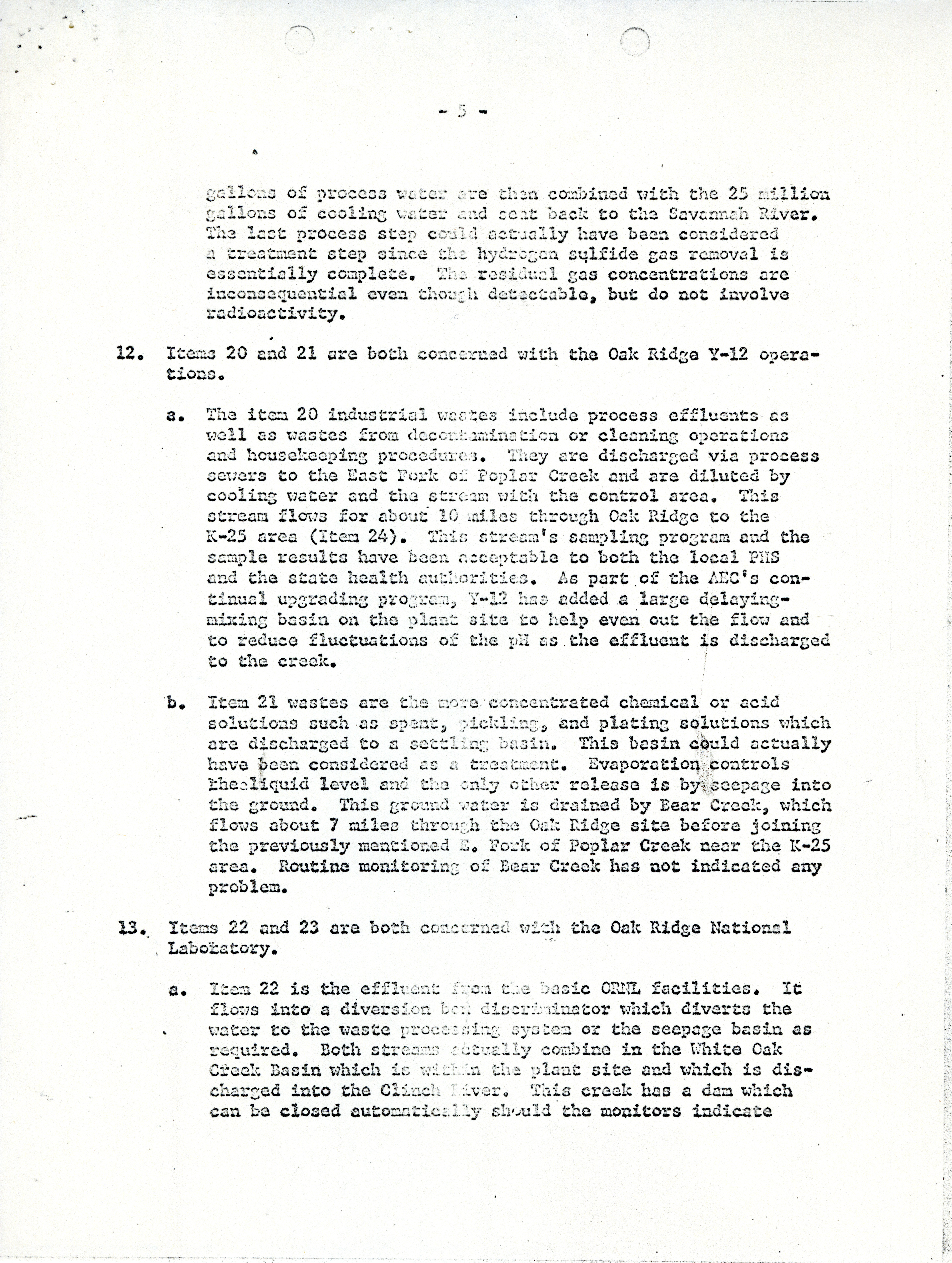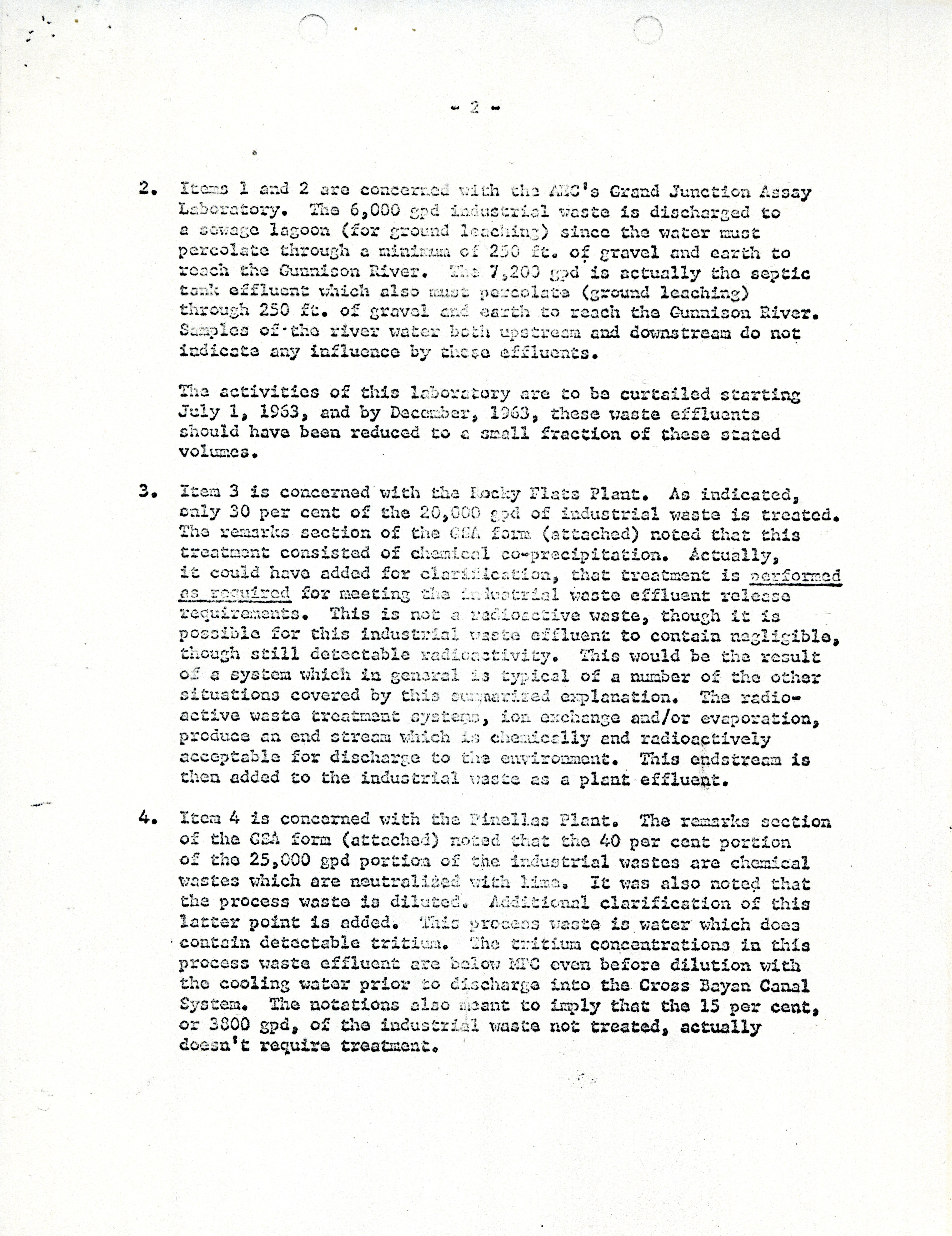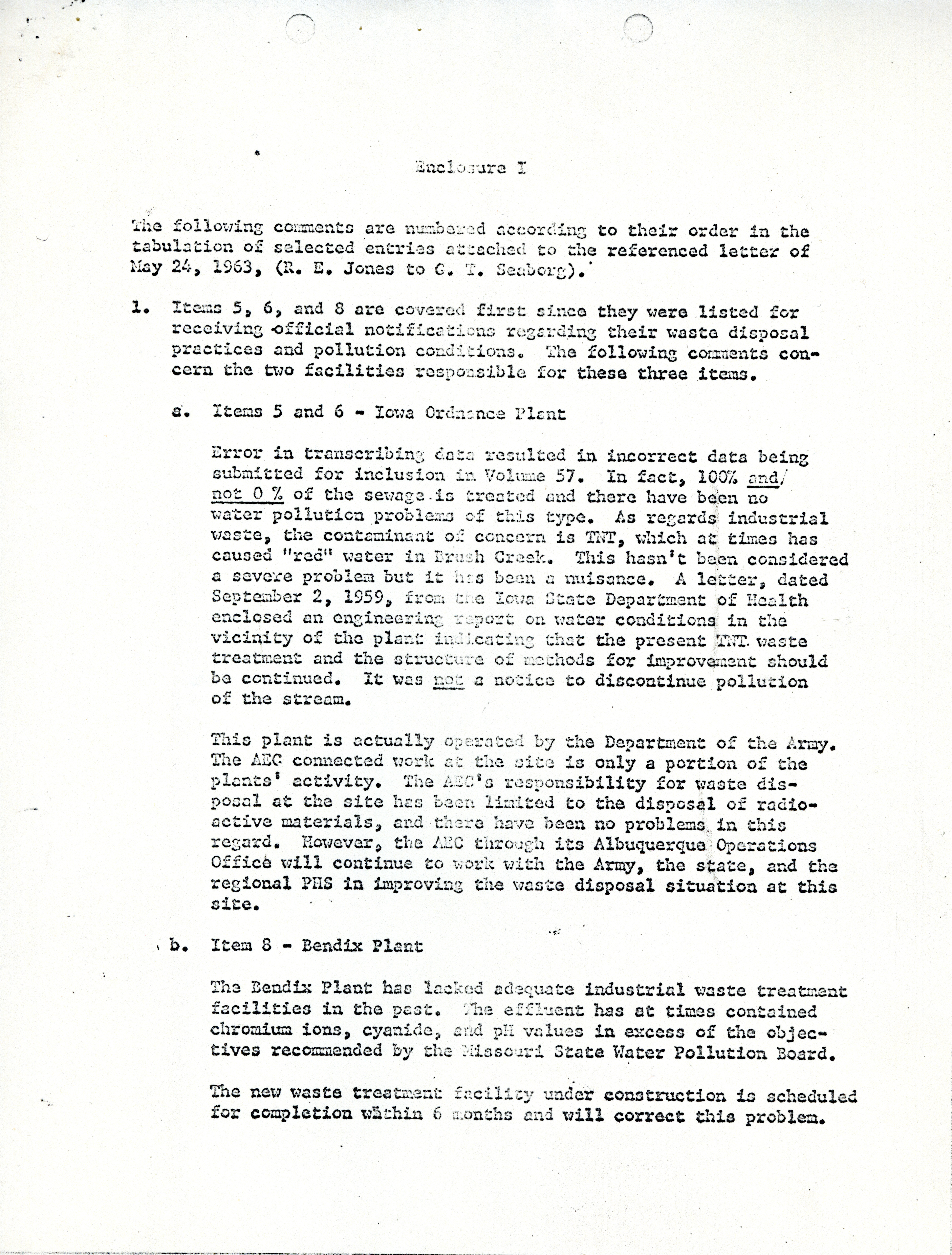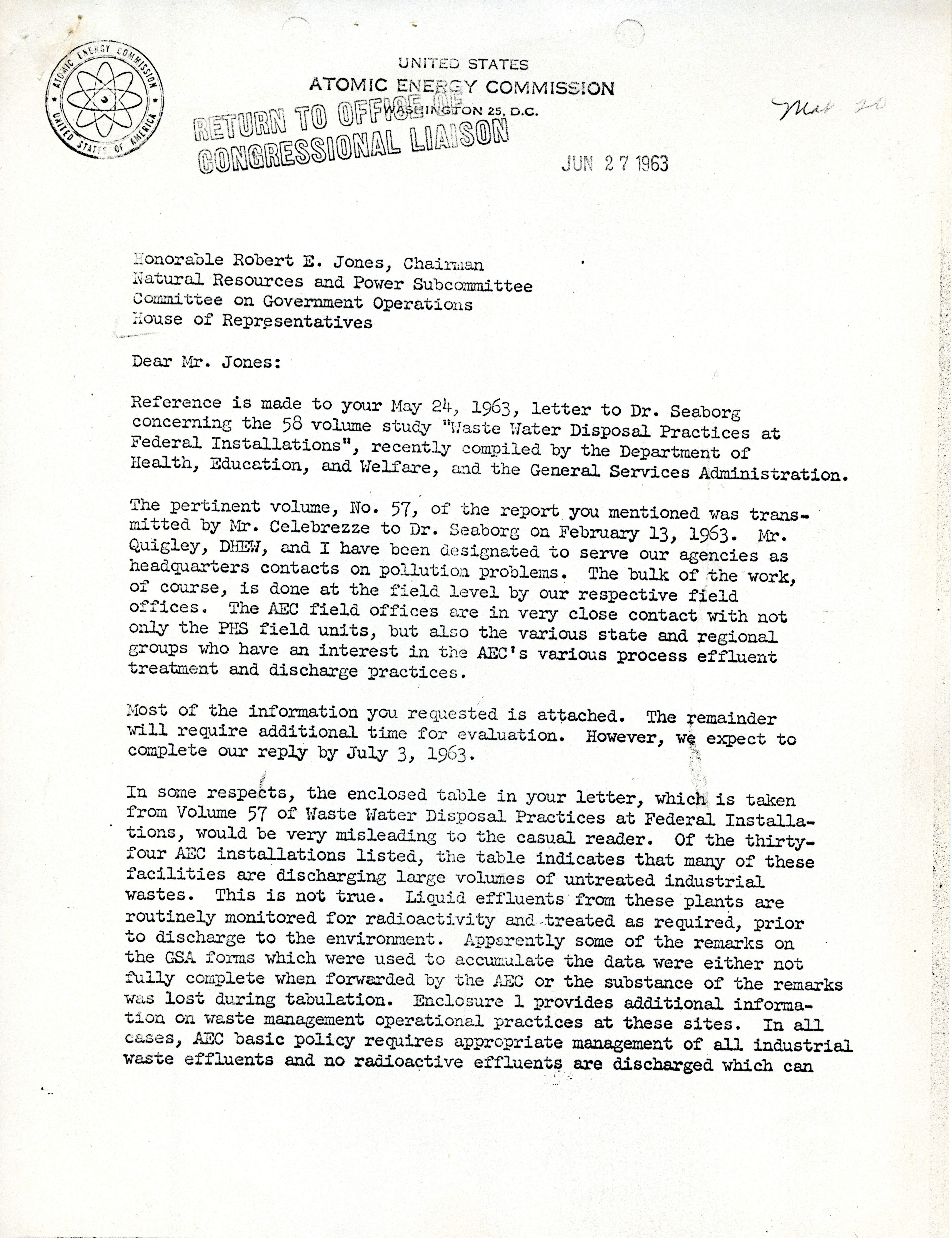 - Annotation: The letter refers to a 58-volume study, "Waste Water Disposal Practices at Federal Installations," compiled by the Department of Health, Education, and Welfare, and the General Services Administration." The letter includes a 6-page enclosure regarding volume 57 that focuses on possible untreated industrial waste being discharged into the environment.