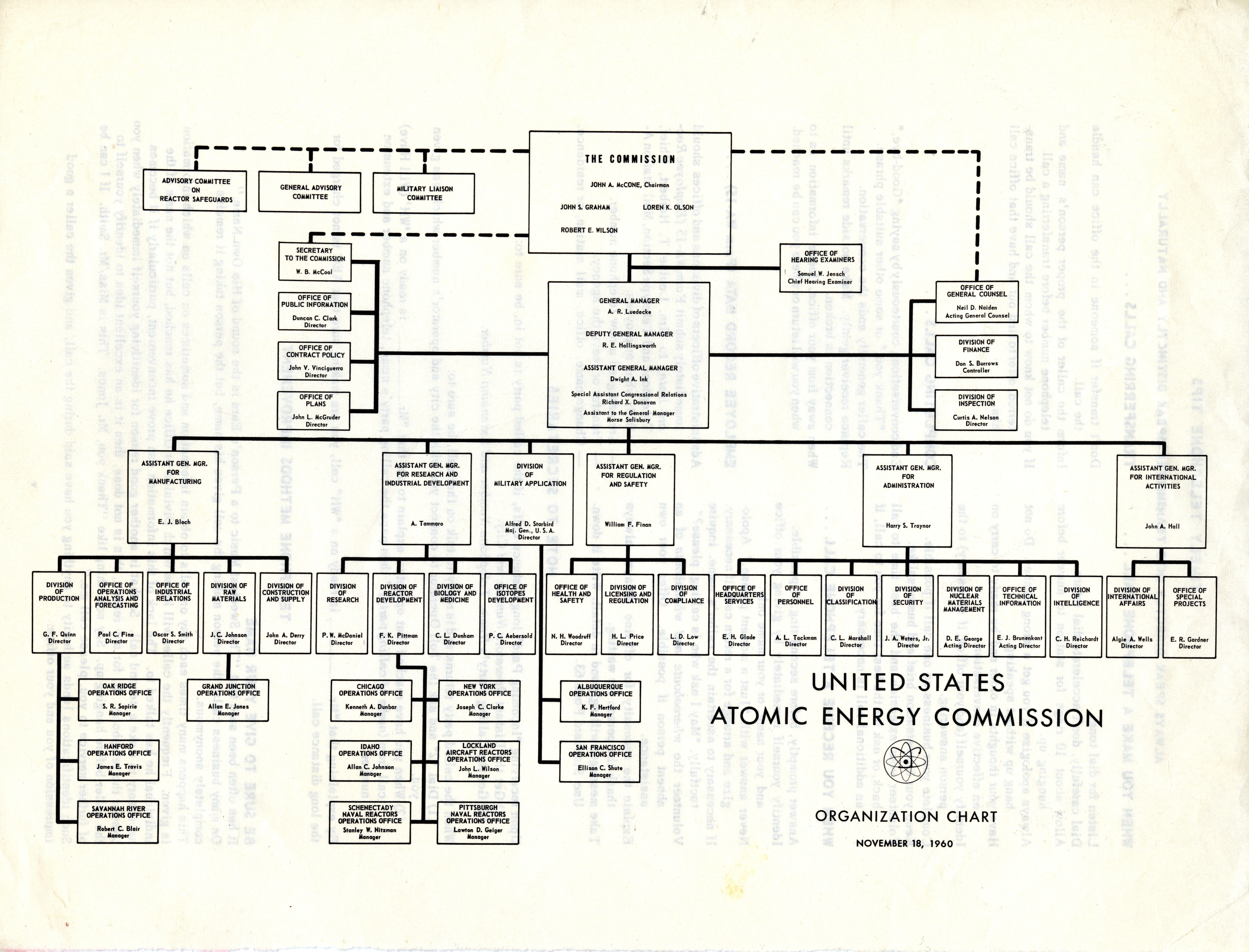 - "United States Atomic Energy Commission organizational chart", Dwight Ink Collection, Iowa State University Library Digital Collections