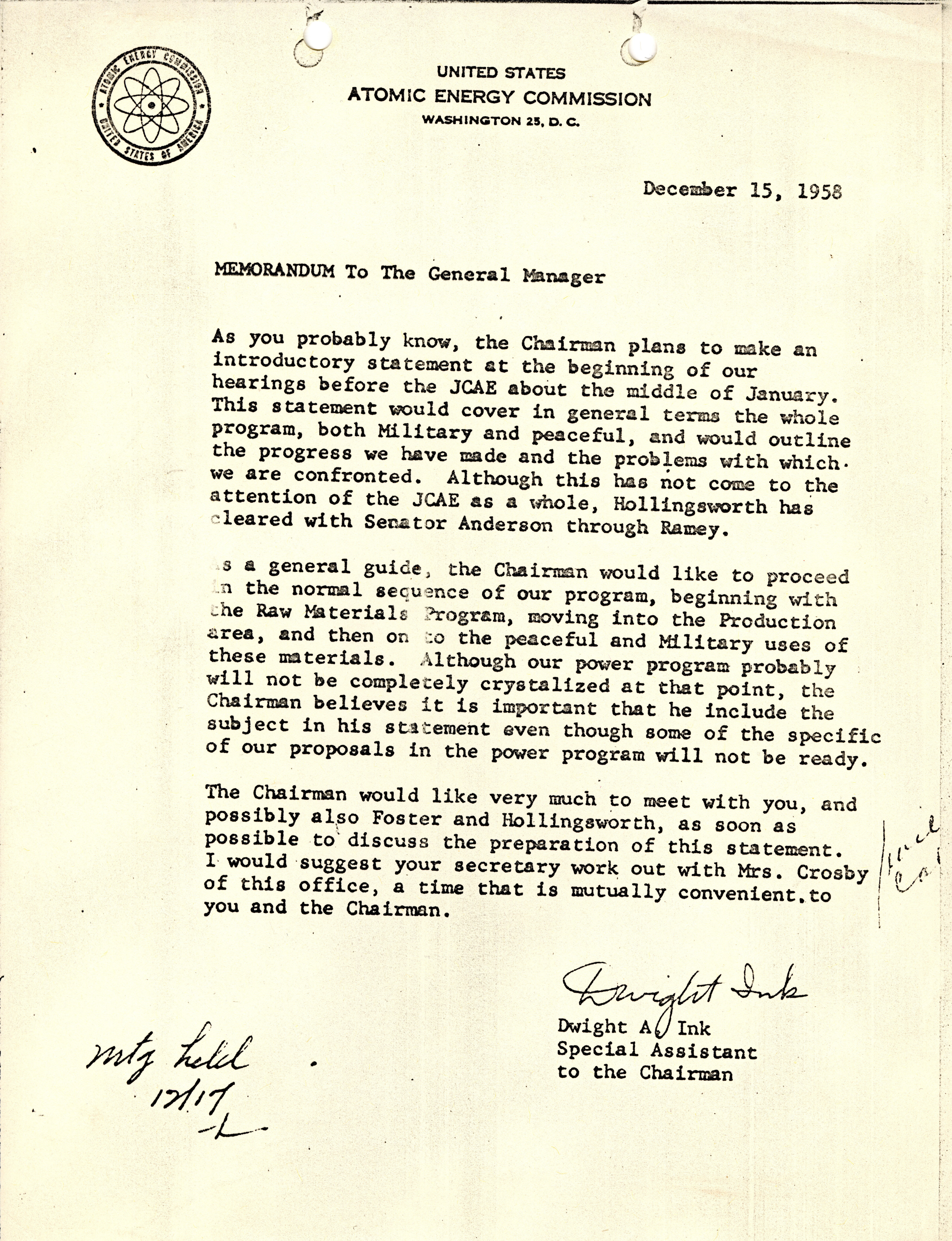 - Dwight Ink memorandum to the general manager, December 15, 1958