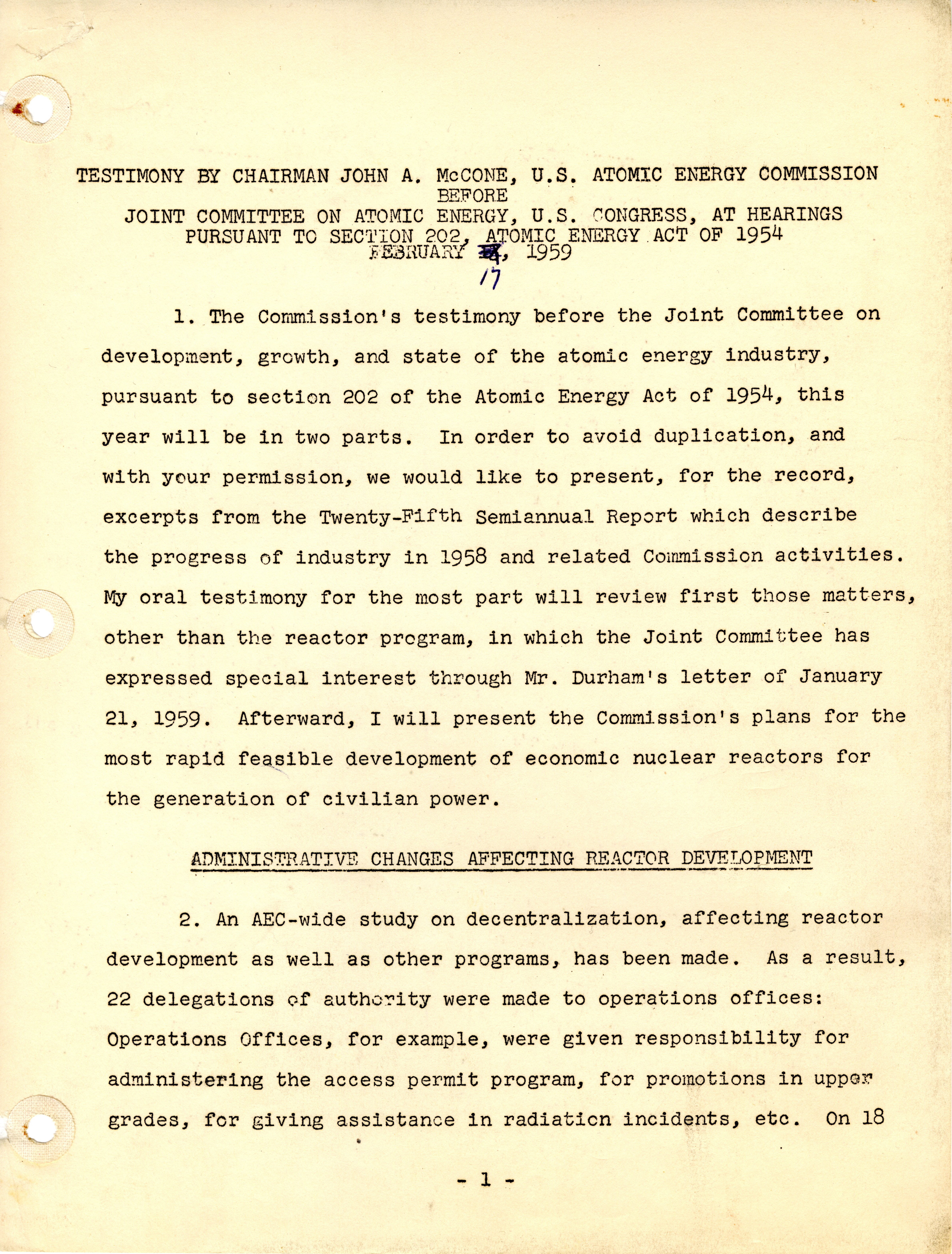 Testimony by Chairman John A. McCone, U.S. Atomic Energy Commission before Joint Committee on Atomic Energy, U.S. Congress, at hearings pursuant to Section 202, Atomic Energy Act of 1954, February 17, 1959 Item Info