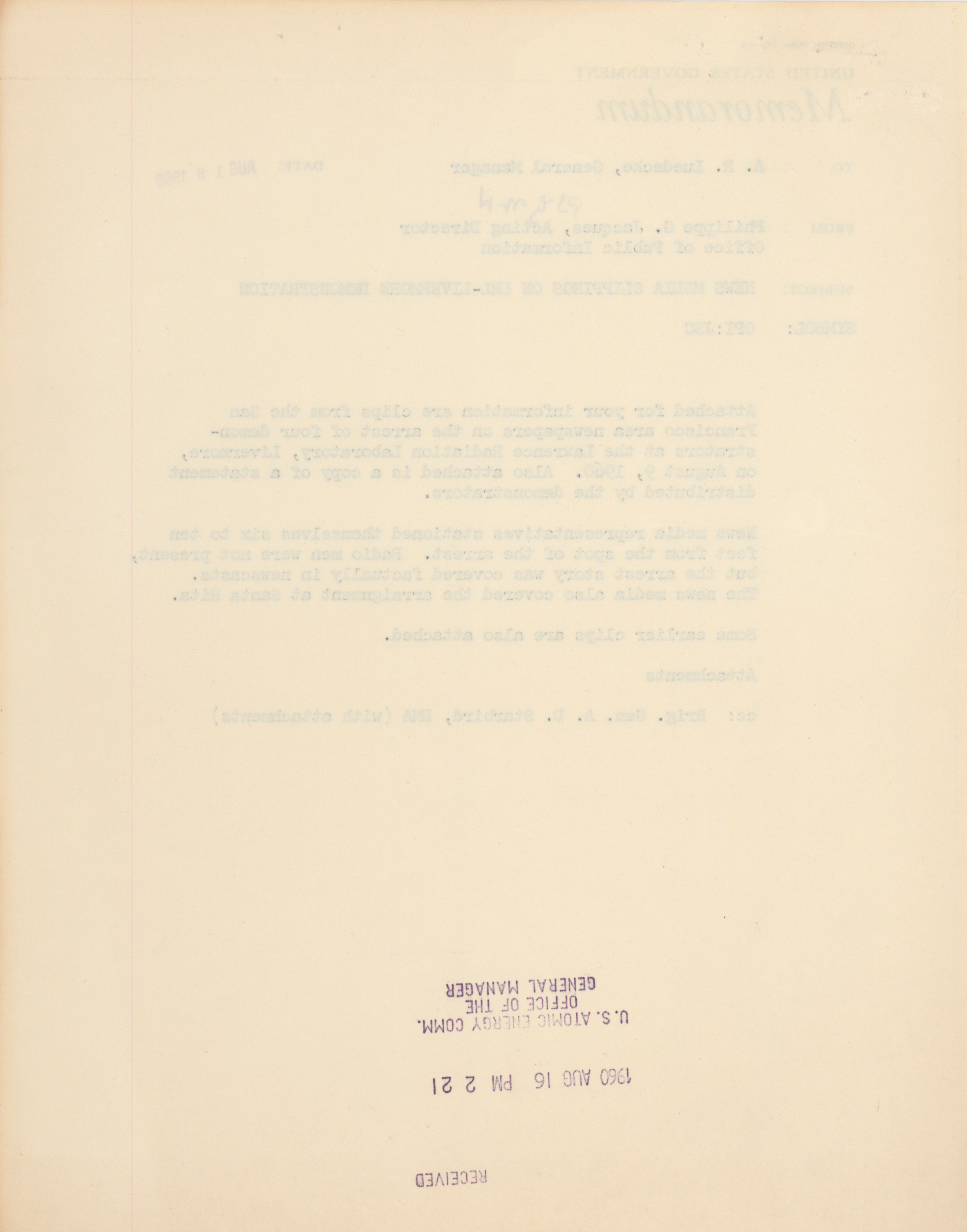 Philippe G. Jacques memorandum to A. R. Luedecke regarding news media clippings on LRL-Livermore demonstration, August 16, 1960 Item Info