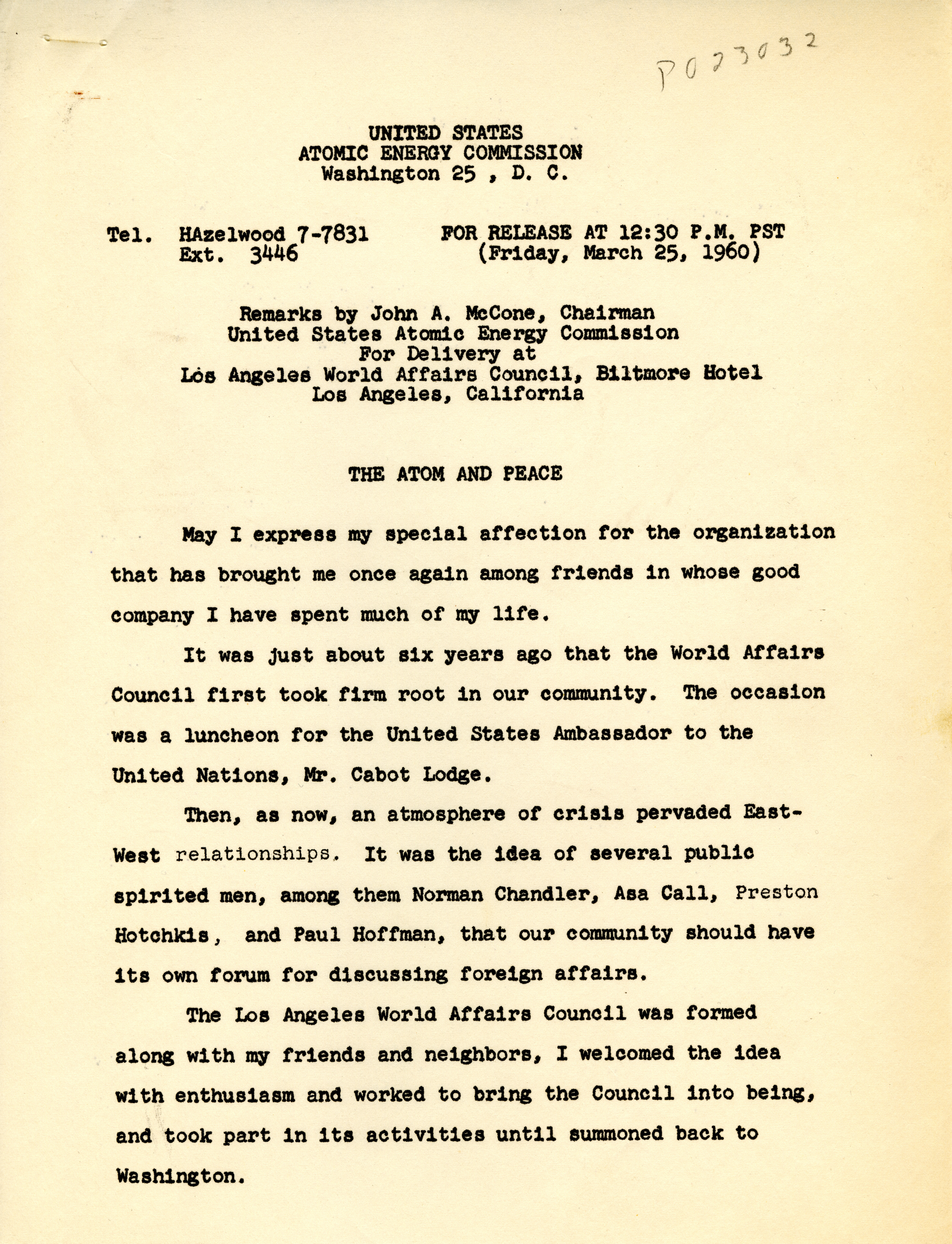 - Annotation: "For release at 12:30 P.M. PST (Friday, March 25, 1960);Remarks by John A. McCone, Chairman United States Atomic Energy Commission For Delivery at Los Angeles World Affairs Council, Biltmore Hotel Los Angeles, California;The Atom and Peace"