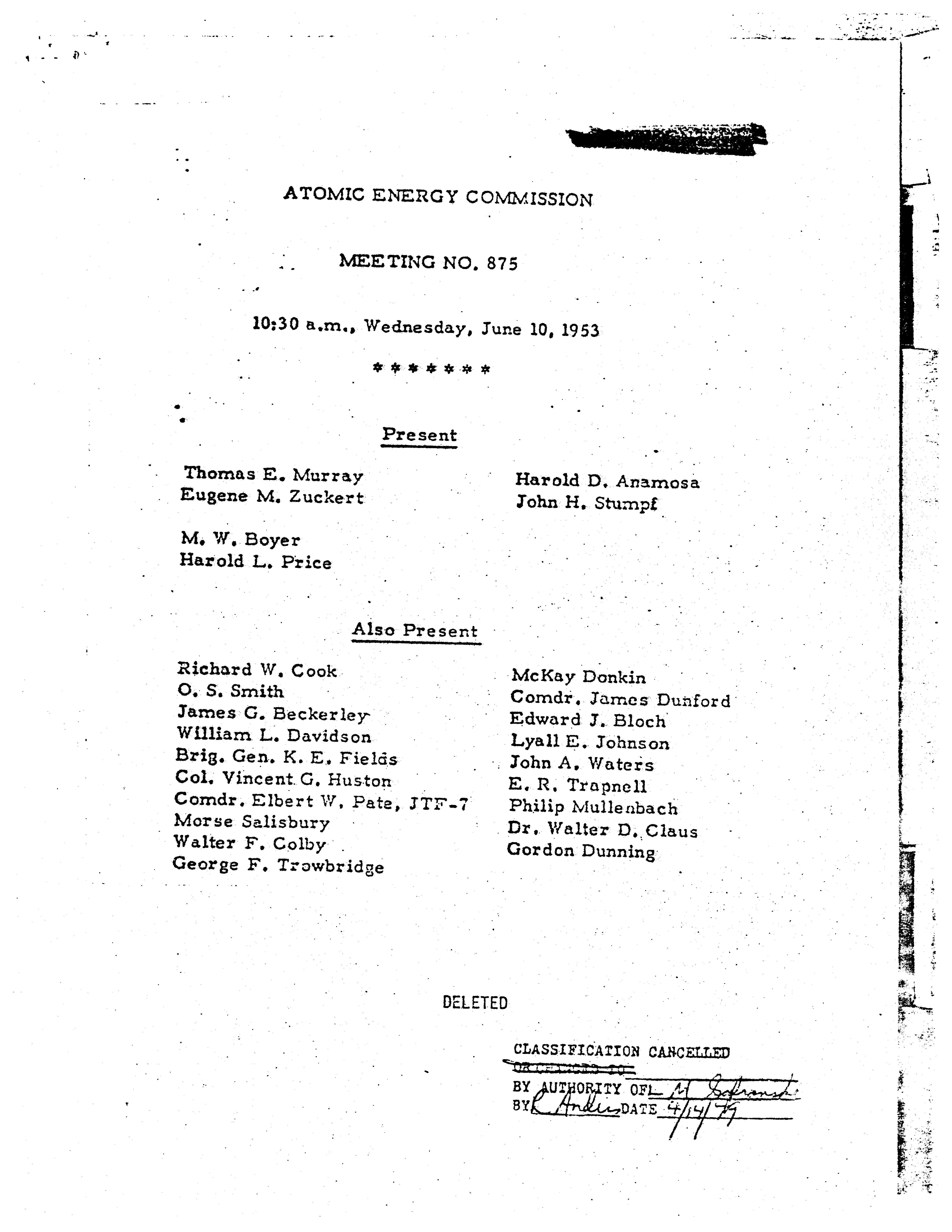 - Annotation: "Atomic energy commission;Meeting no. 875;10:30 a.m., Wednesday, June 10, 1953"