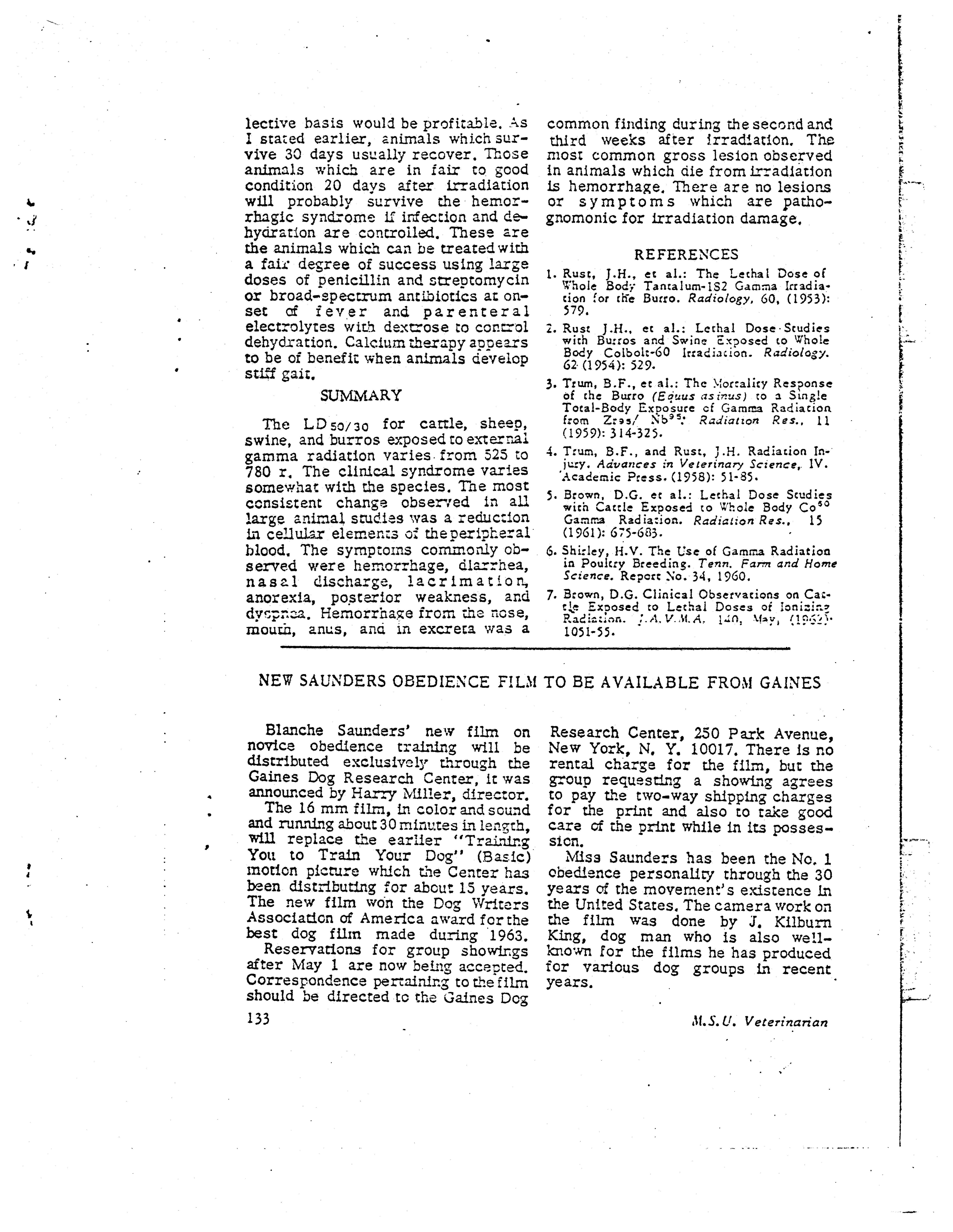 - "Veterinarian: The early effect of ionizing radiation on large animals", Dwight Ink Collection, Iowa State University Library Digital Collections