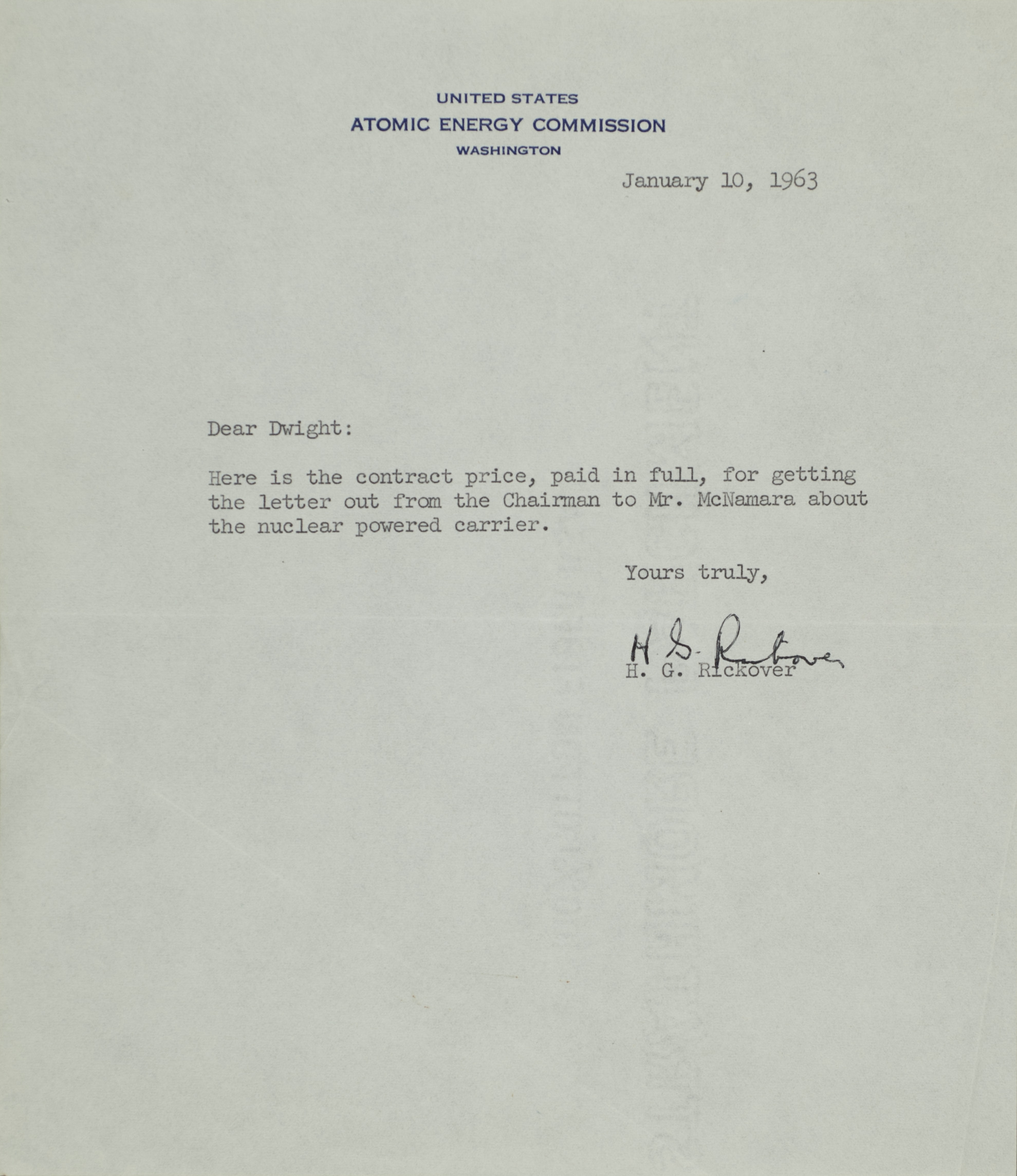 - H. G. Rickover letter to Dwight Ink, January 10, 1963