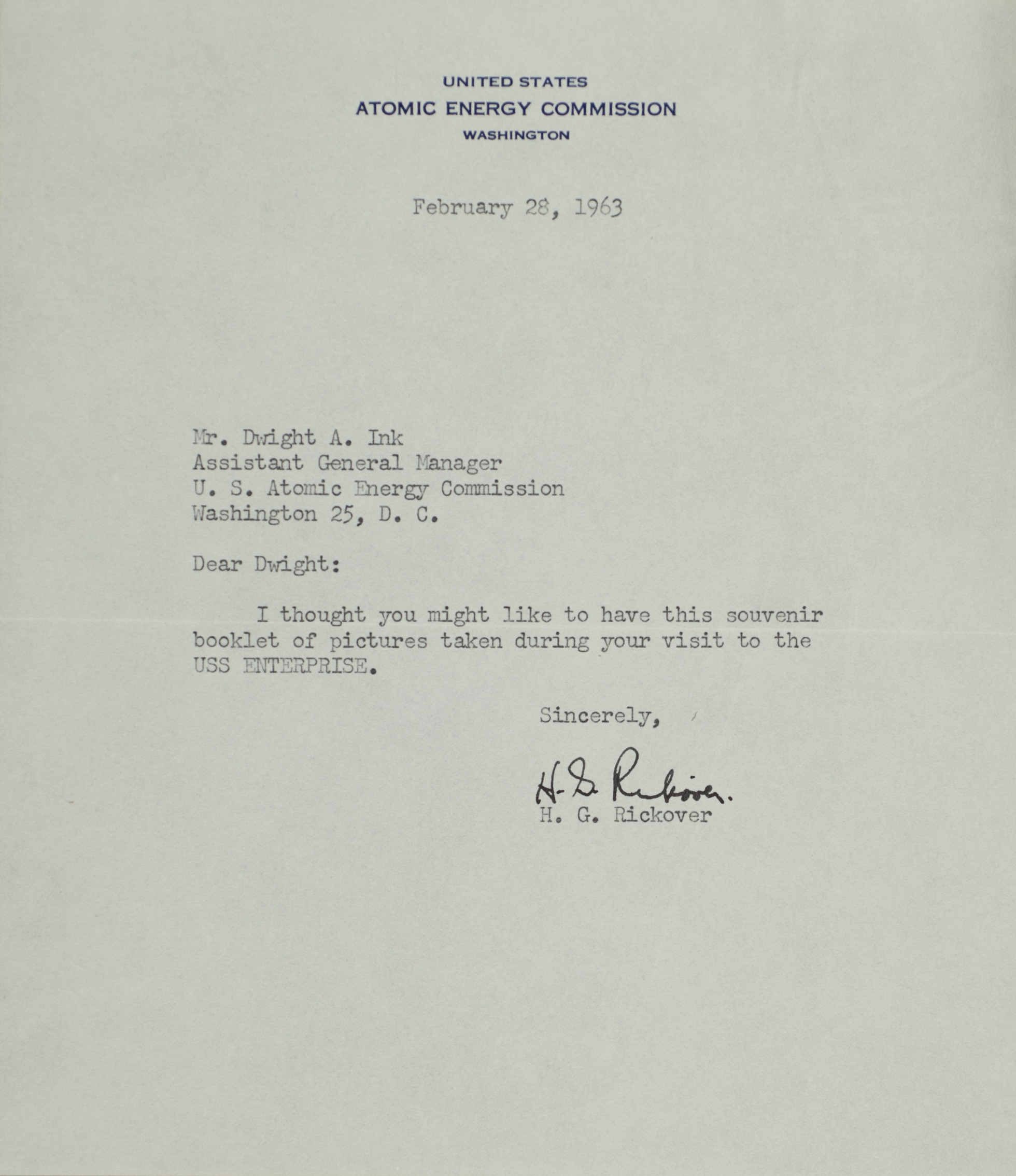 - H. G. Rickover letter to Dwight Ink, February 28, 1963
