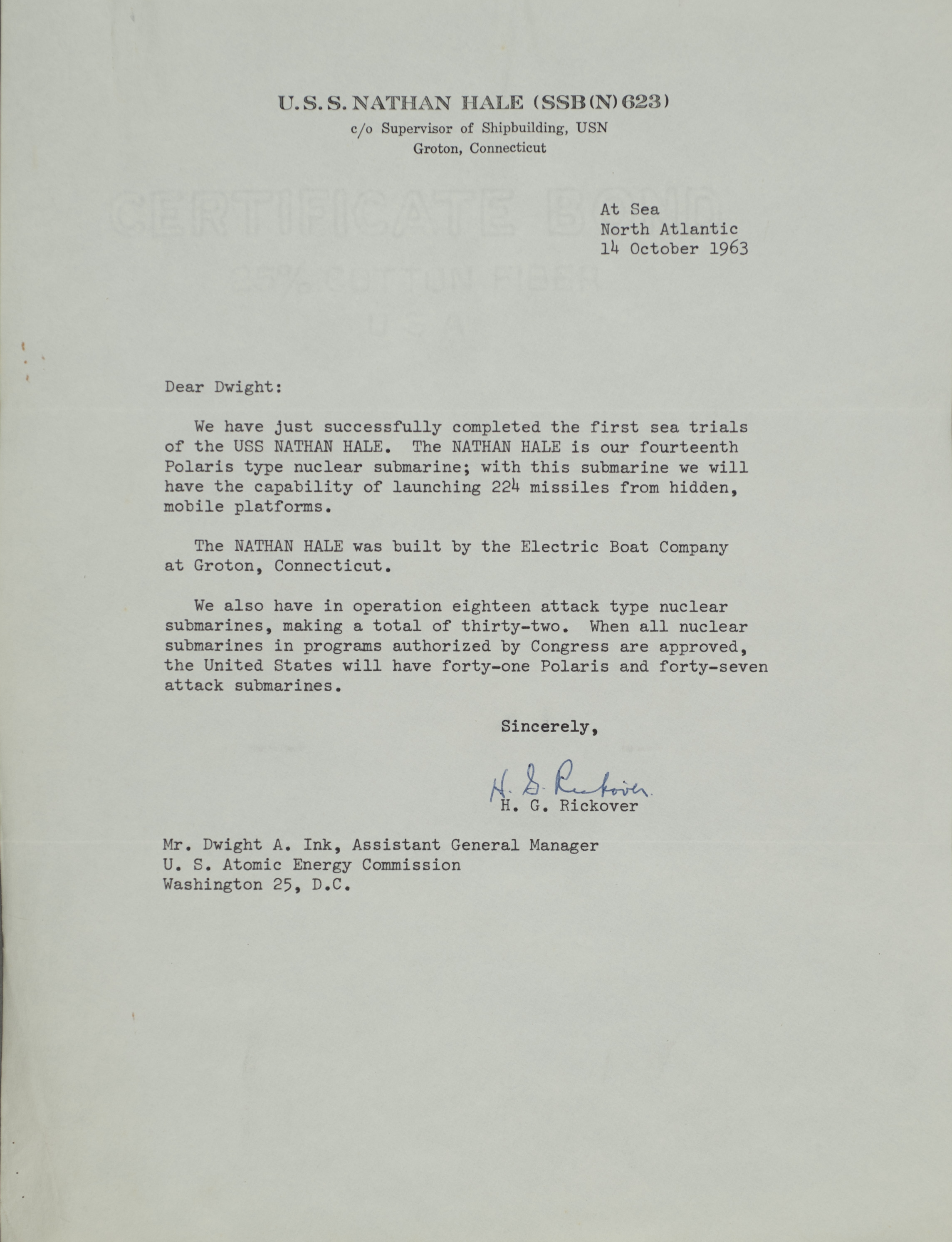 - H. G. Rickover letter to Dwight Ink, October 14, 1963