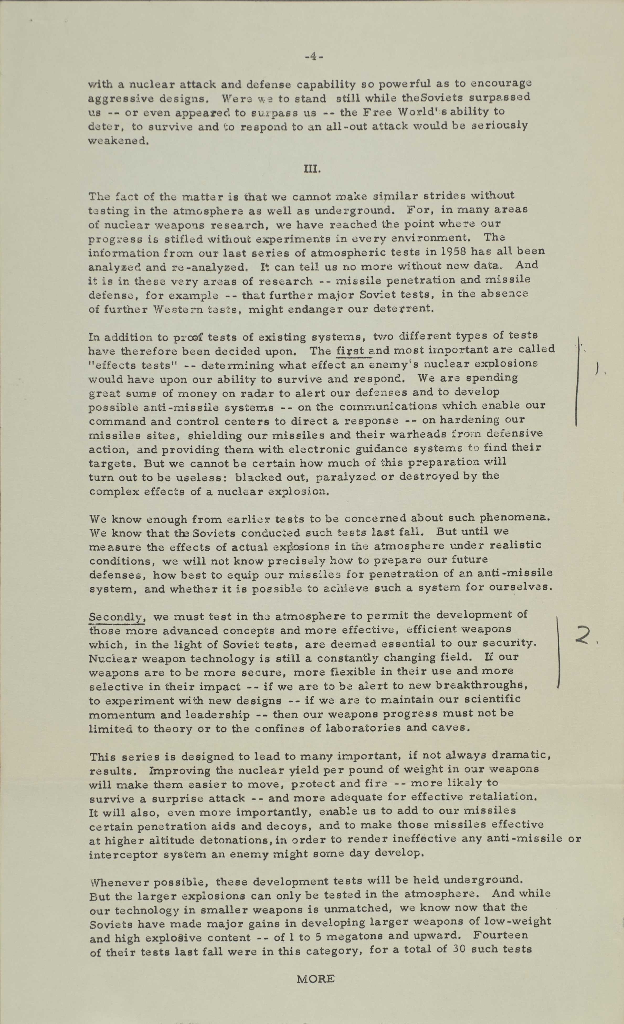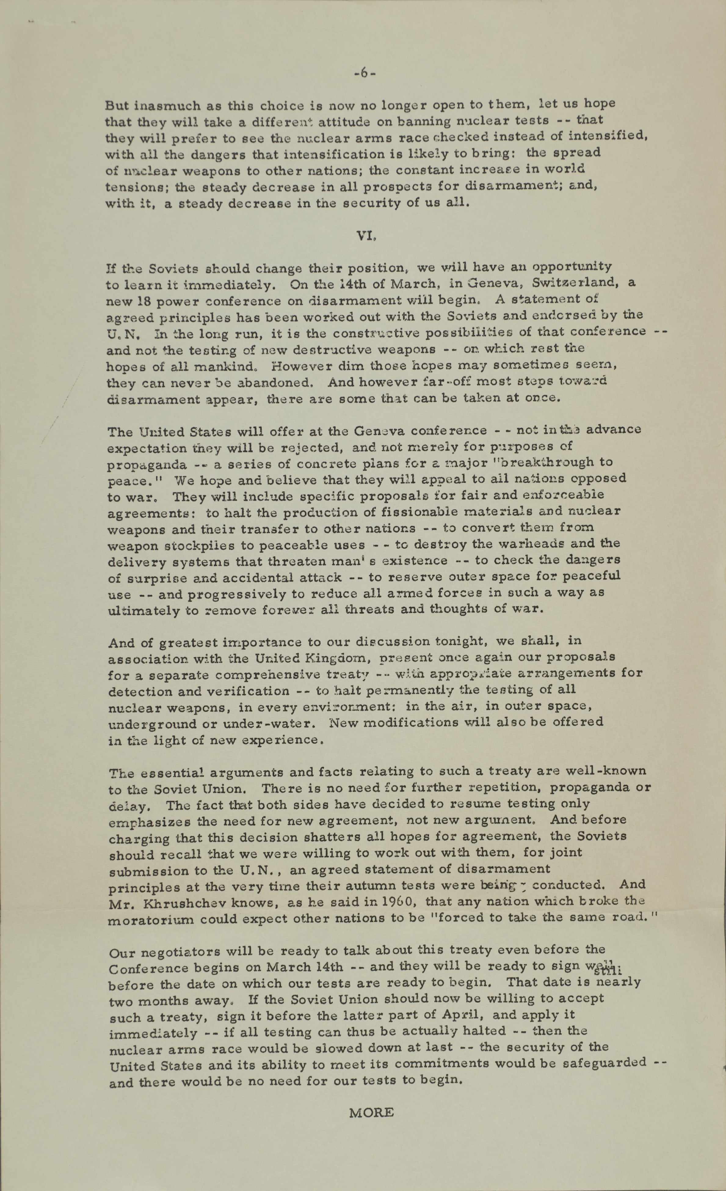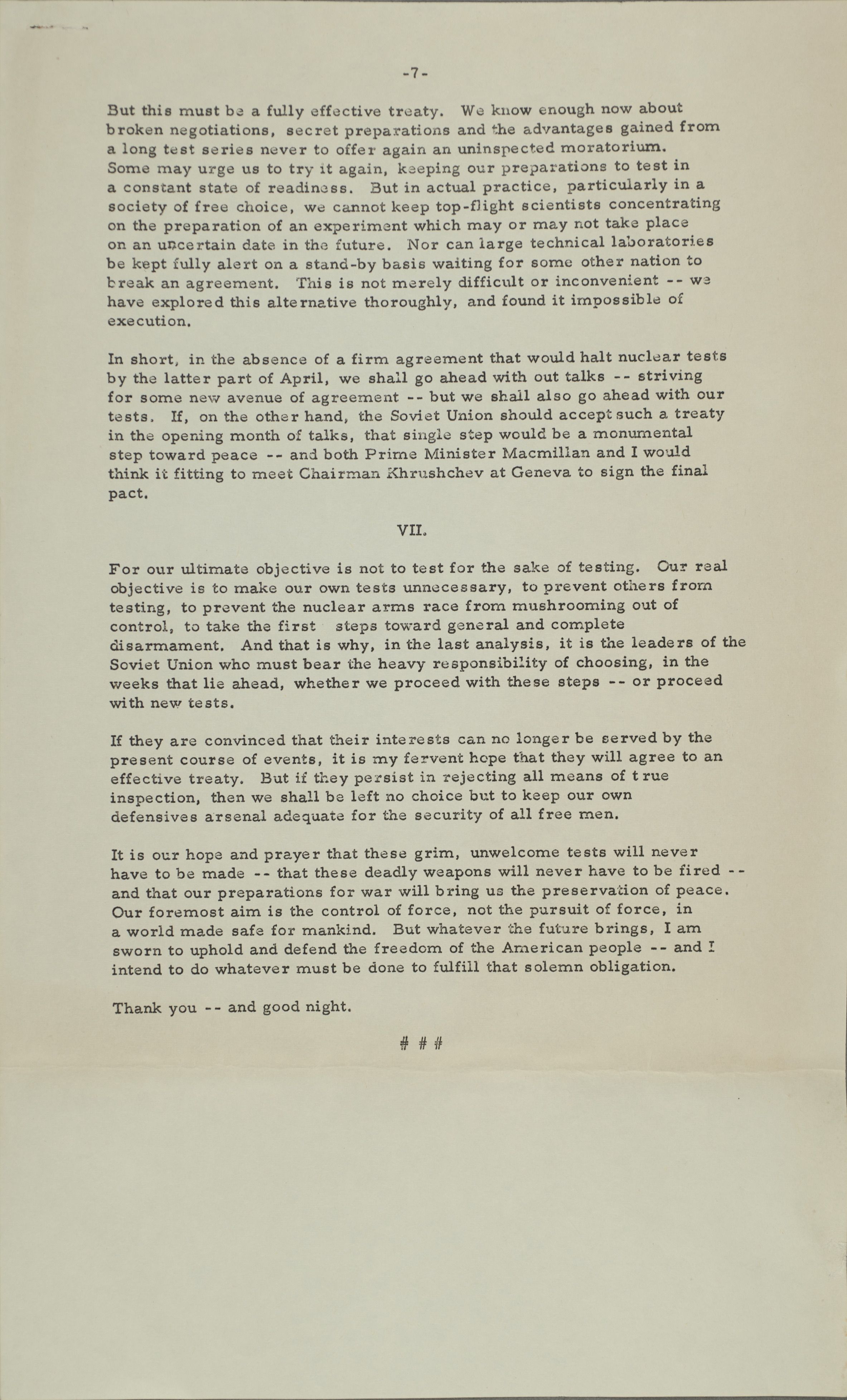 Text of address by the president, "Nuclear testing and disarmament," March 2, 1962 Item Info