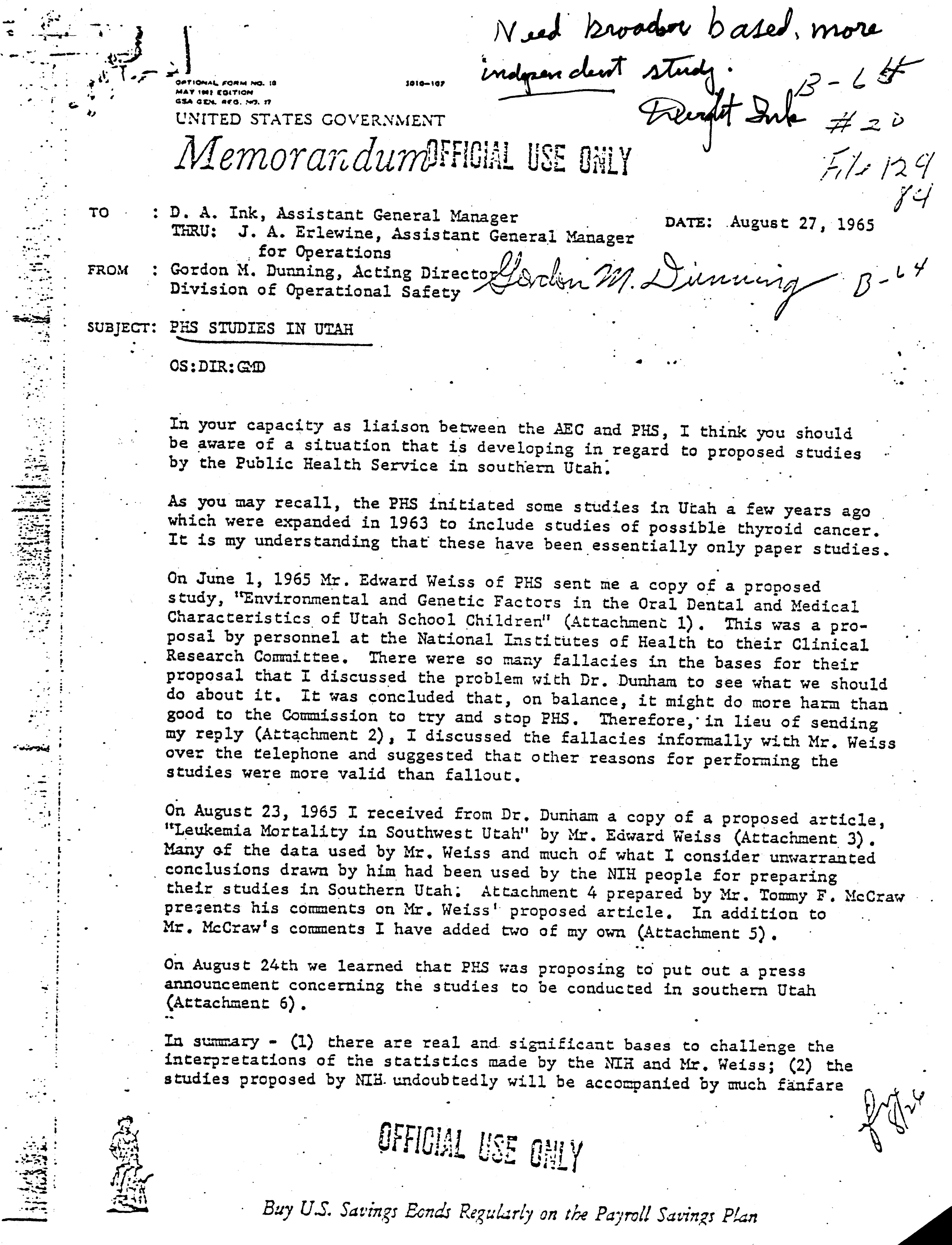 - Gordon M. Dunning memorandum to Dwight Ink, August 27, 1965