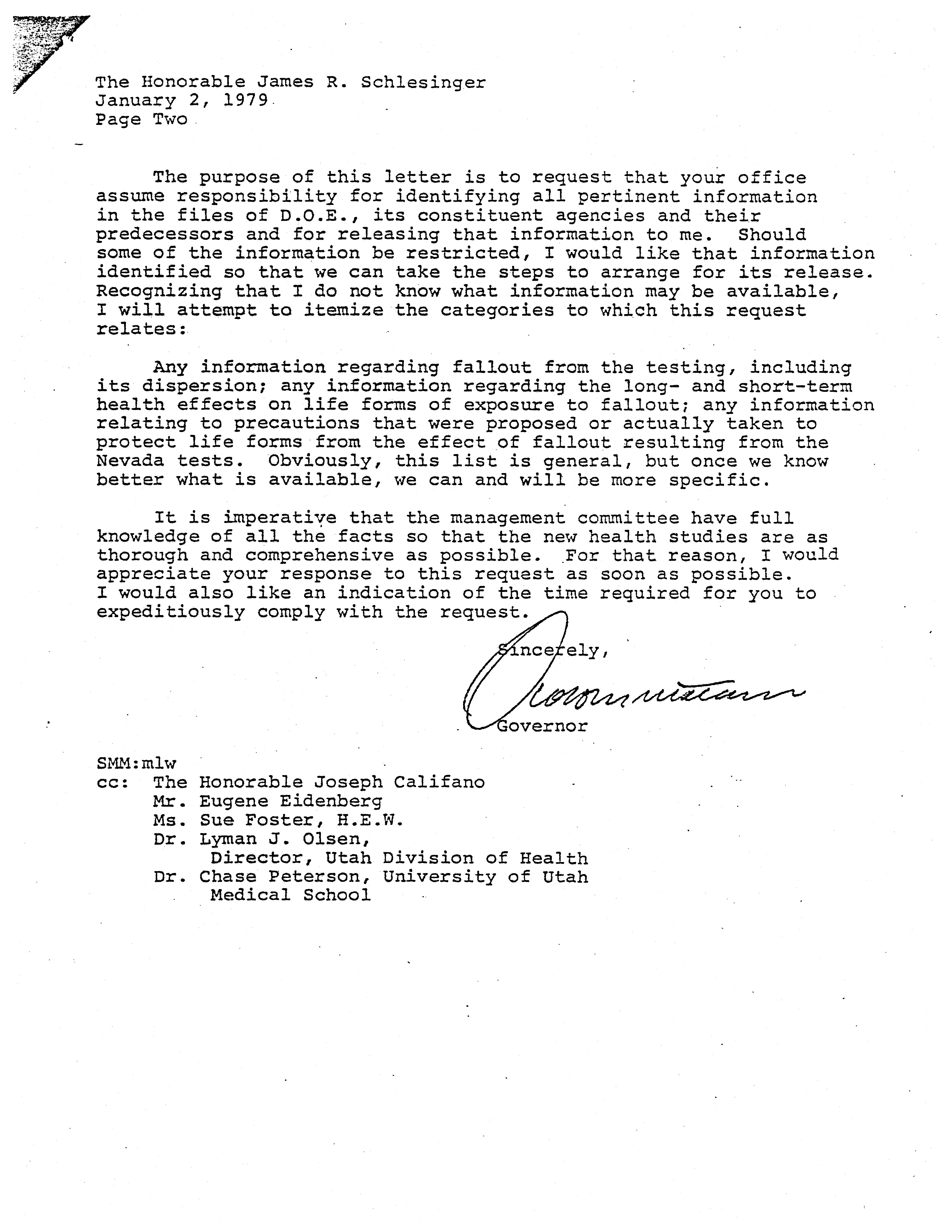 - Scott M. Matheson letter to Harold Brown, January 2, 1979
