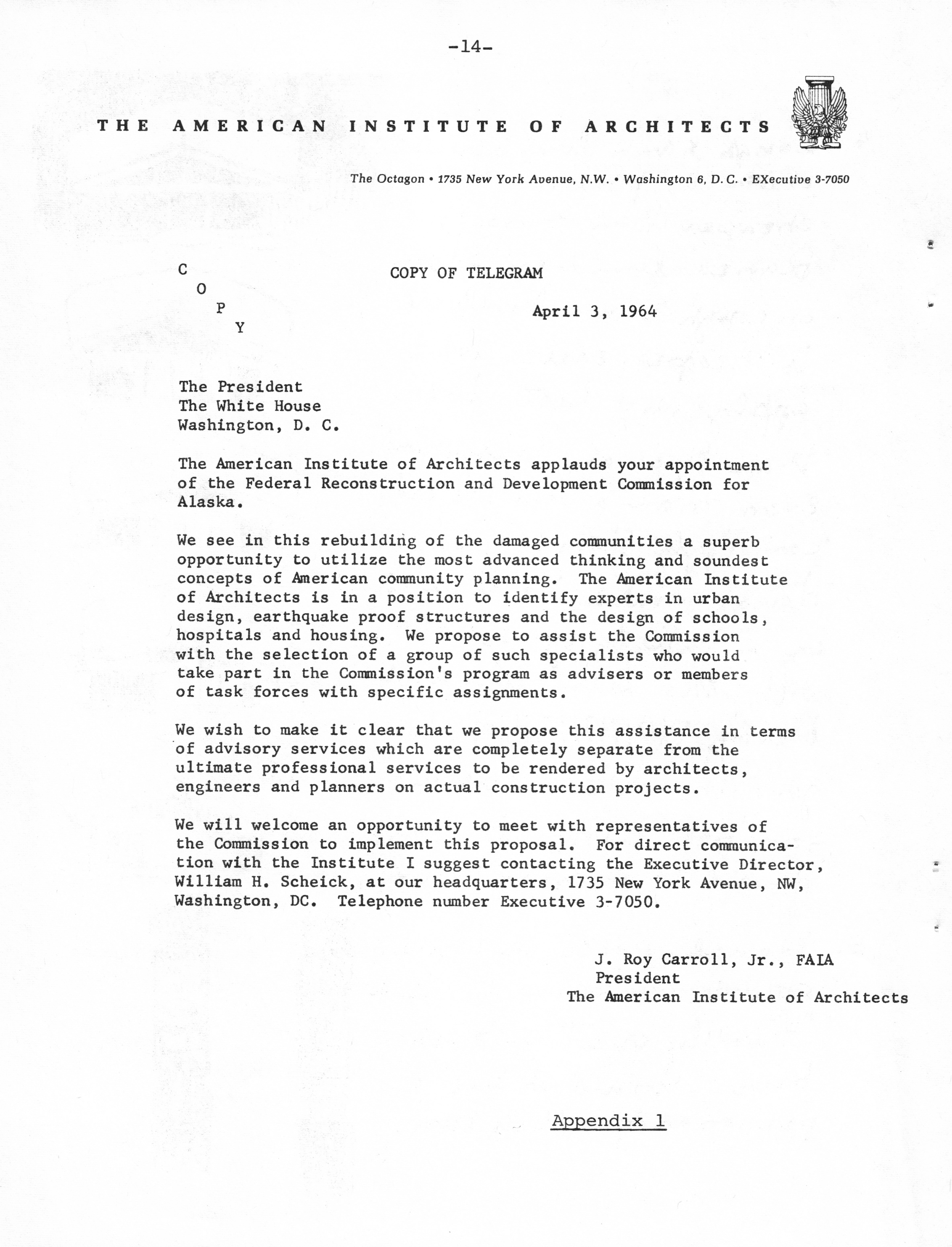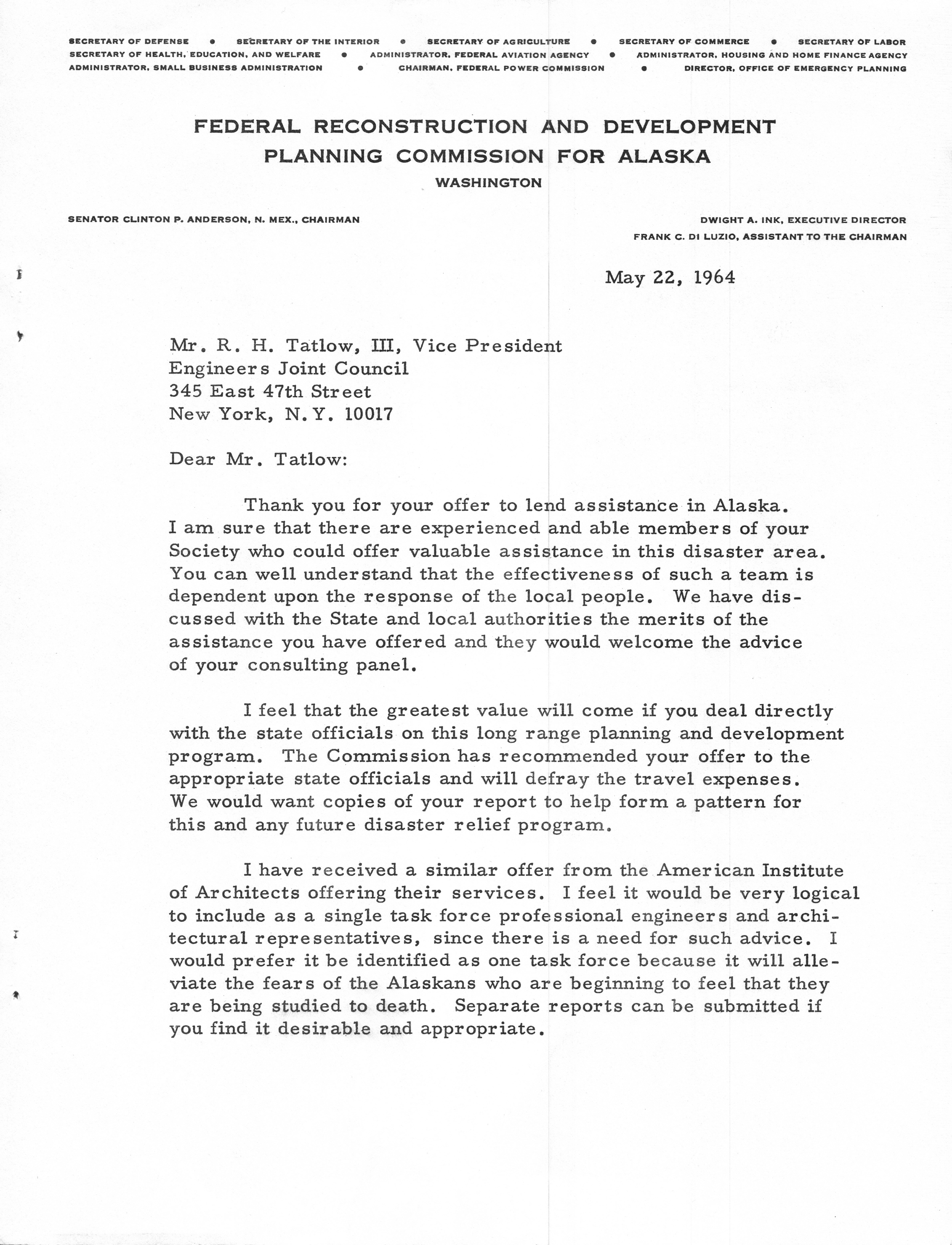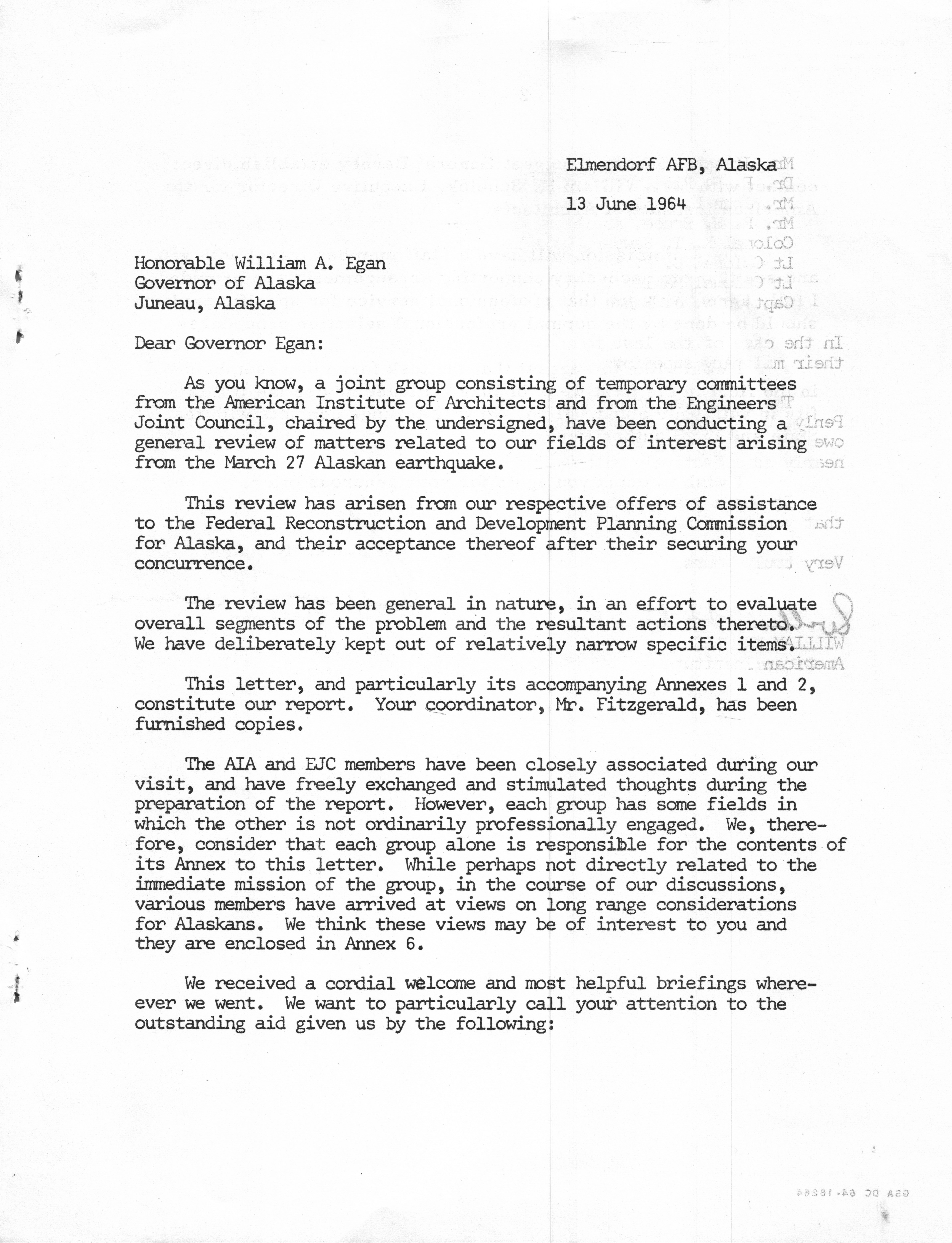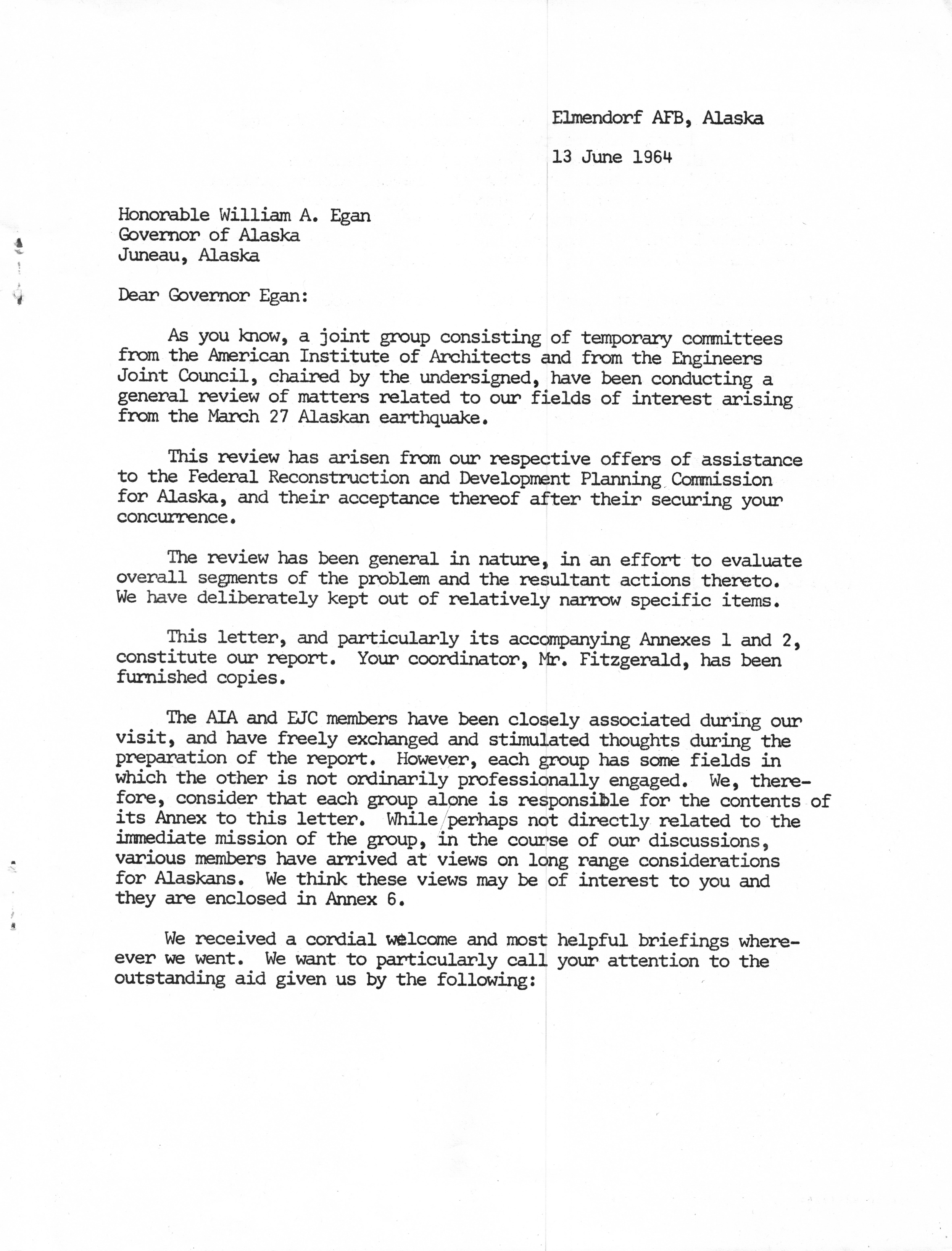 - Report of the American institute of architects and the engineers joint council committees on the restoration and development of Alaska, June 13, 1964