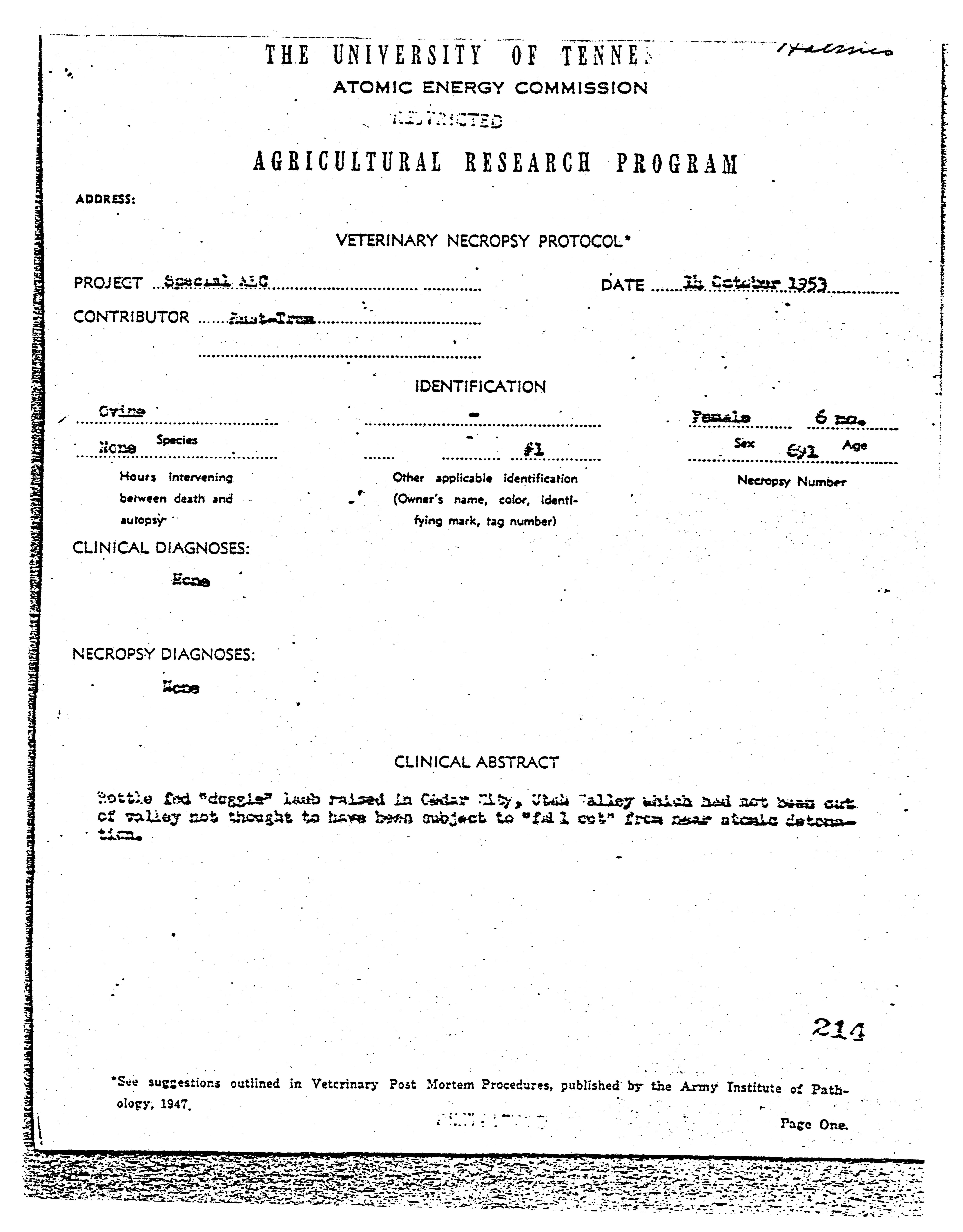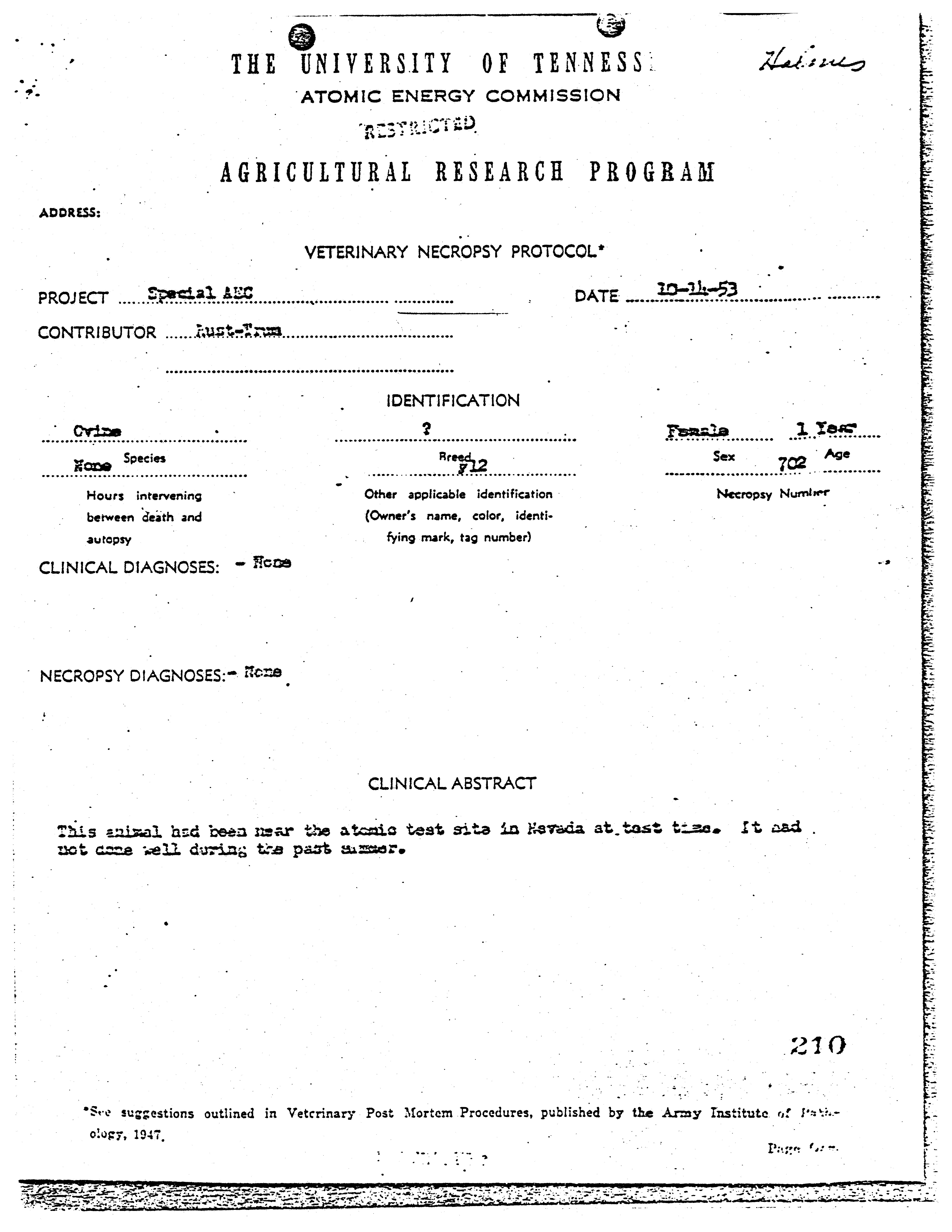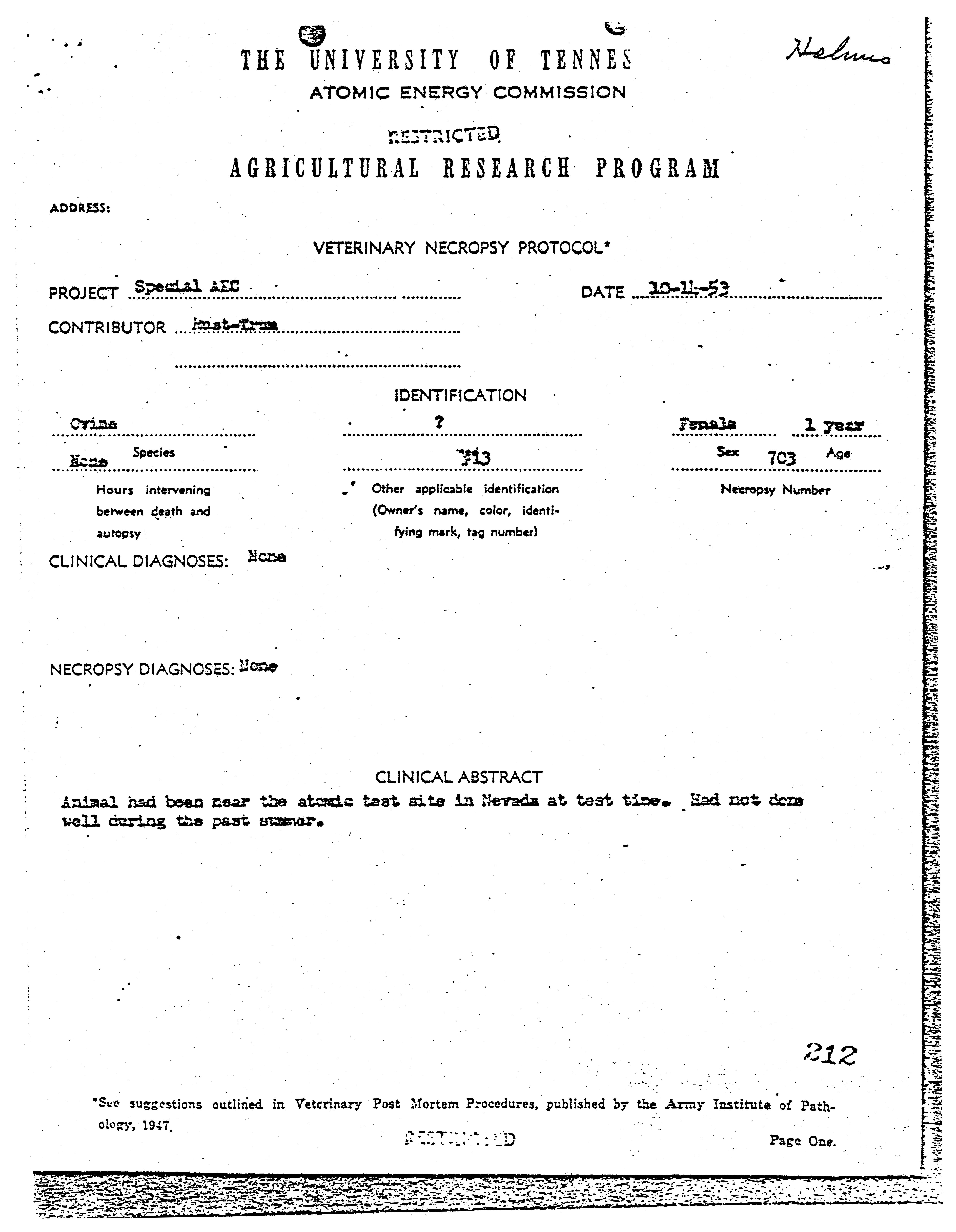 - "University of Tennessee Agricultural Research Program veterinary necropsy protocols (continued)", Dwight Ink Collection, Iowa State University Library Digital Collections