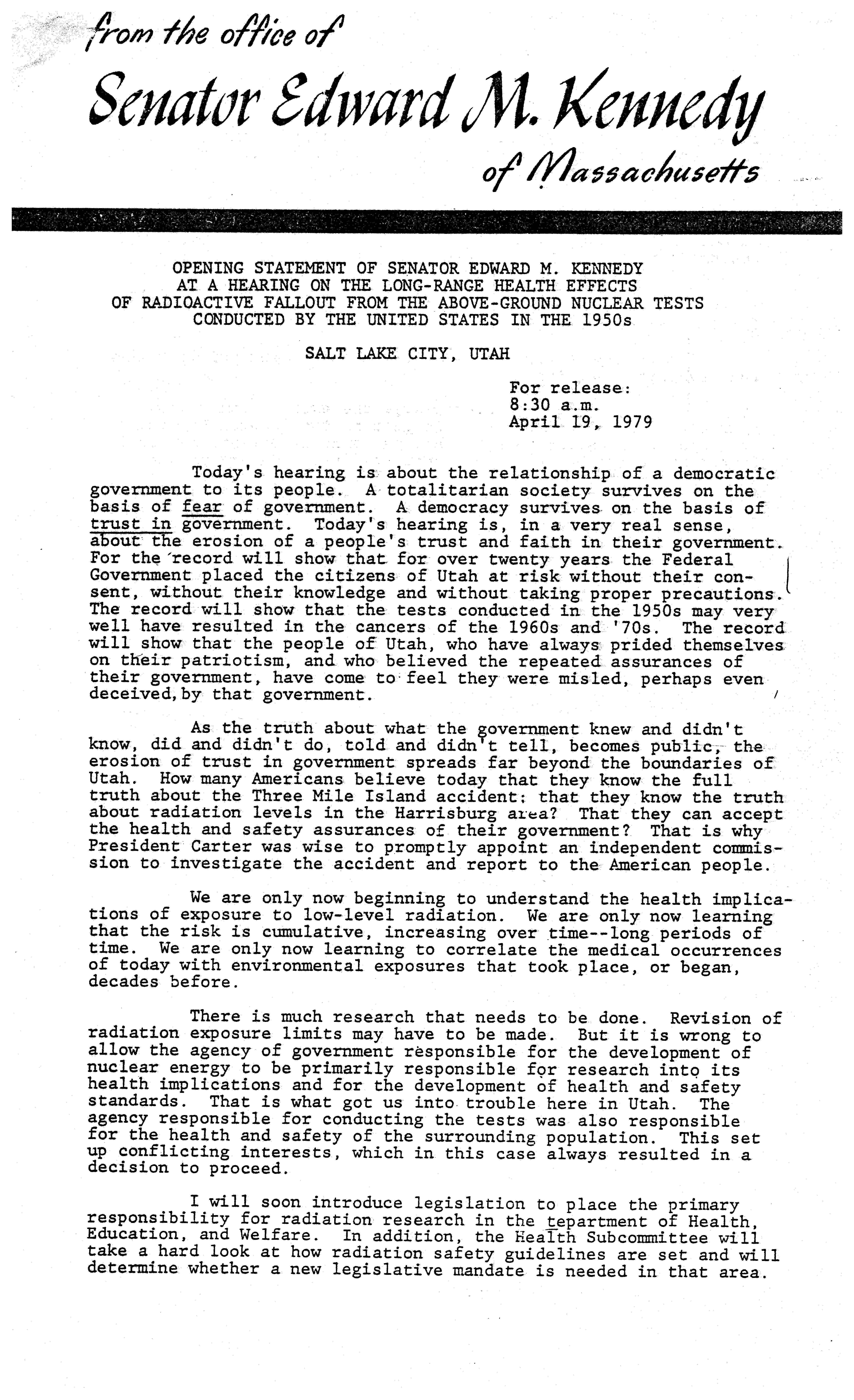 - Opening statement of senator Edward M. Kennedy at a hearing on the long-range health effects of radioactive fallout from the above-ground nuclear tests conducted by the United States in the 1950s, April 19, 1979