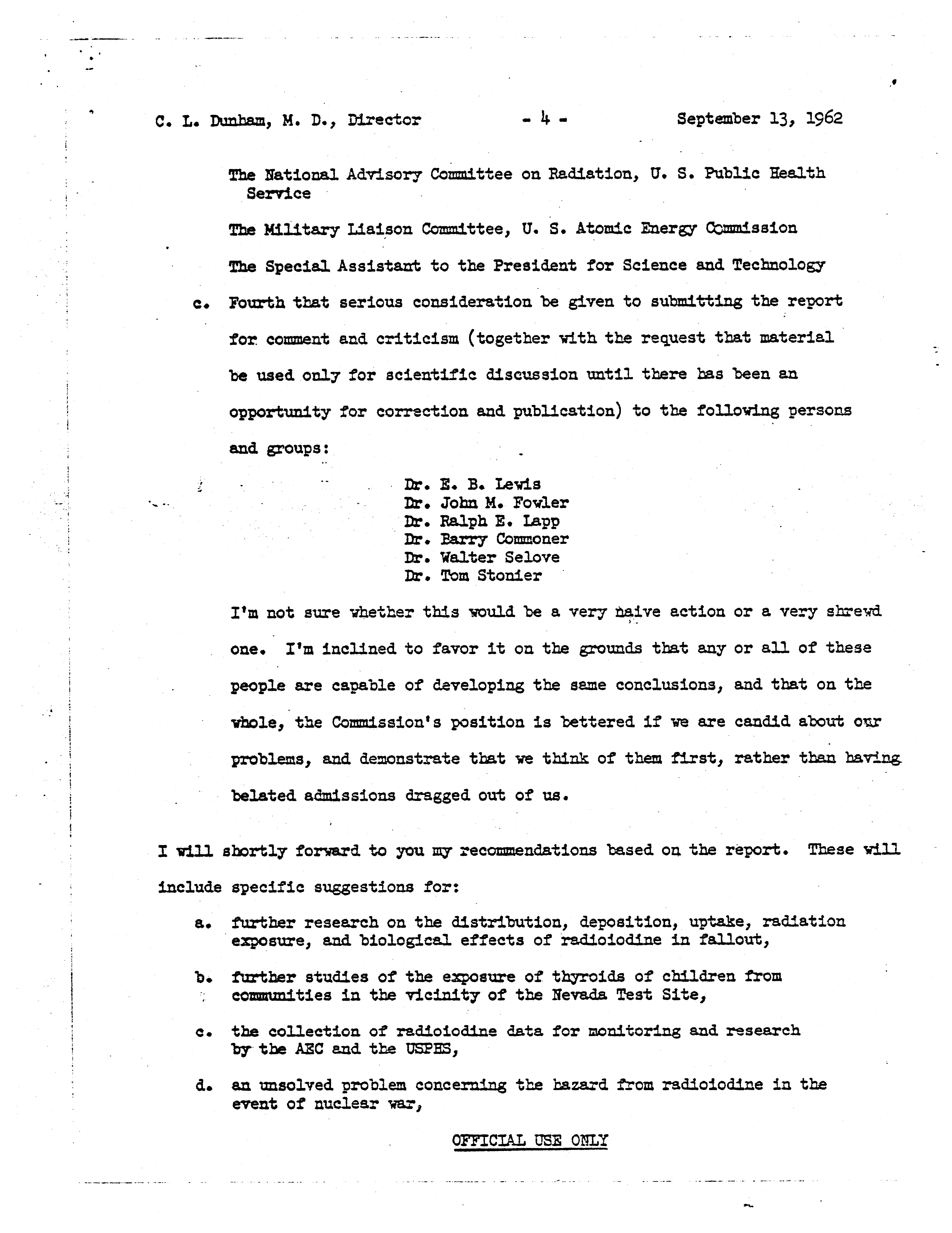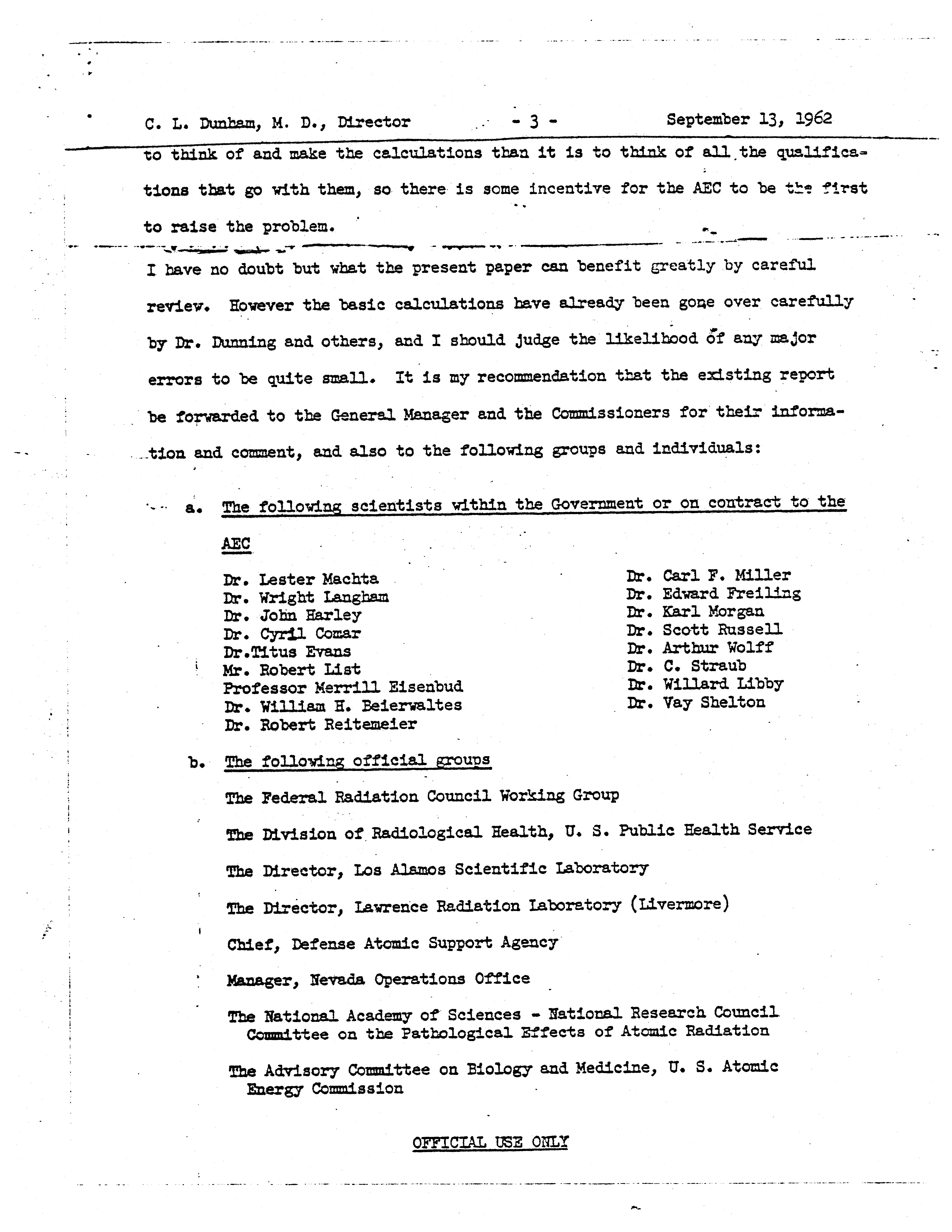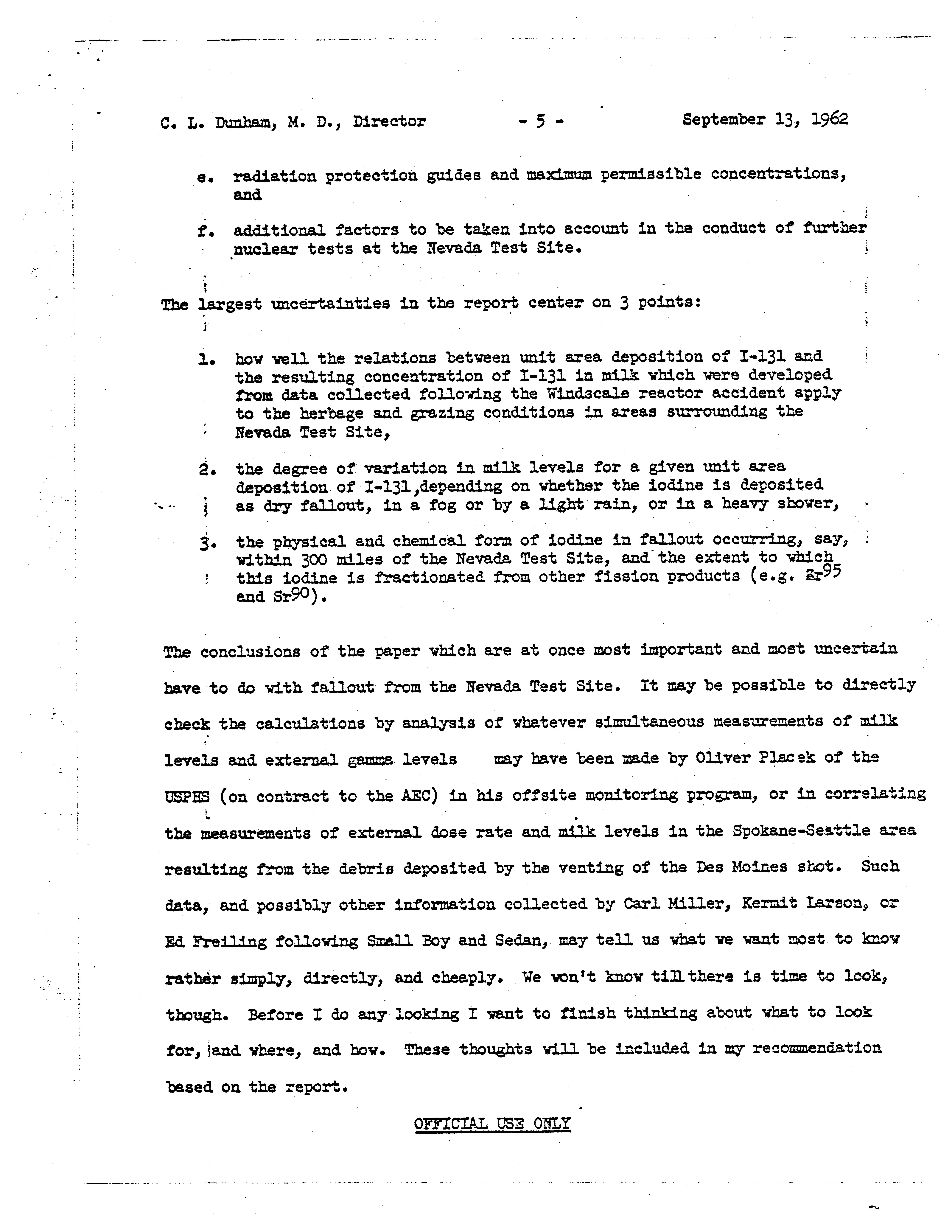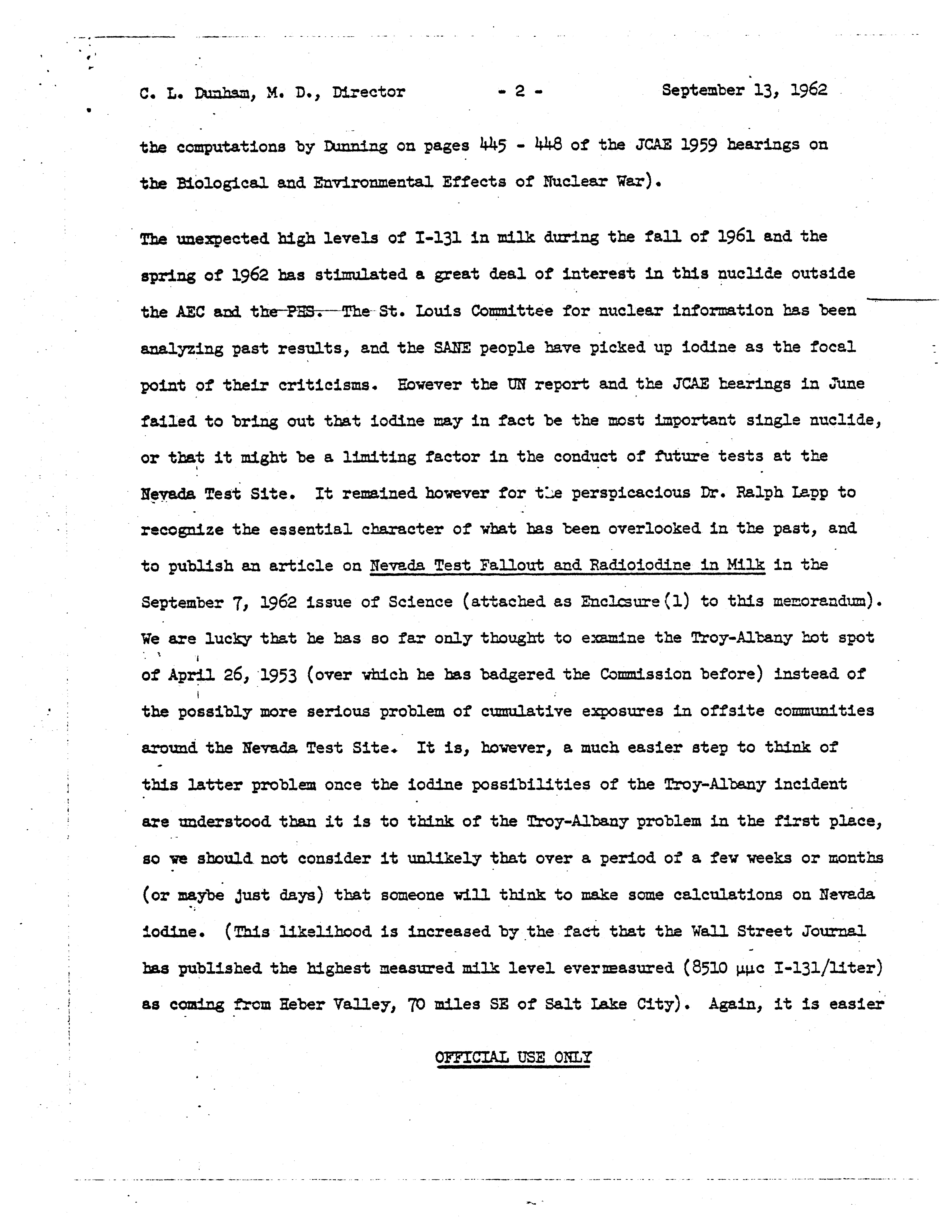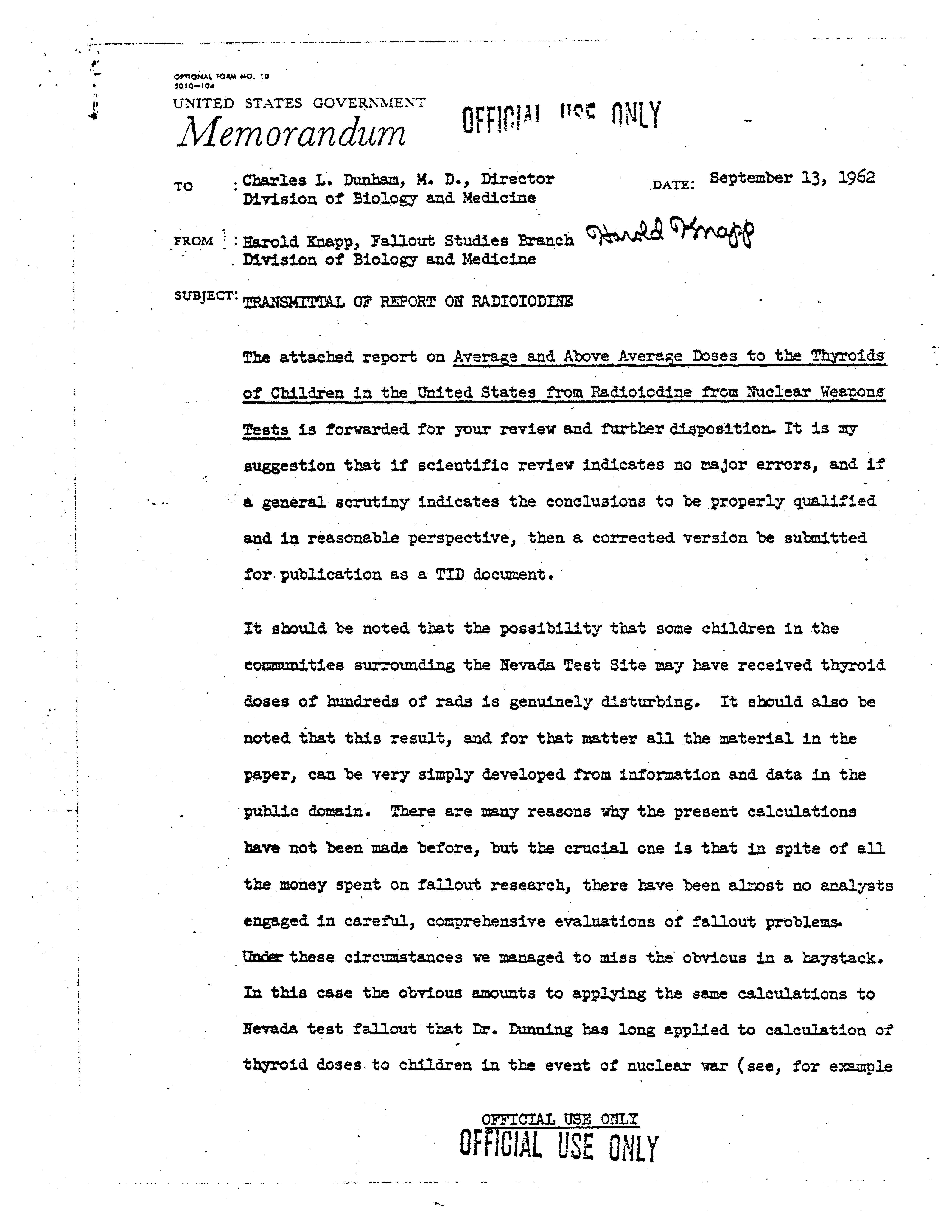- Harold Knapp memorandum to Charles L. Dunham, September 13, 1962